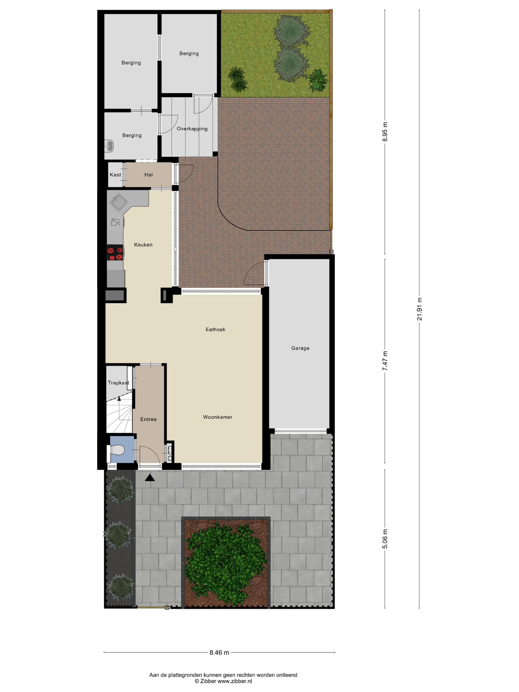 Begane grond: Via de entree kom je in de hal met toilet, trapopgang en toegang tot de woonkamer. De woonkamer is licht en ruim opgezet en biedt voldoende plaats voor een comfortabele zithoek. Aan de achterzijde bevindt zich de eethoek met directe verbinding naar de keuken. De keuken is praktisch ingericht, voorzien van diverse inbouwapparatuur en kijkt uit op de tuin. Vanuit de keuken kom je in een achterhal die op zijn beurt weer toegang biedt tot de twee bergingen achter het huis. De aangebouwde garage is vanuit de tuin en vanaf de oprit te bereiken – ideaal voor opslag, hobby’s of natuurlijk het stallen van de auto.