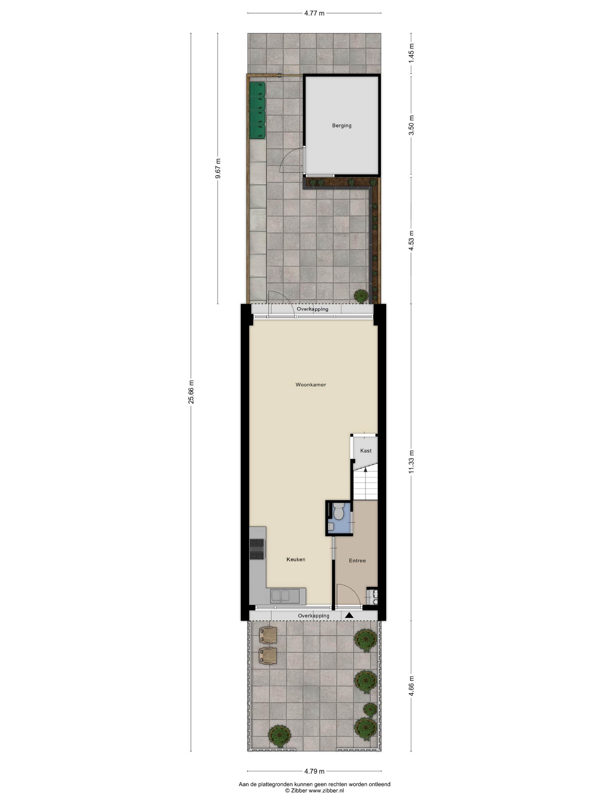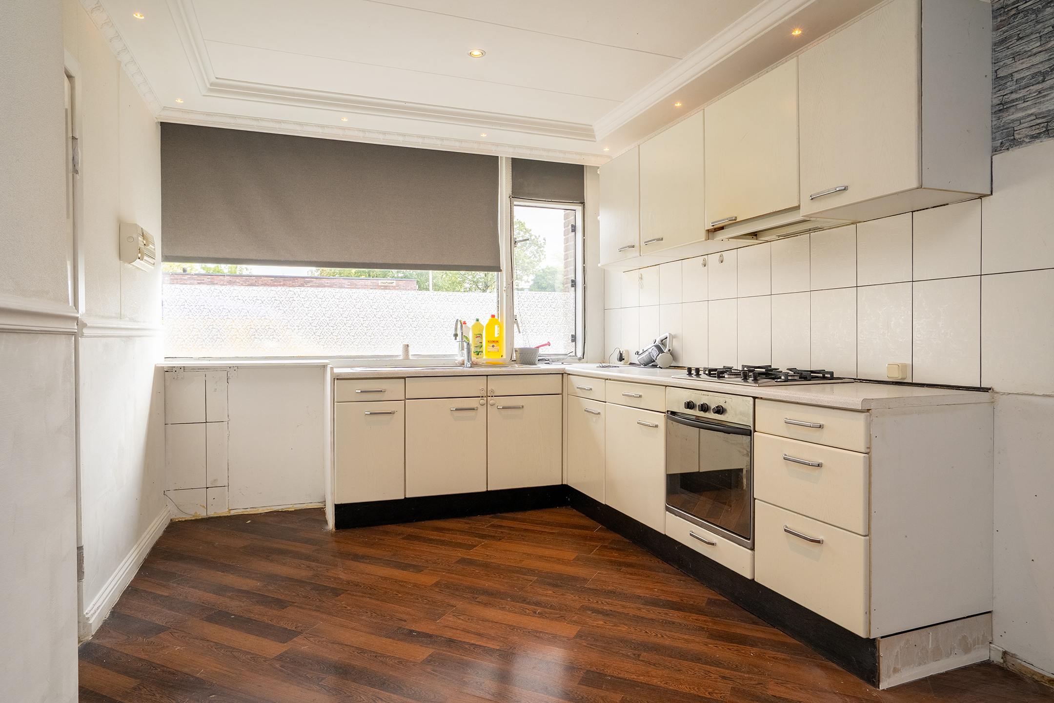 Begane grond: Entree, hal met trapopgang en toilet, keuken met hoekopstelling en tuingerichte woonkamer.