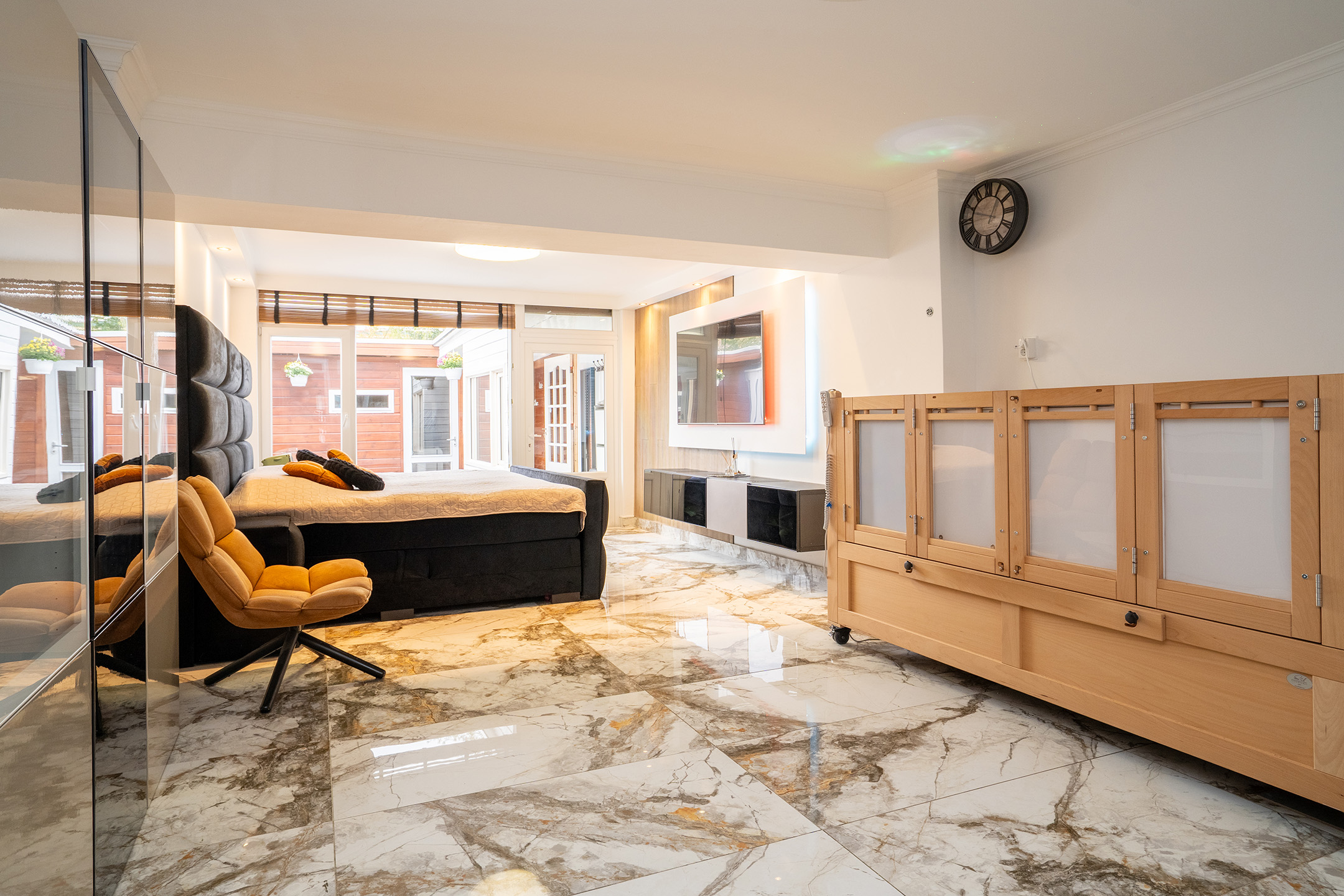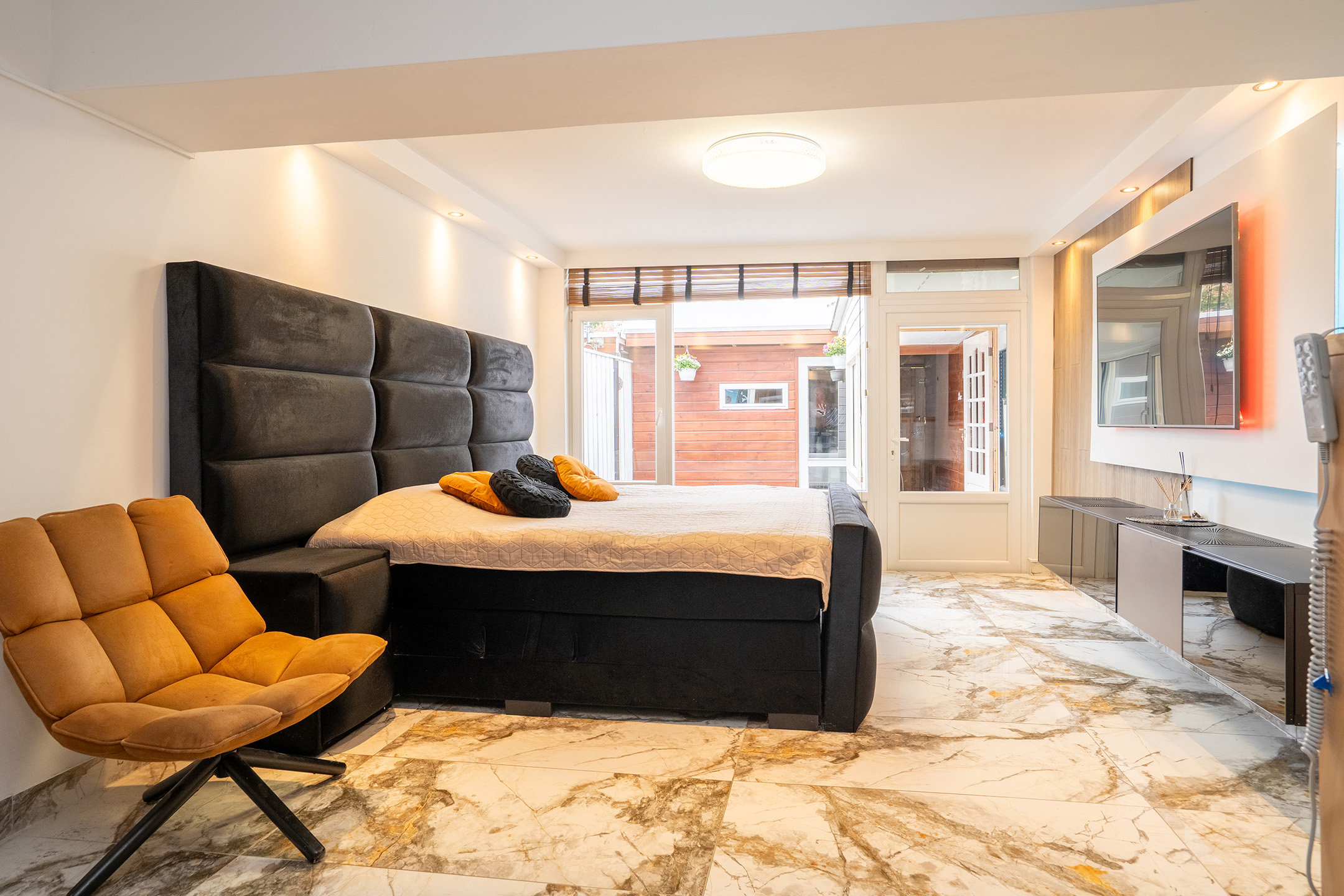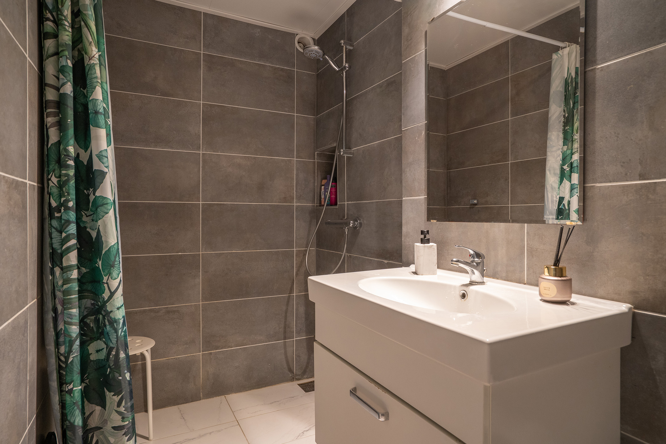 Begane grond: Via de overdekte entree stap je binnen in de hal met toegang tot de grote woon-slaapkamer en eerste verdieping. Vanuit de woon-slaapkamer is de keuken gelegen welke is voorzien van een nette opstelling met inbouwapparatuur. De aangrenzende badkamer is volledig betegeld en uitgerust met een douche, wastafel en toilet. Aan de achterzijde bevindt zich een ruime kamer met uitzicht op de tuin. Vanuit deze kamer bereik je via een hal de overkapping, het achtergelegen terras en de berging — ideaal voor fietsen of extra opslag.