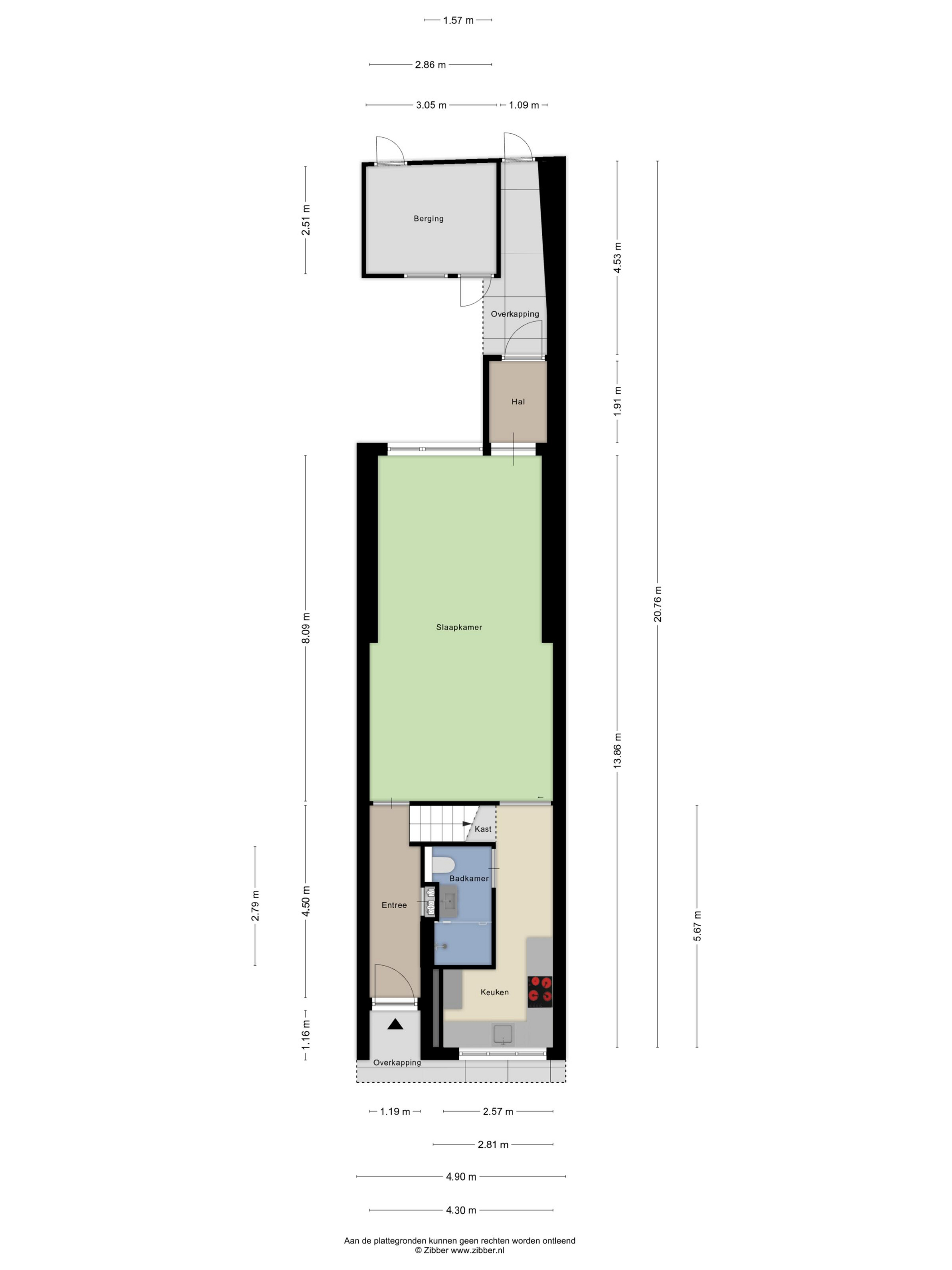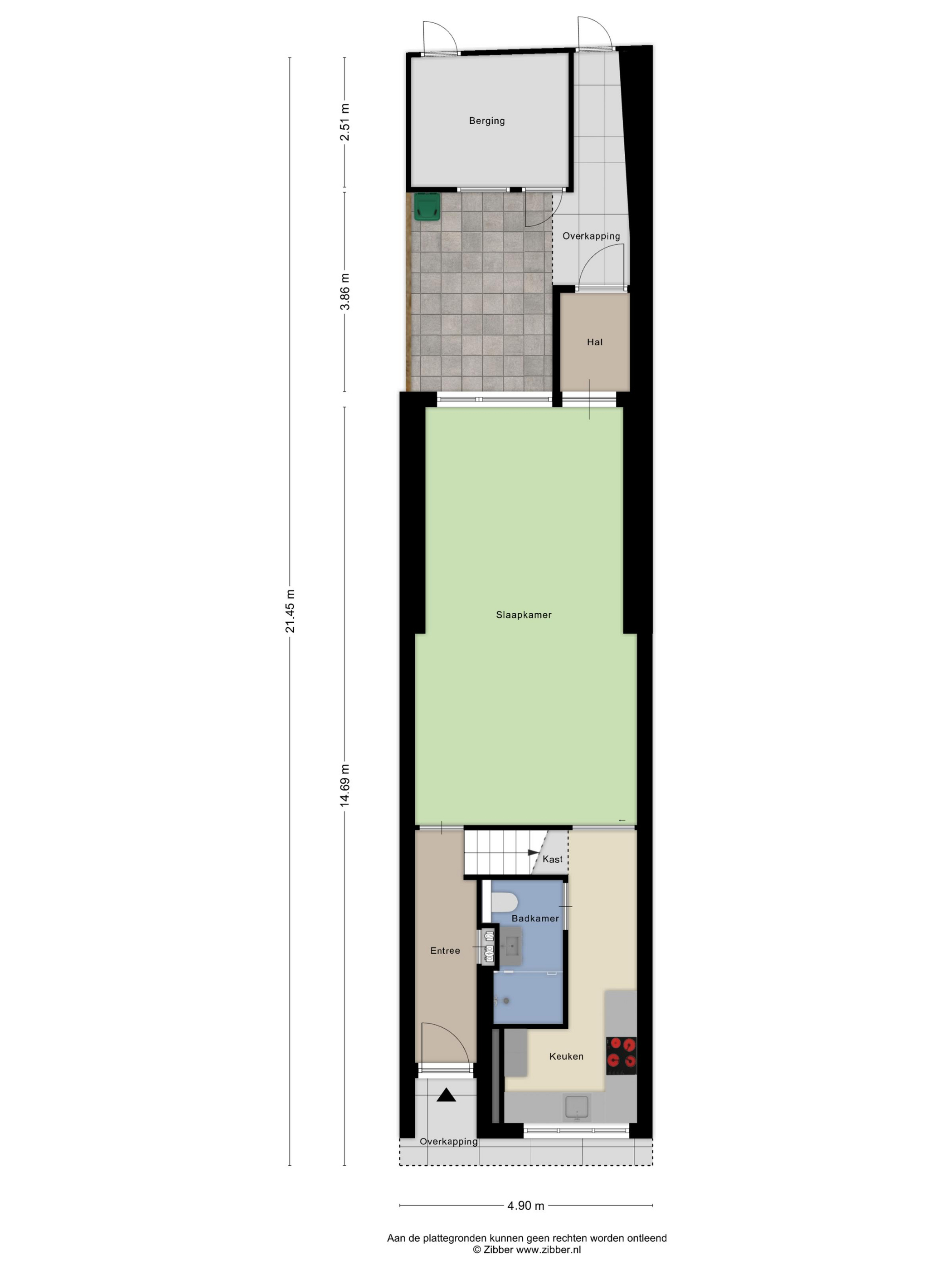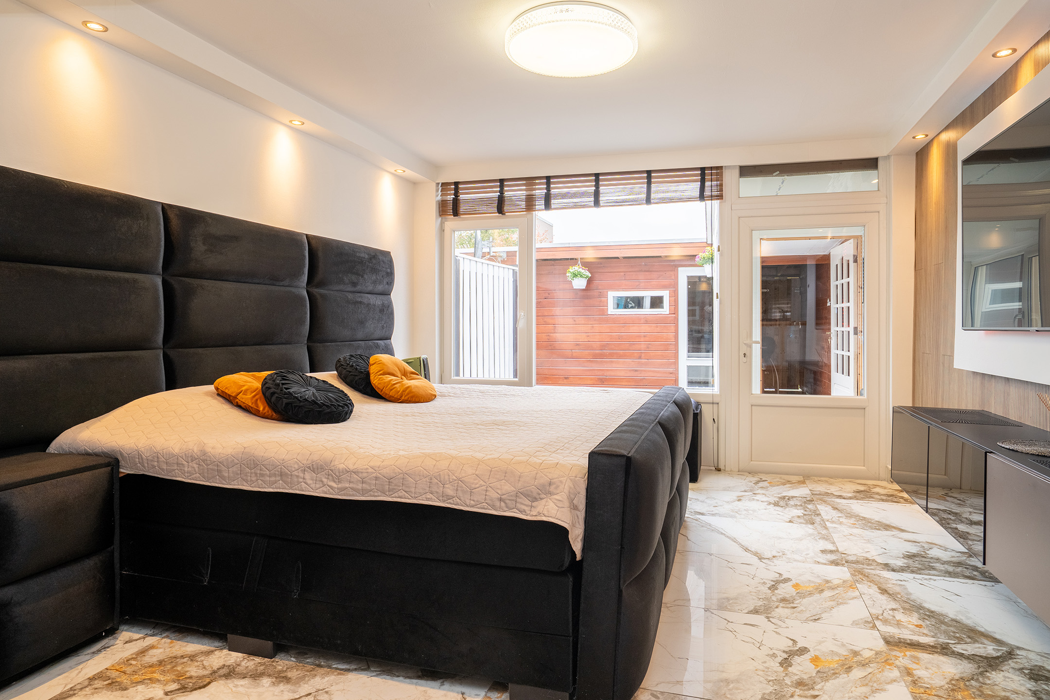 Begane grond: Via de overdekte entree stap je binnen in de hal met toegang tot de grote woon-slaapkamer en eerste verdieping. Vanuit de woon-slaapkamer is de keuken gelegen welke is voorzien van een nette opstelling met inbouwapparatuur. De aangrenzende badkamer is volledig betegeld en uitgerust met een douche, wastafel en toilet. Aan de achterzijde bevindt zich een ruime kamer met uitzicht op de tuin. Vanuit deze kamer bereik je via een hal de overkapping, het achtergelegen terras en de berging — ideaal voor fietsen of extra opslag.
