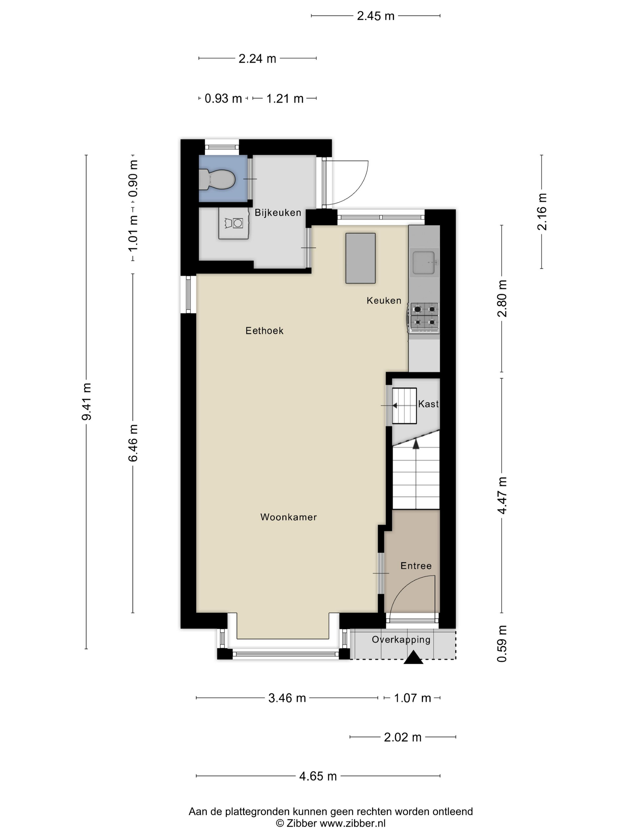 Begane grond: Entree, hal met trapopgang, woonkamer met erker, open keuken, bijkeuken en toilet.