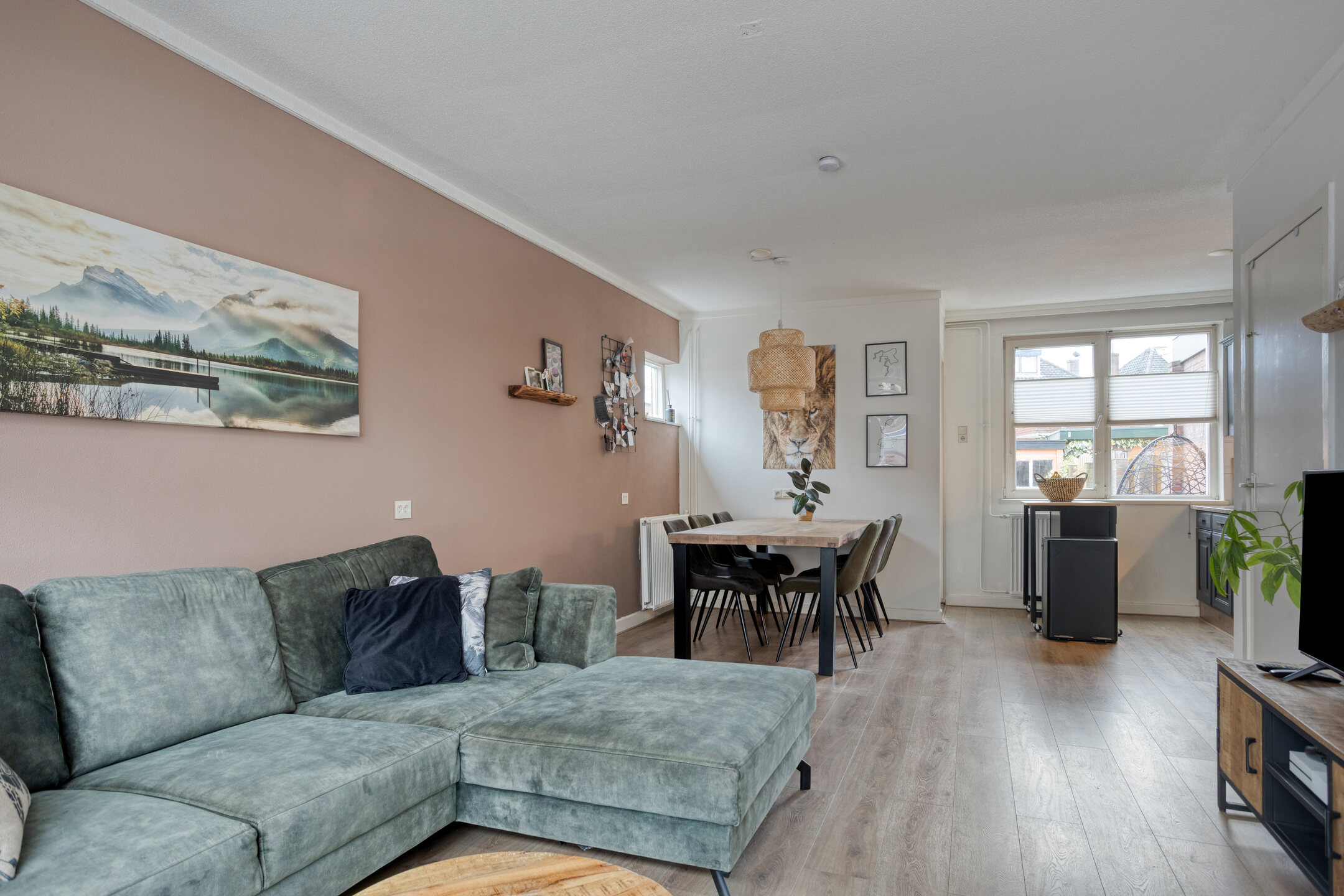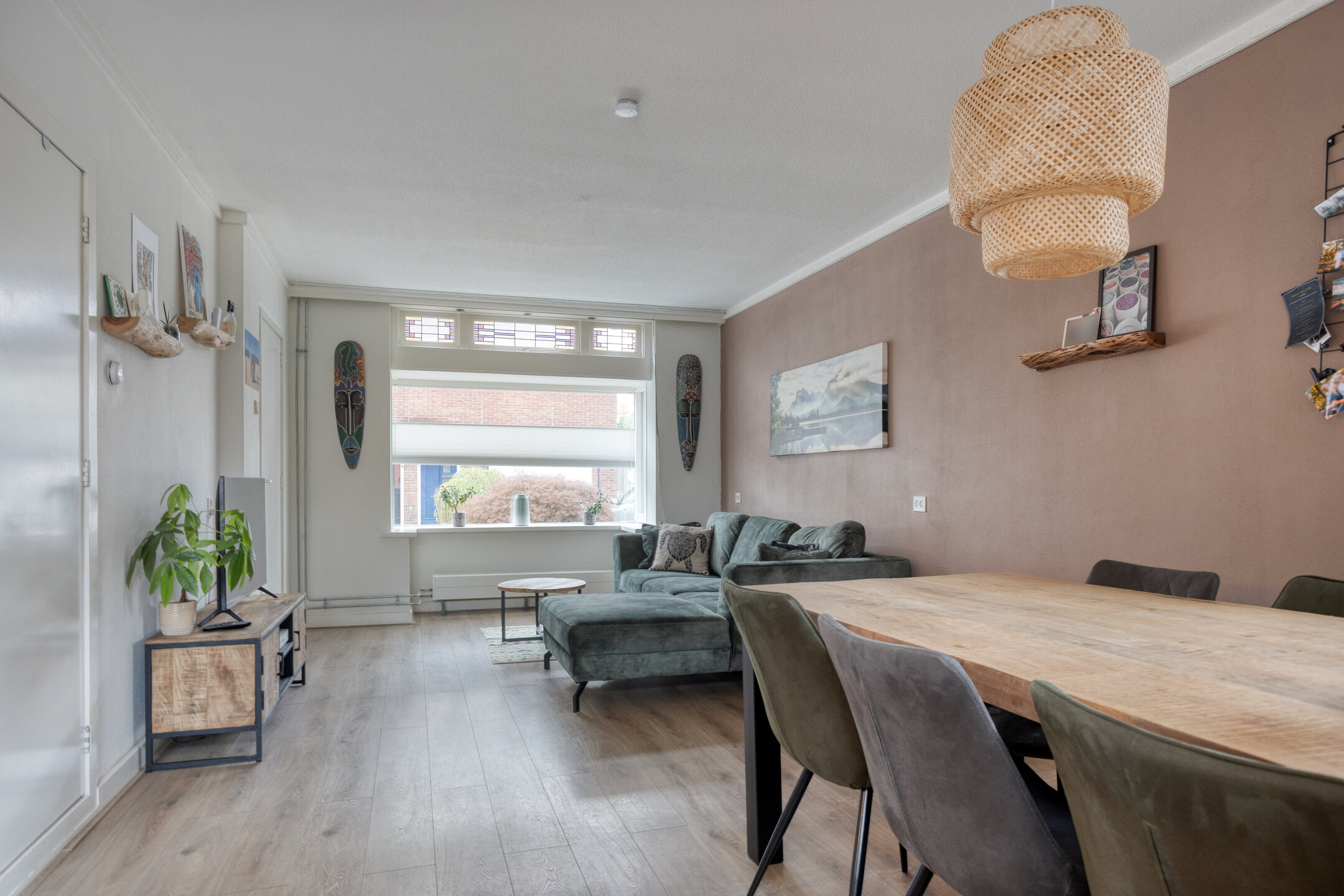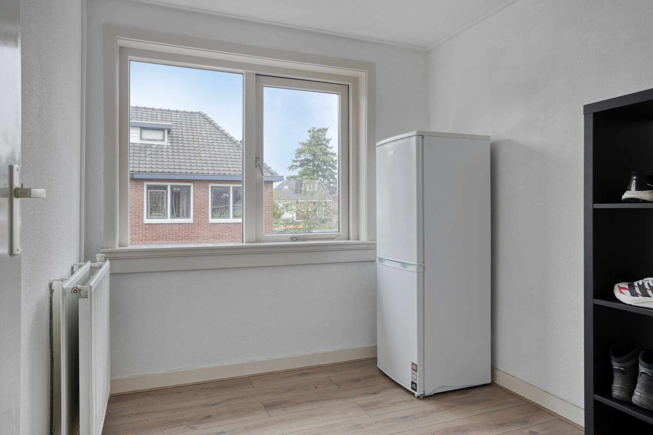 Binnen vind je verrassend veel ruimte. De woonkamer is licht en sfeervol, met genoeg plek voor een grote eettafel of een fijne zithoek. De uitbouw aan de achterzijde biedt extra praktische ruimte voor de wasmachine en droger, en via de achterdeur loop je zo de tuin in.