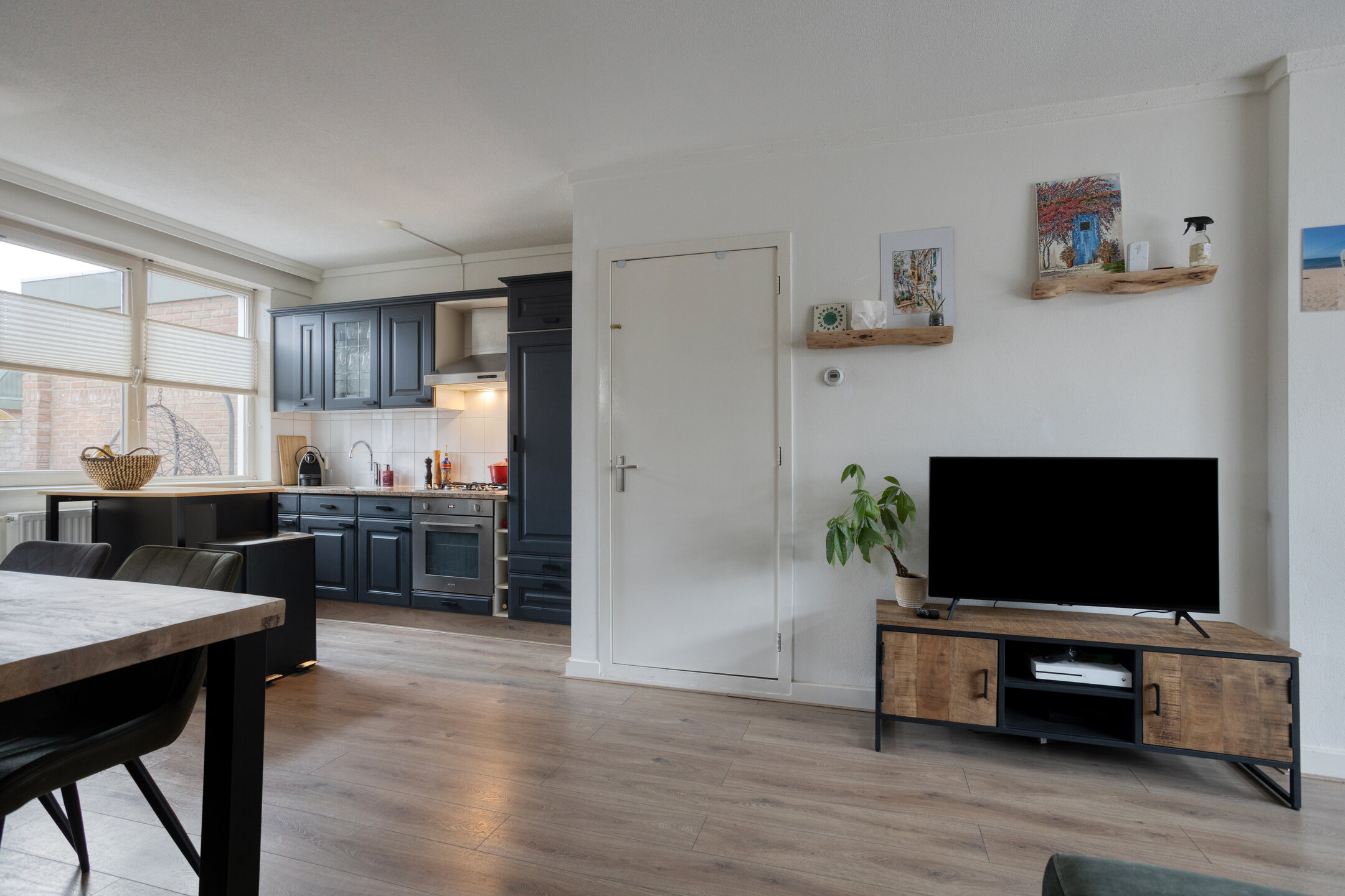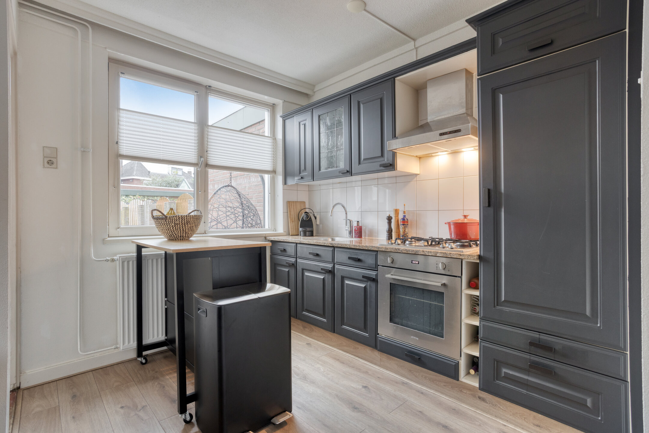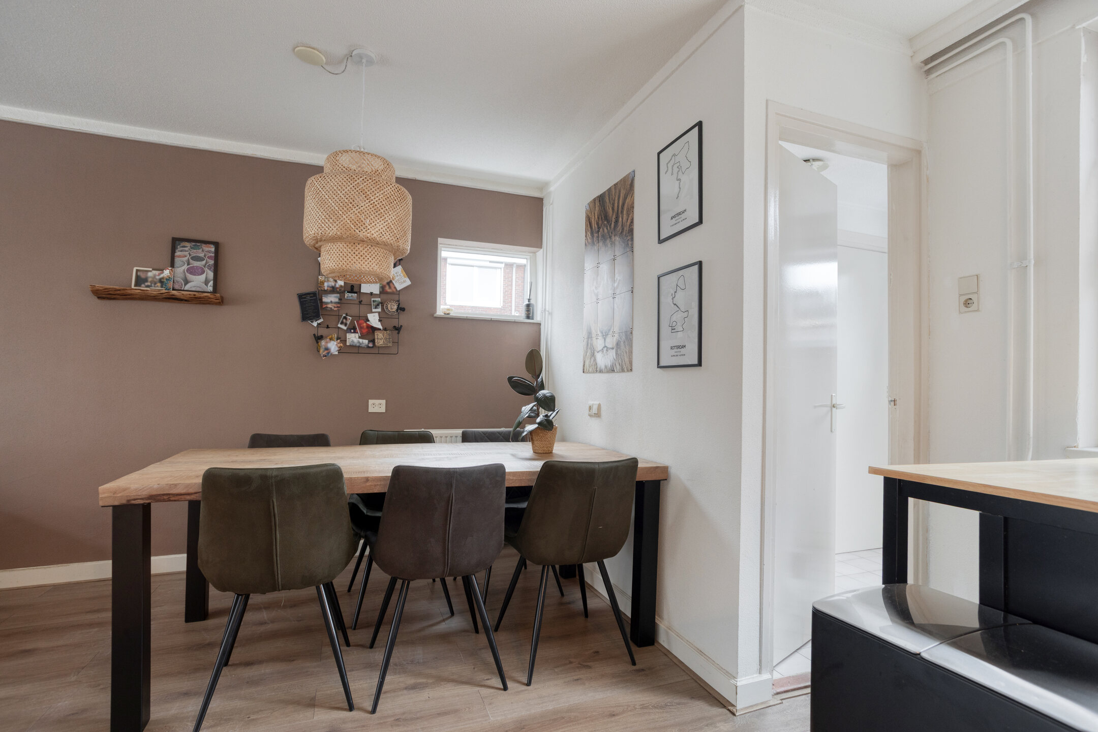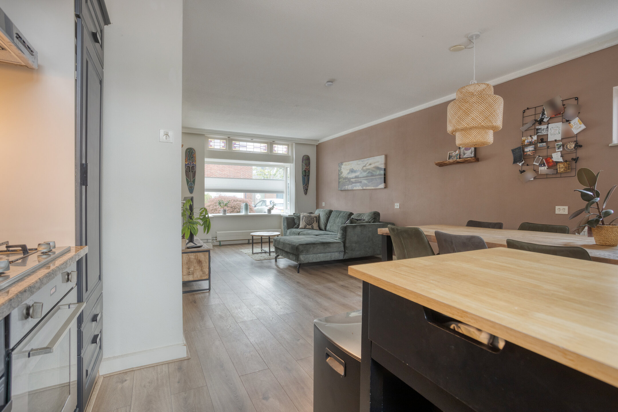 Binnen vind je verrassend veel ruimte. De woonkamer is licht en sfeervol, met genoeg plek voor een grote eettafel of een fijne zithoek. De uitbouw aan de achterzijde biedt extra praktische ruimte voor de wasmachine en droger, en via de achterdeur loop je zo de tuin in.