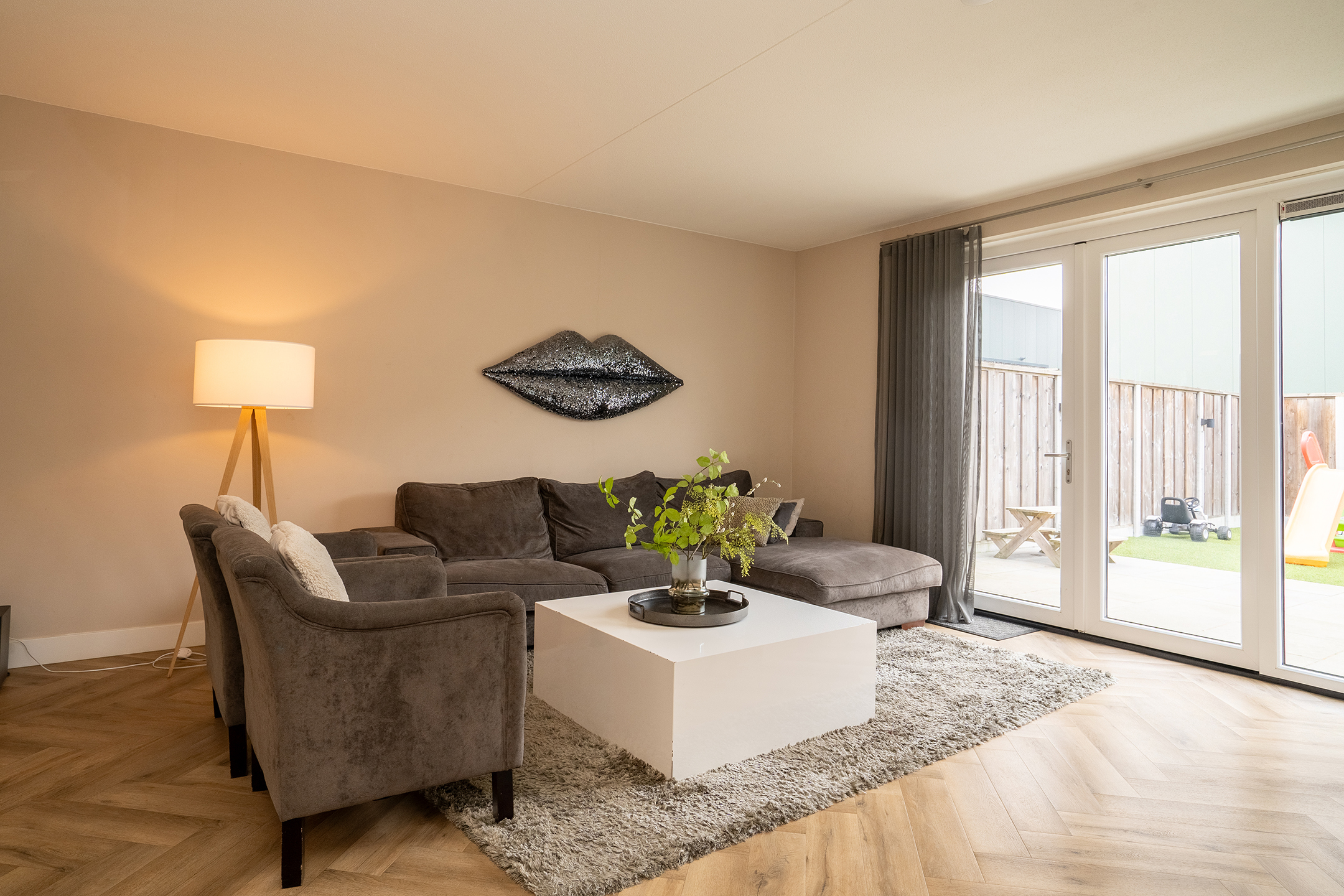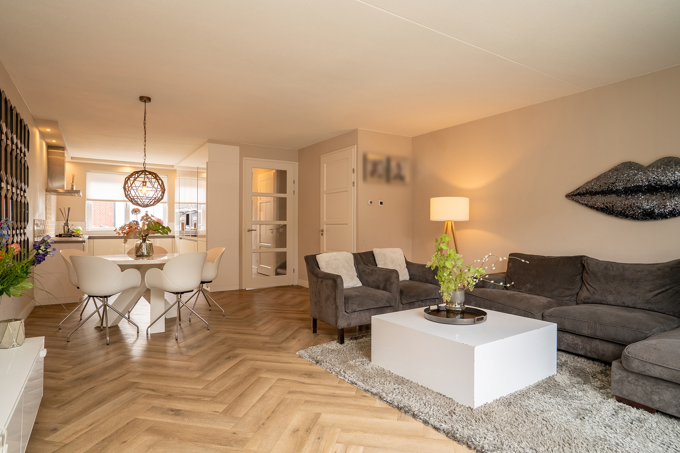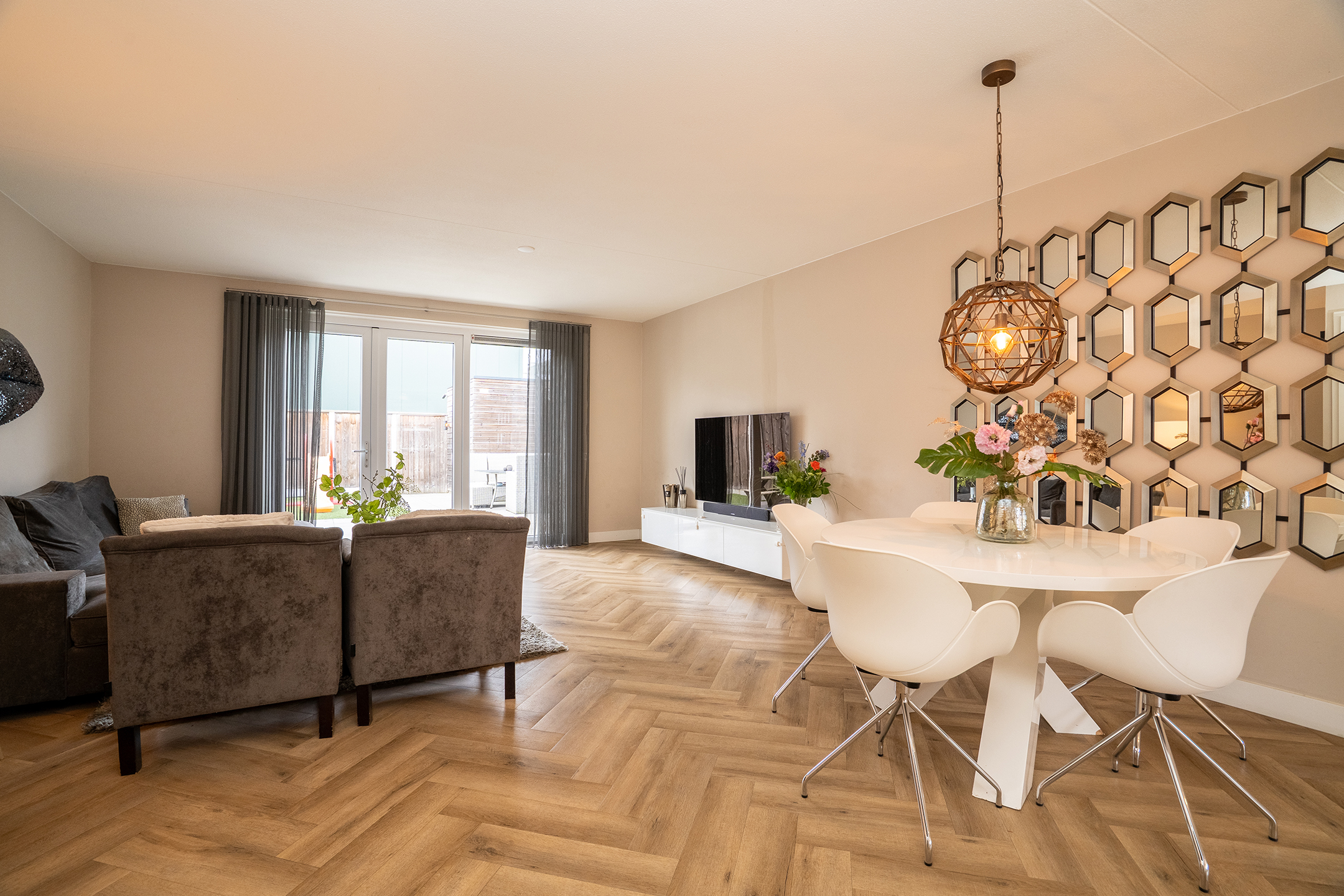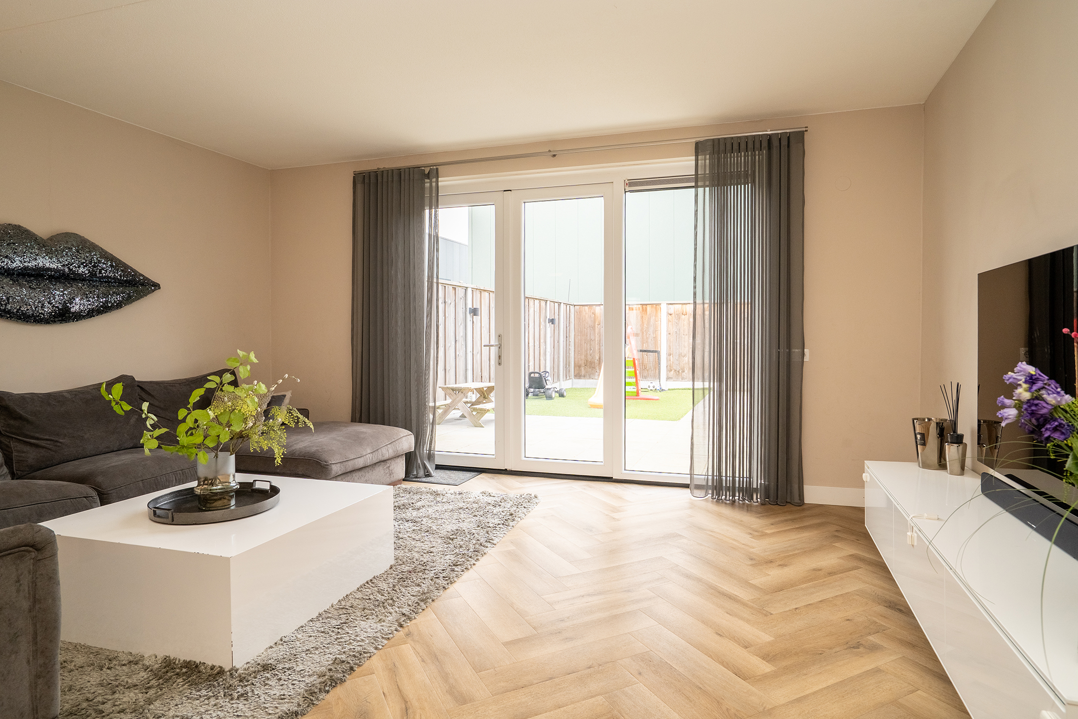 Vanuit de hal loop je door naar de leefruimte, waar de combinatie van veel licht en de visgraatvloer zorgt voor een warme uitstraling. De ruime woonkamer is gelegen aan de achterzijde van de woning en beschikt over openslaande deuren naar de achtertuin.