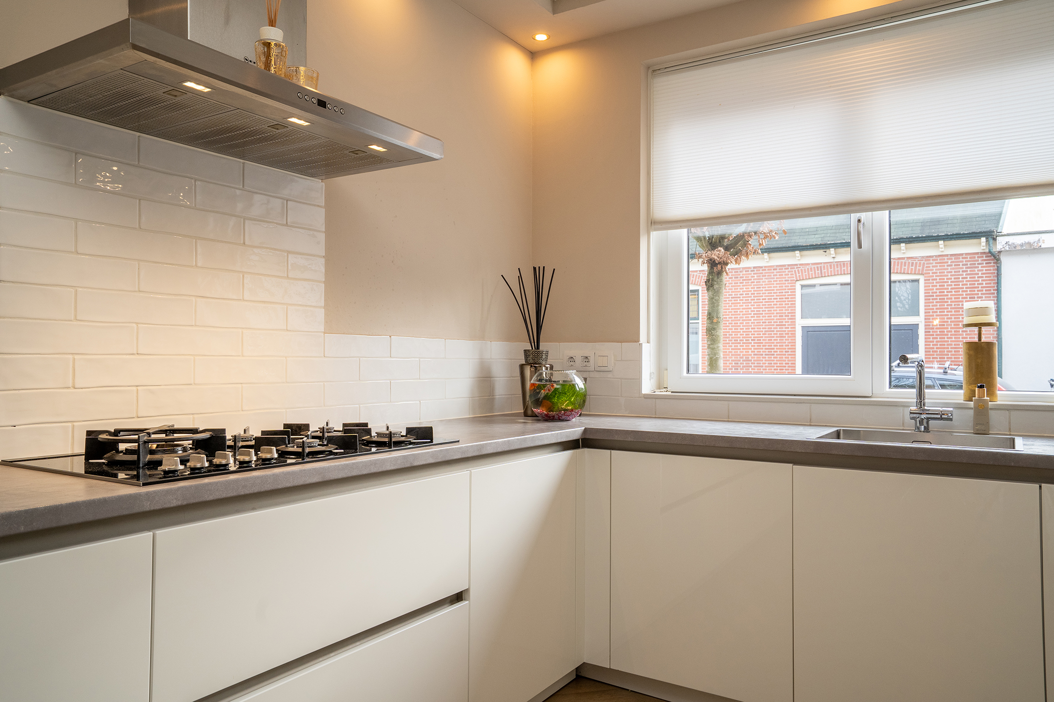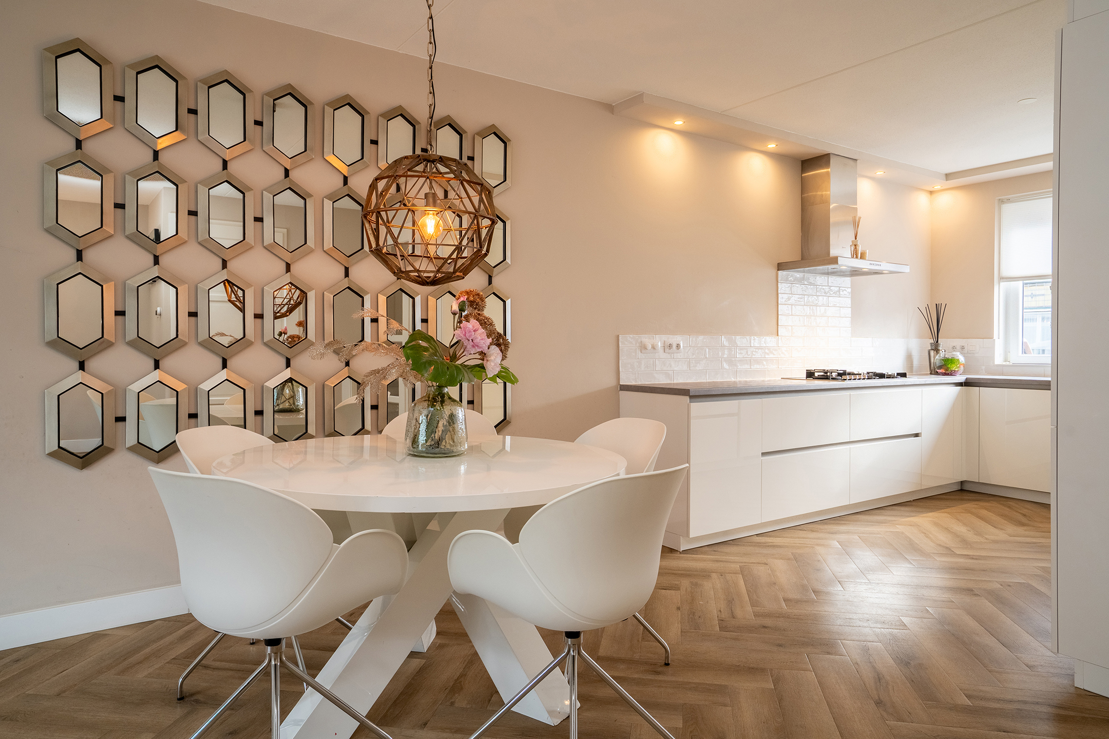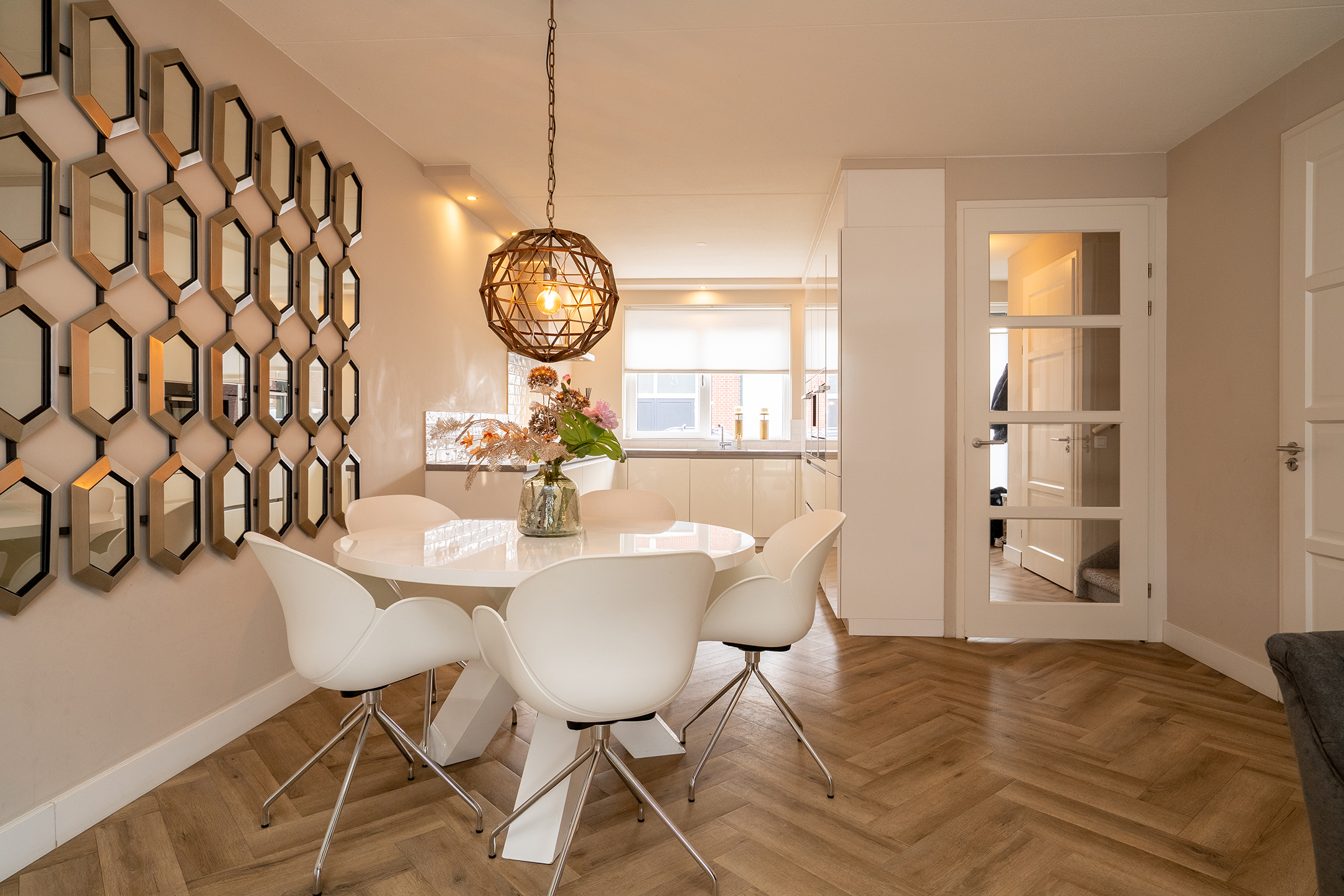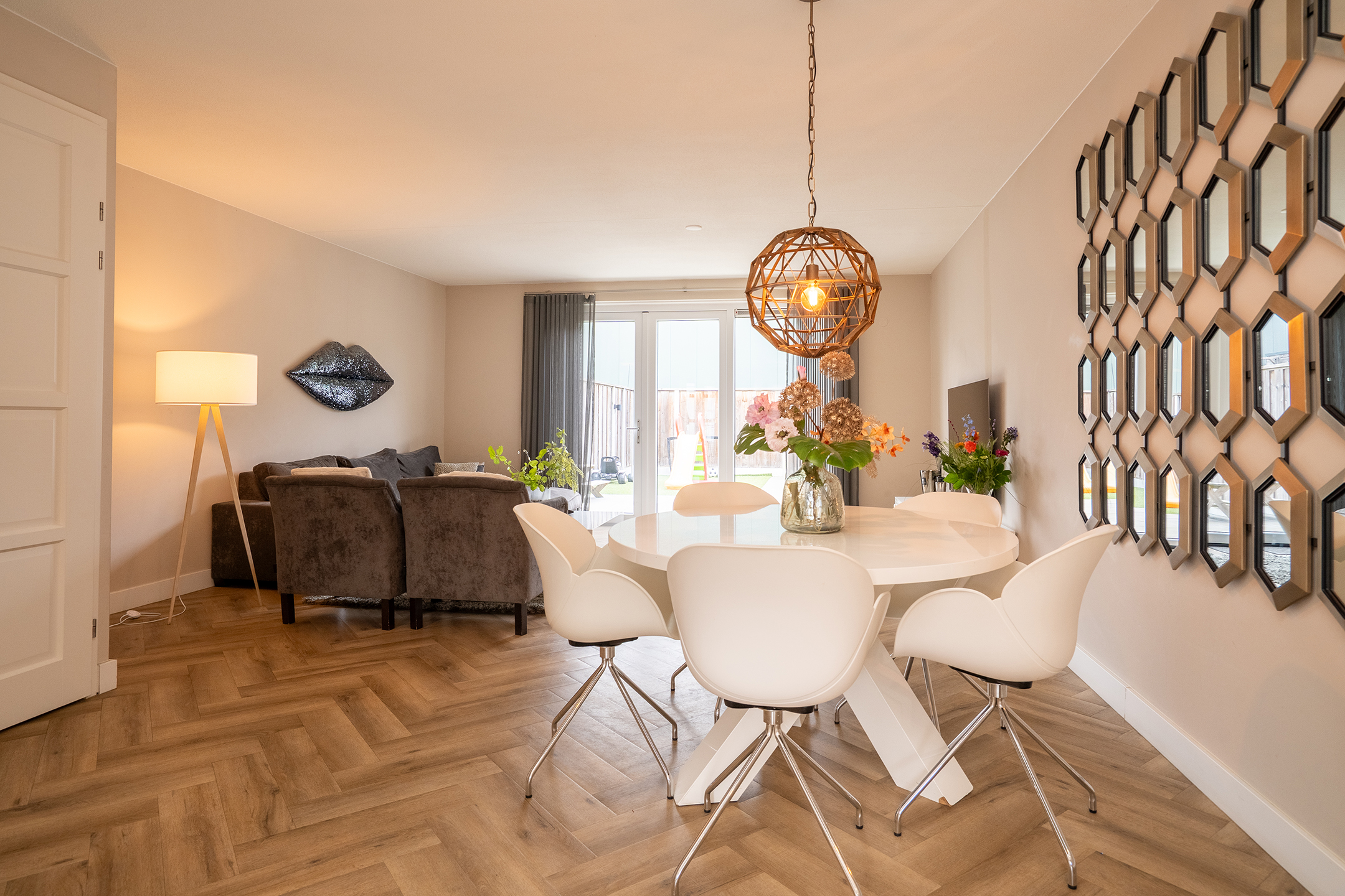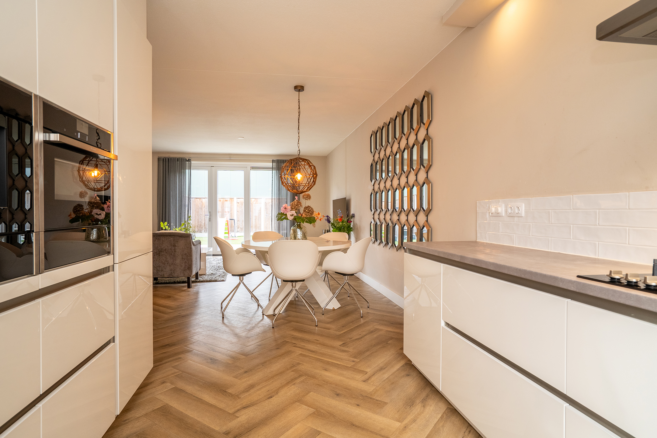 Vanuit de hal loop je door naar de leefruimte, waar de combinatie van veel licht en de visgraatvloer zorgt voor een warme uitstraling. De ruime woonkamer is gelegen aan de achterzijde van de woning en beschikt over openslaande deuren naar de achtertuin.
