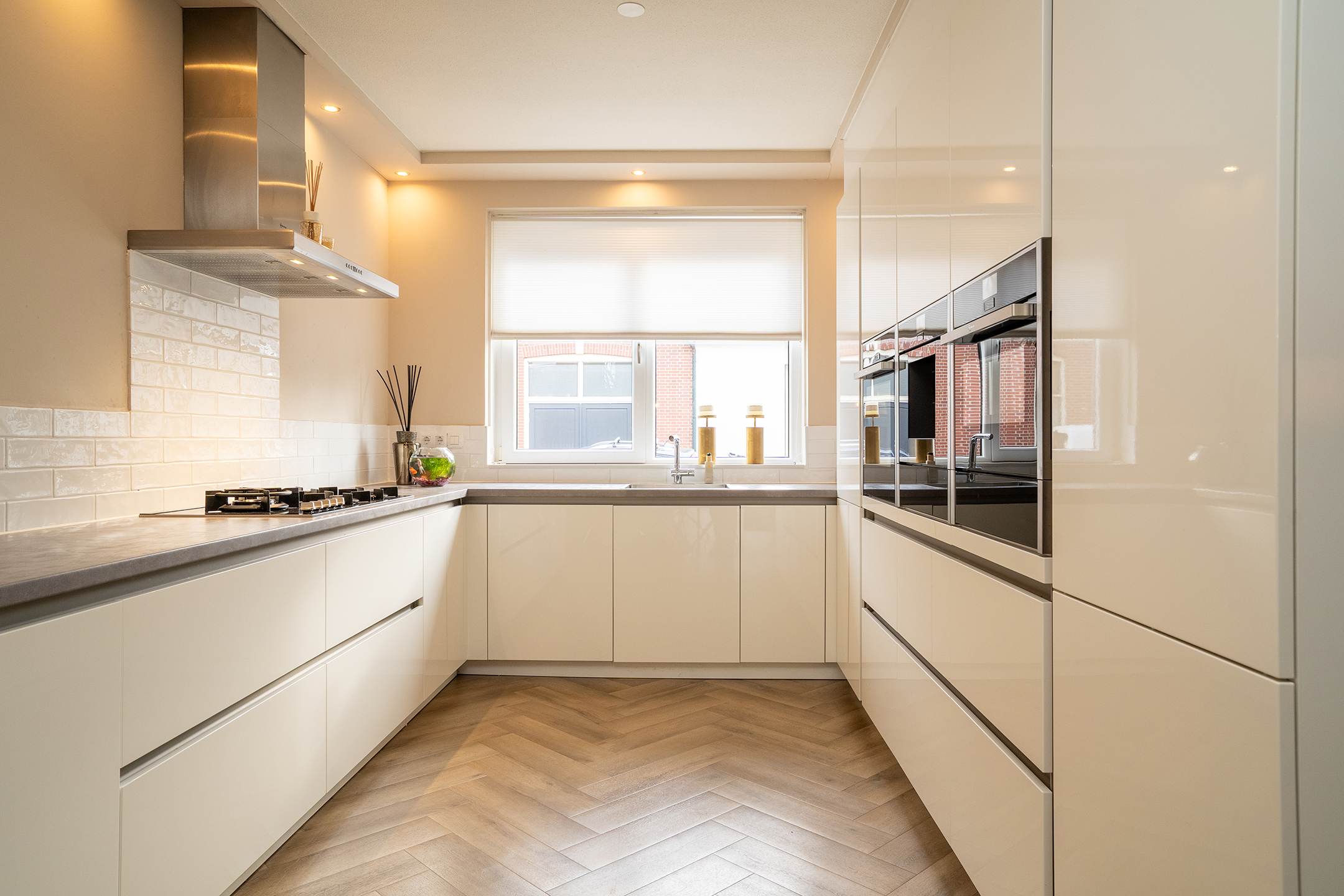 Aan de voorzijde bevindt zich de moderne keuken in U-opstelling. Deze stijlvolle en complete keuken is voorzien van diverse inbouwapparatuur, waaronder een gasfornuis met afzuigkap, vaatwasser, koelkast, oven, magnetron en een ingebouwd koffiezetapparaat.