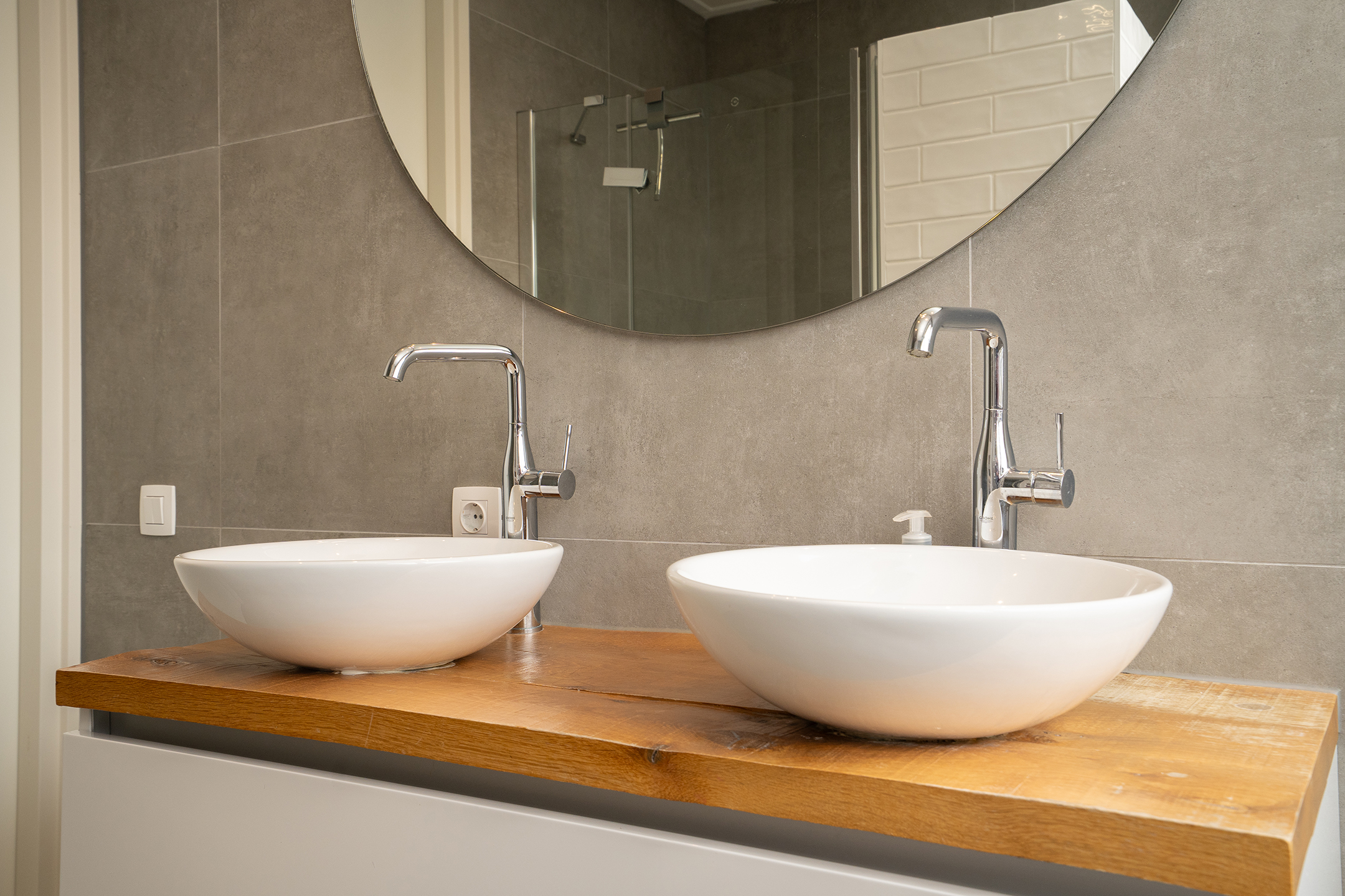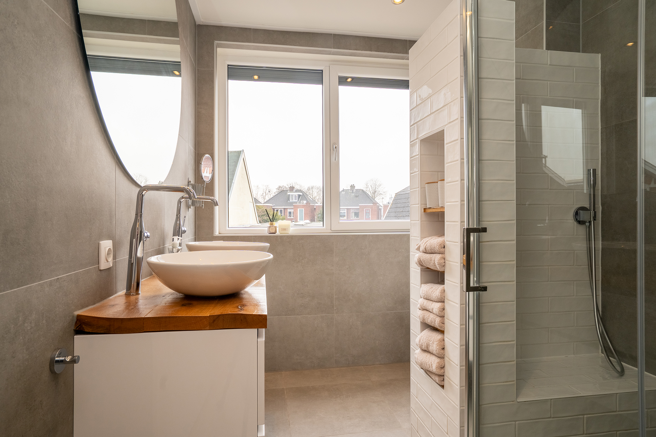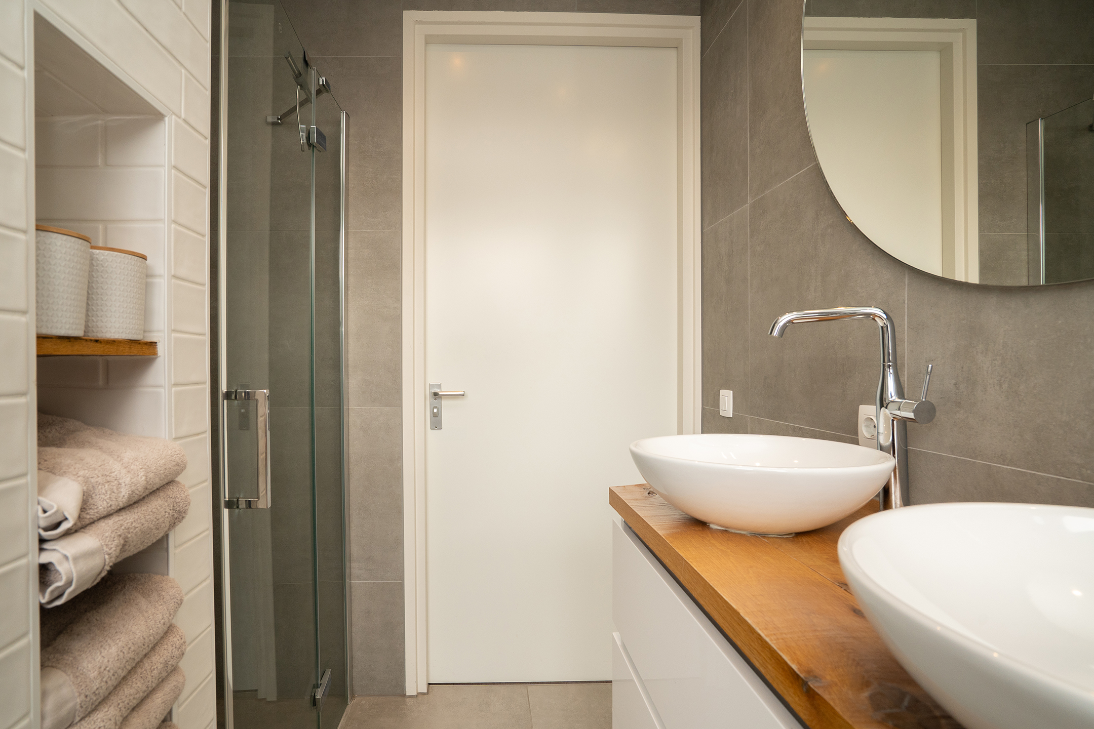 De badkamer is stijlvol en volledig betegeld en biedt een fijne combinatie van comfort en design. Zo is de ruimte voorzien van vloerverwarming, een inloopdouche, een hangend toilet en een luxe wastafelmeubel met dubbele lades en twee waskommen. De inloopdouche is bovendien uitgevoerd met een scheidingswand met handige nis, ideaal voor handdoeken en toiletartikelen. Kortom: een complete badkamer waar comfort en design samenkomen.