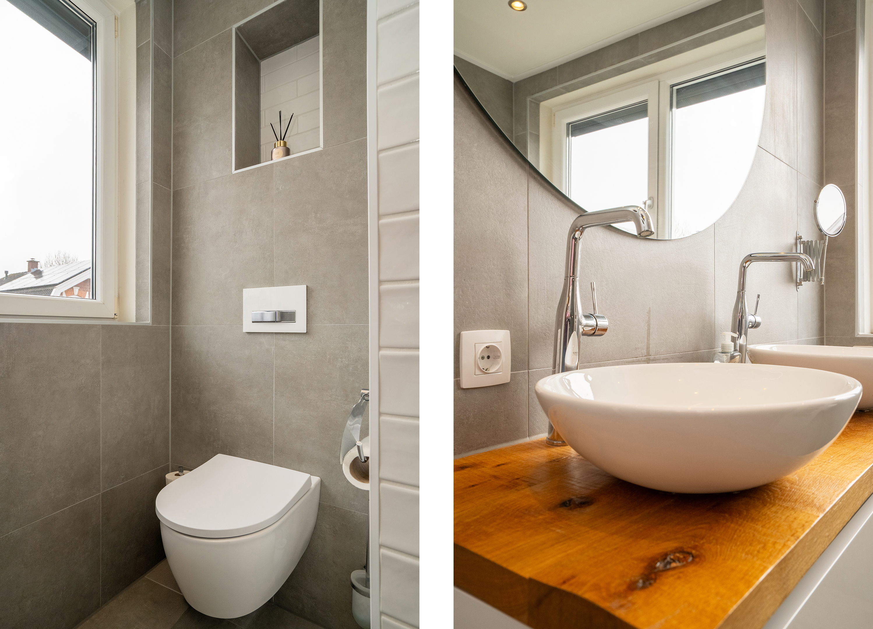 Daarnaast is er een modern afgewerkt separaat toilet, voorzien van vloerverwarming en een wastafelmeubel met dubbele lades en een fraaie opzetkom. Het raam zorgt hier voor prettig daglicht en natuurlijke ventilatie.