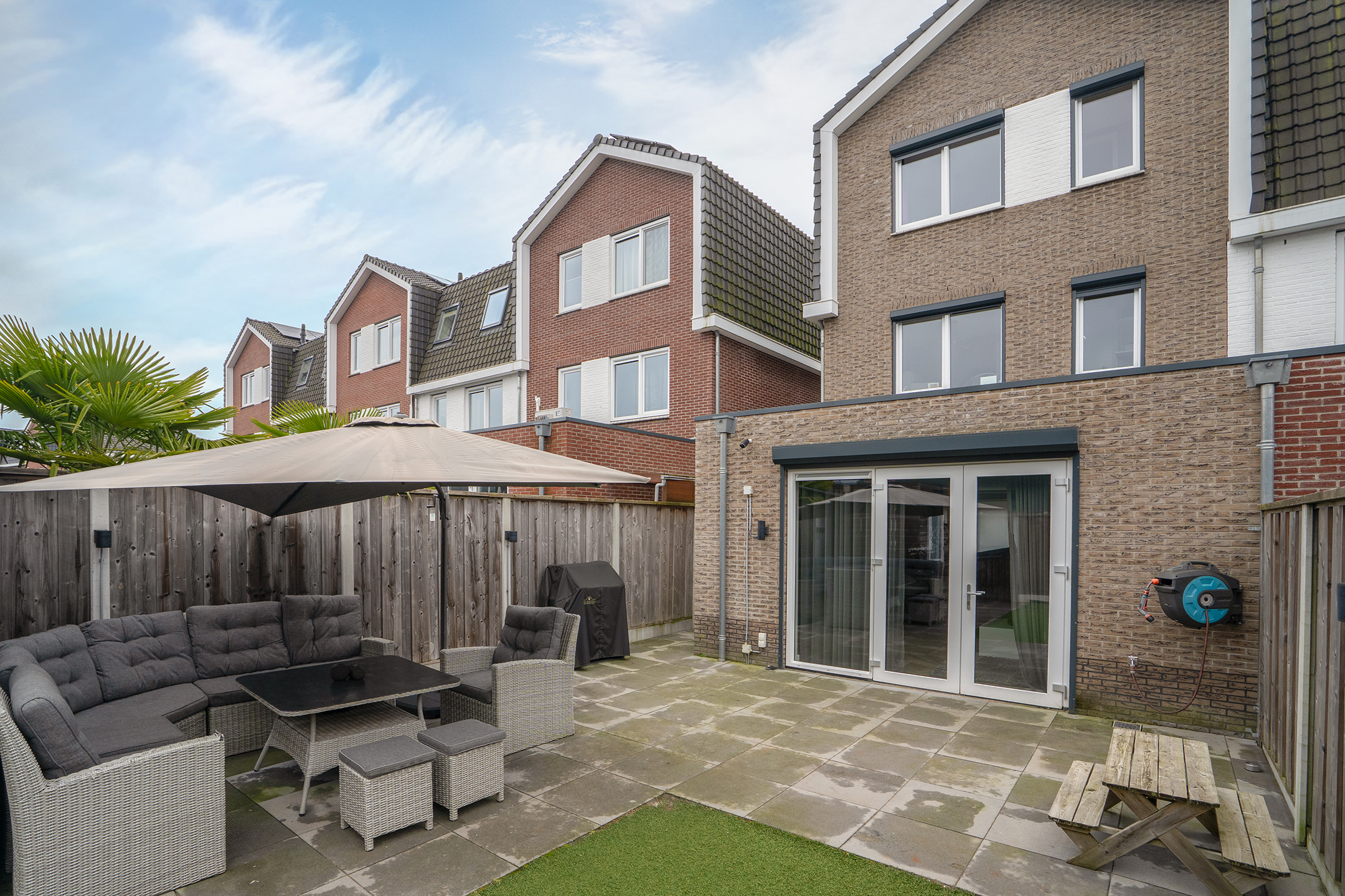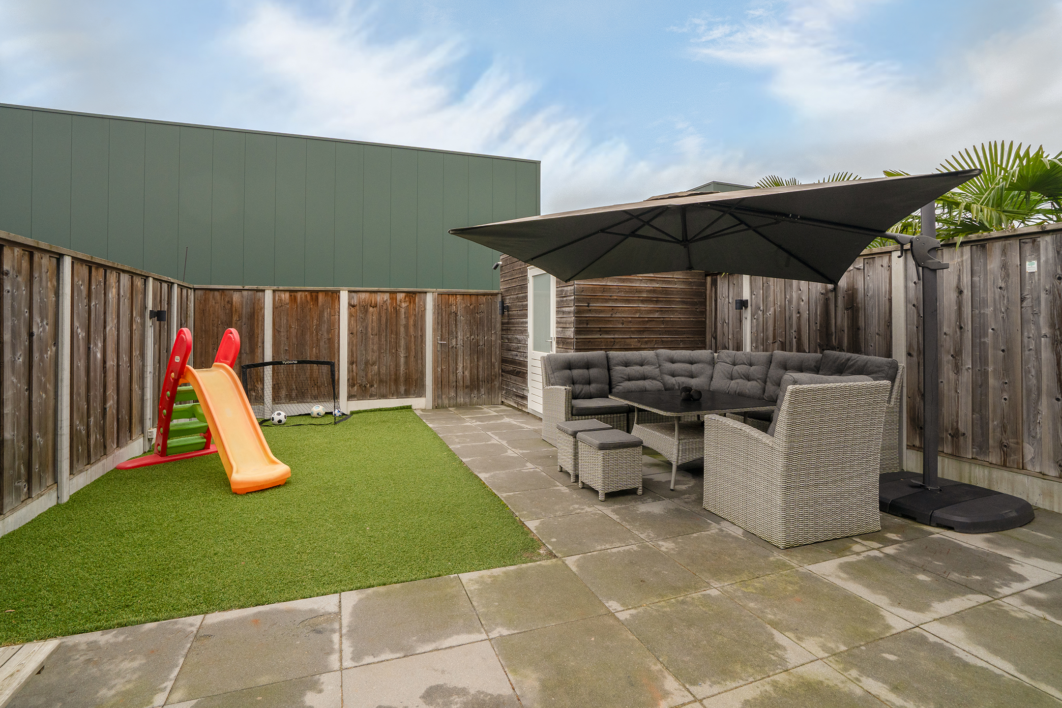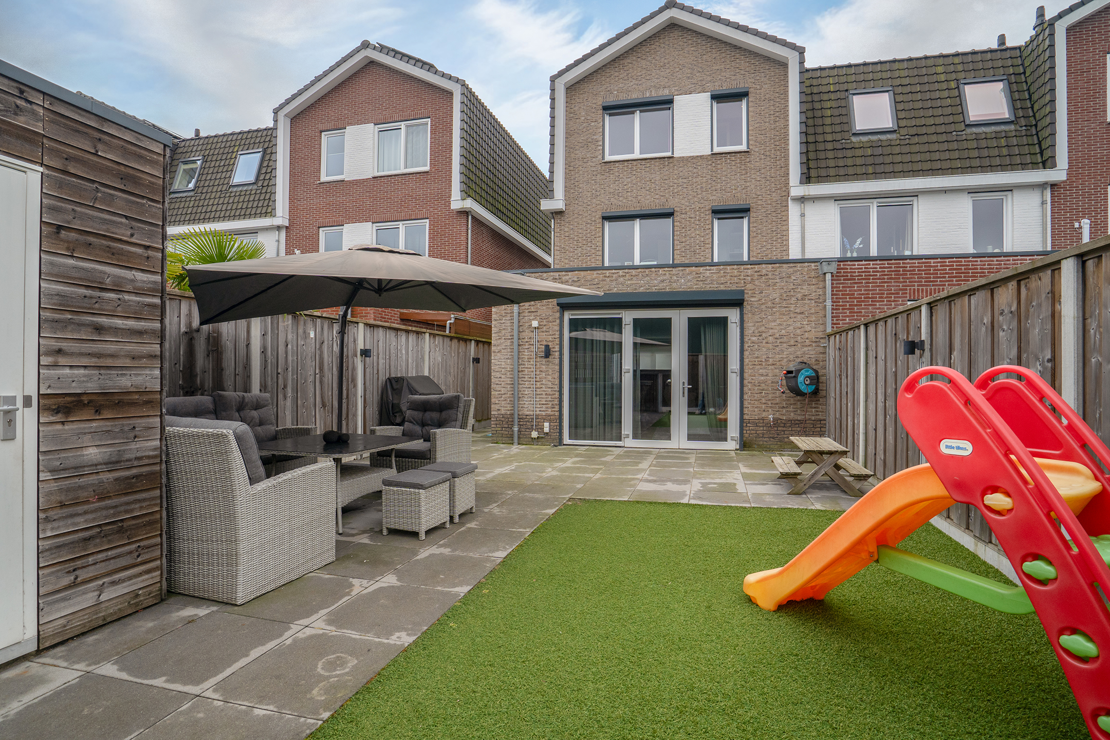 Tuin: De achtertuin is ruim en onderhoudsvriendelijk ingericht. Dankzij de combinatie van tegels en een stuk kunstgras is dit een fijne plek voor zowel ontspanning als speelplezier. Er is volop ruimte voor een comfortabele loungeset én een extra zit- of eethoek. Achterin de tuin staat een vrijstaande houten berging, ideaal voor fietsen, tuingereedschap of extra opslag. De tuin beschikt bovendien over een eigen achterom, wat het geheel extra praktisch maakt en zorgt voor een gemakkelijke toegang tot de tuin en berging.