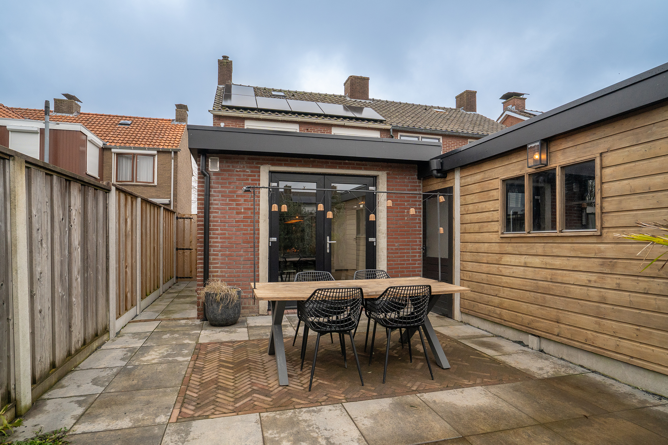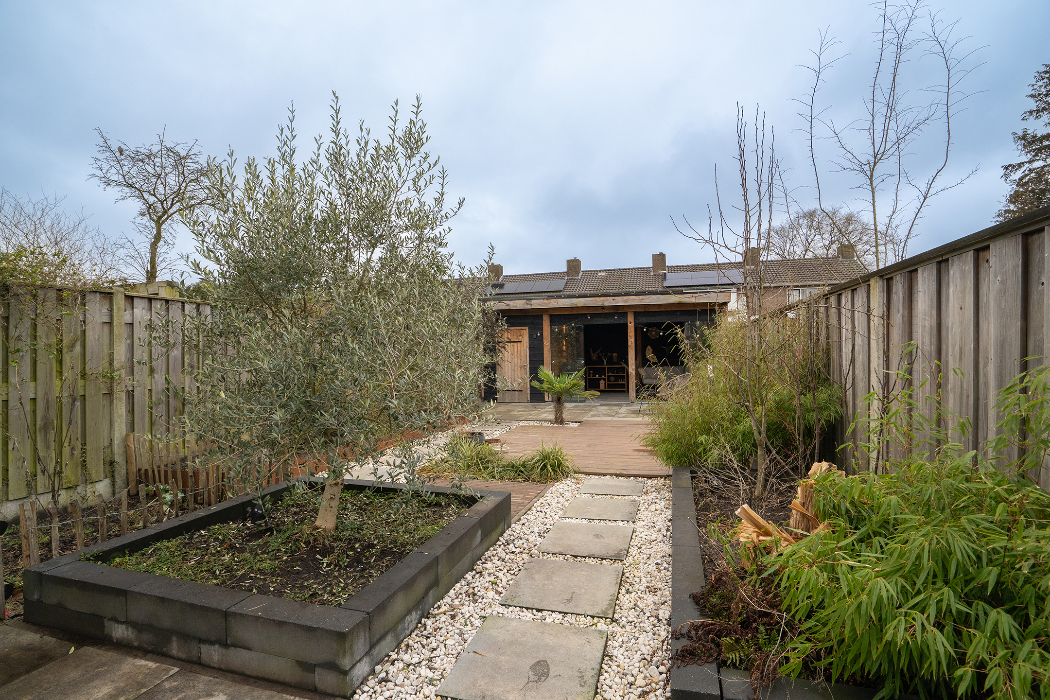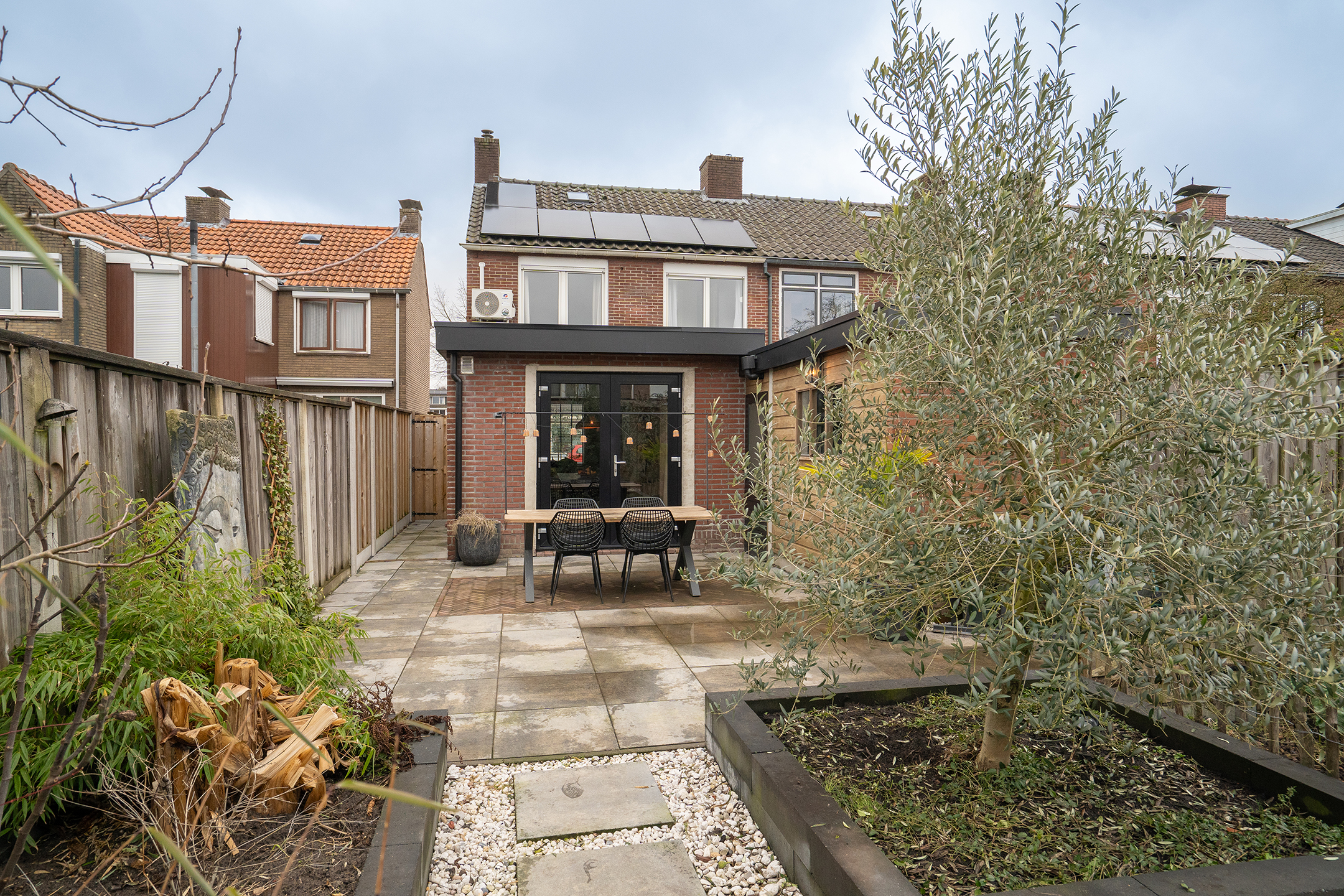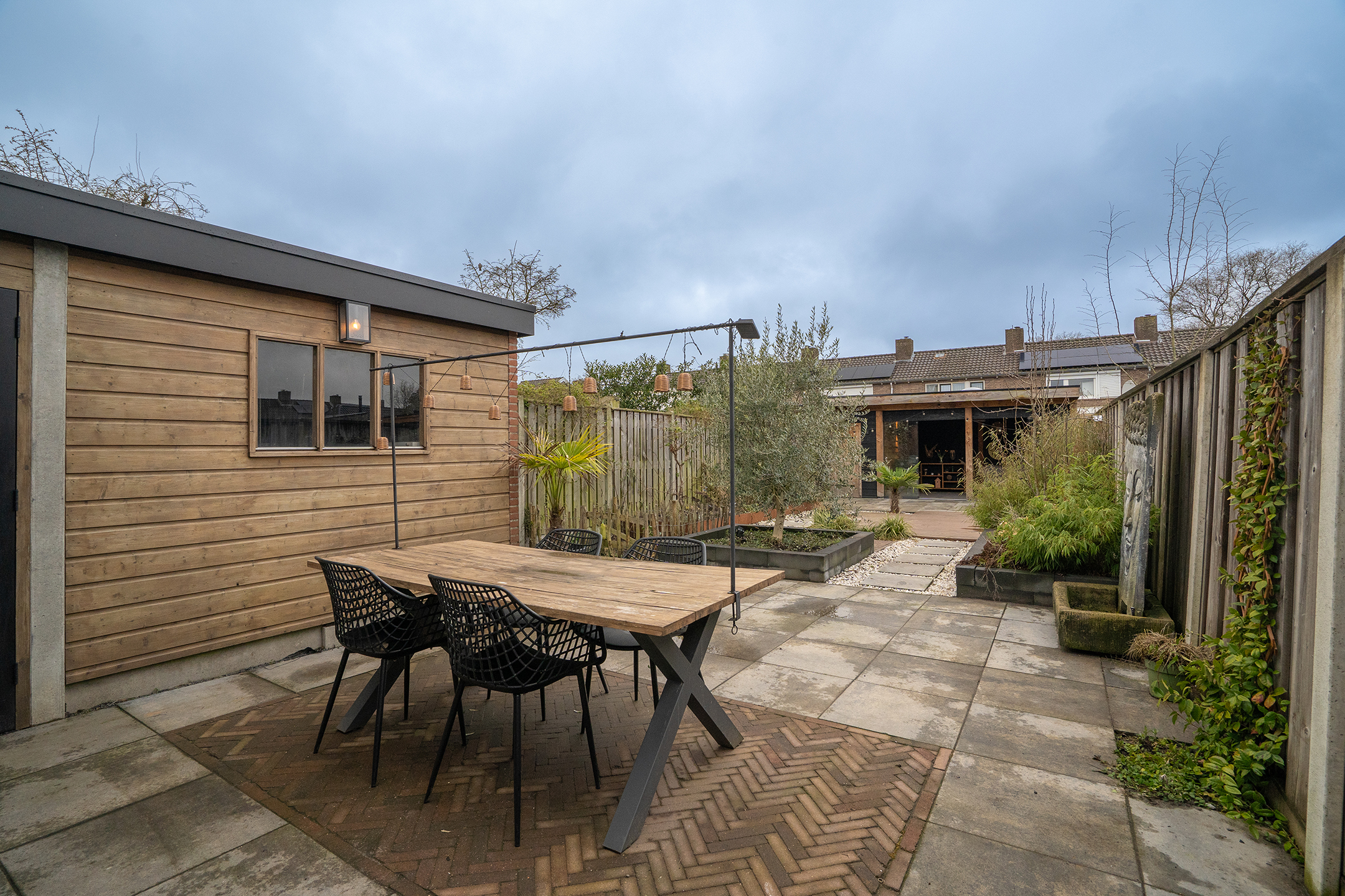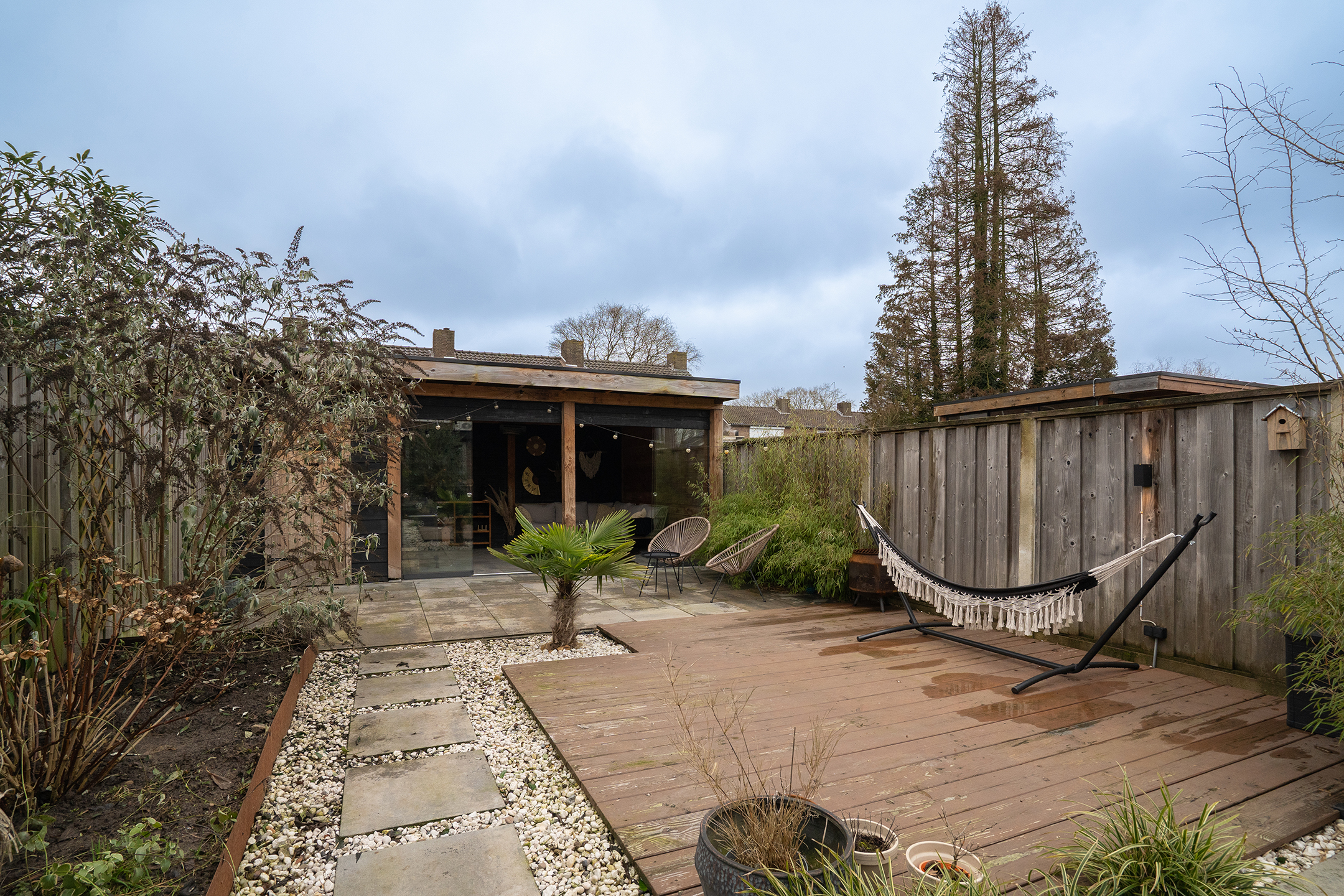 Ook buiten is het genieten. In 2023 zijn zowel de voor als achtertuin vernieuwd. De onderhoudsvriendelijke voortuin biedt parkeergelegenheid op eigen terrein en de achtertuin is sfeervol ingericht met meerdere terrassen, een extra berging én een prachtige overkapping met glazen schuifwanden. Daarnaast is er een eigen achterom via de zijkant van de woning.