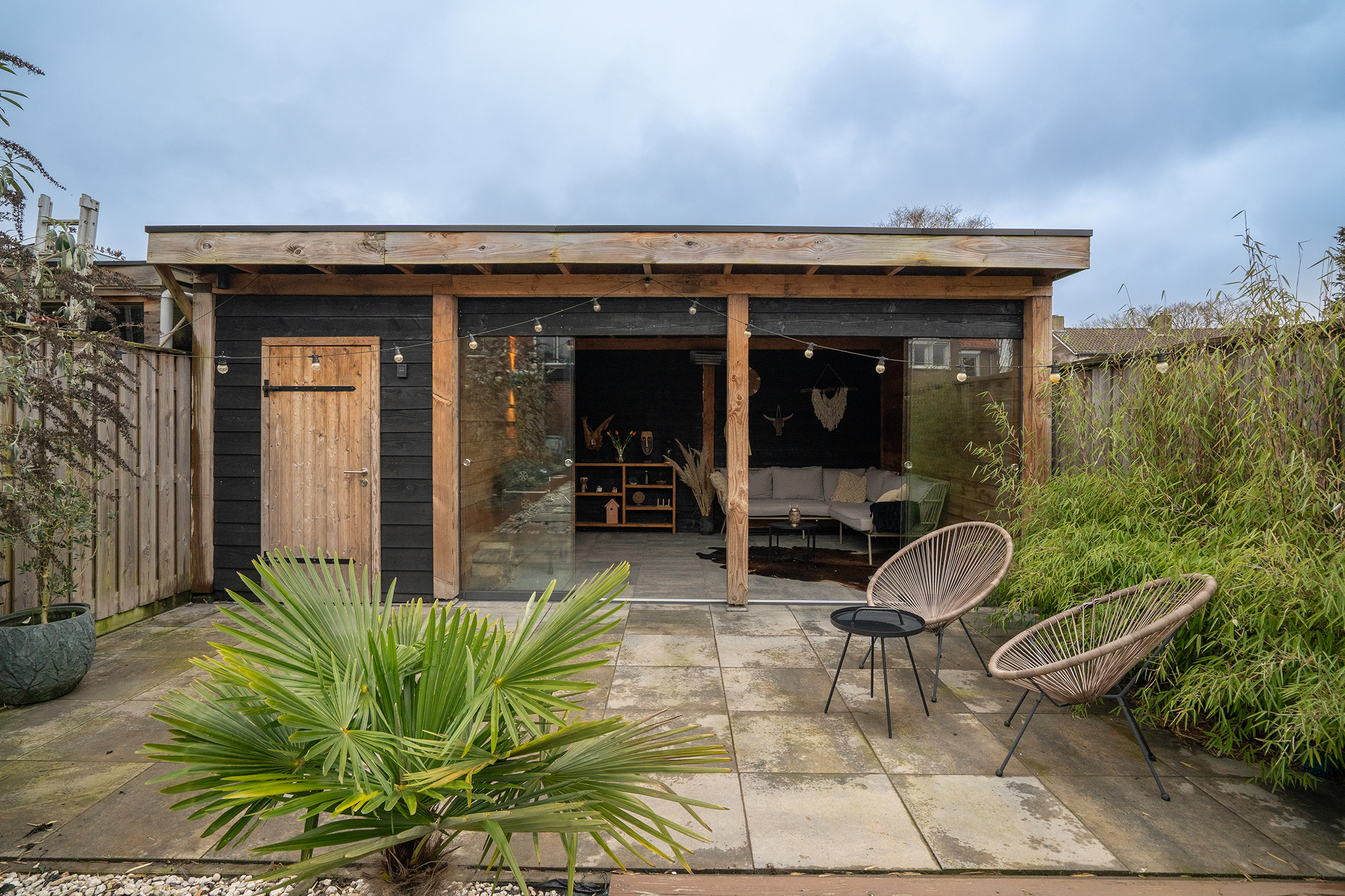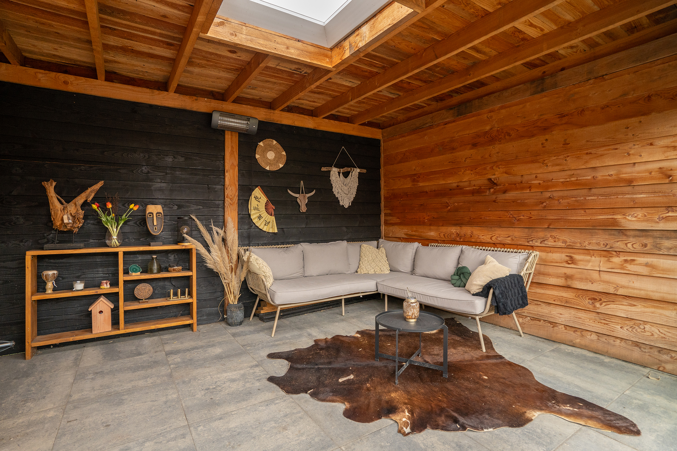 Achter in de tuin staat een prachtige overkapping die is afgewerkt met hout en voorzien van glazen schuifwanden. Hierdoor kun je hier het hele jaar door comfortabel zitten. Aangrenzend bevindt zich een extra berging, ideaal voor het opbergen van fietsen en tuinmateriaal.