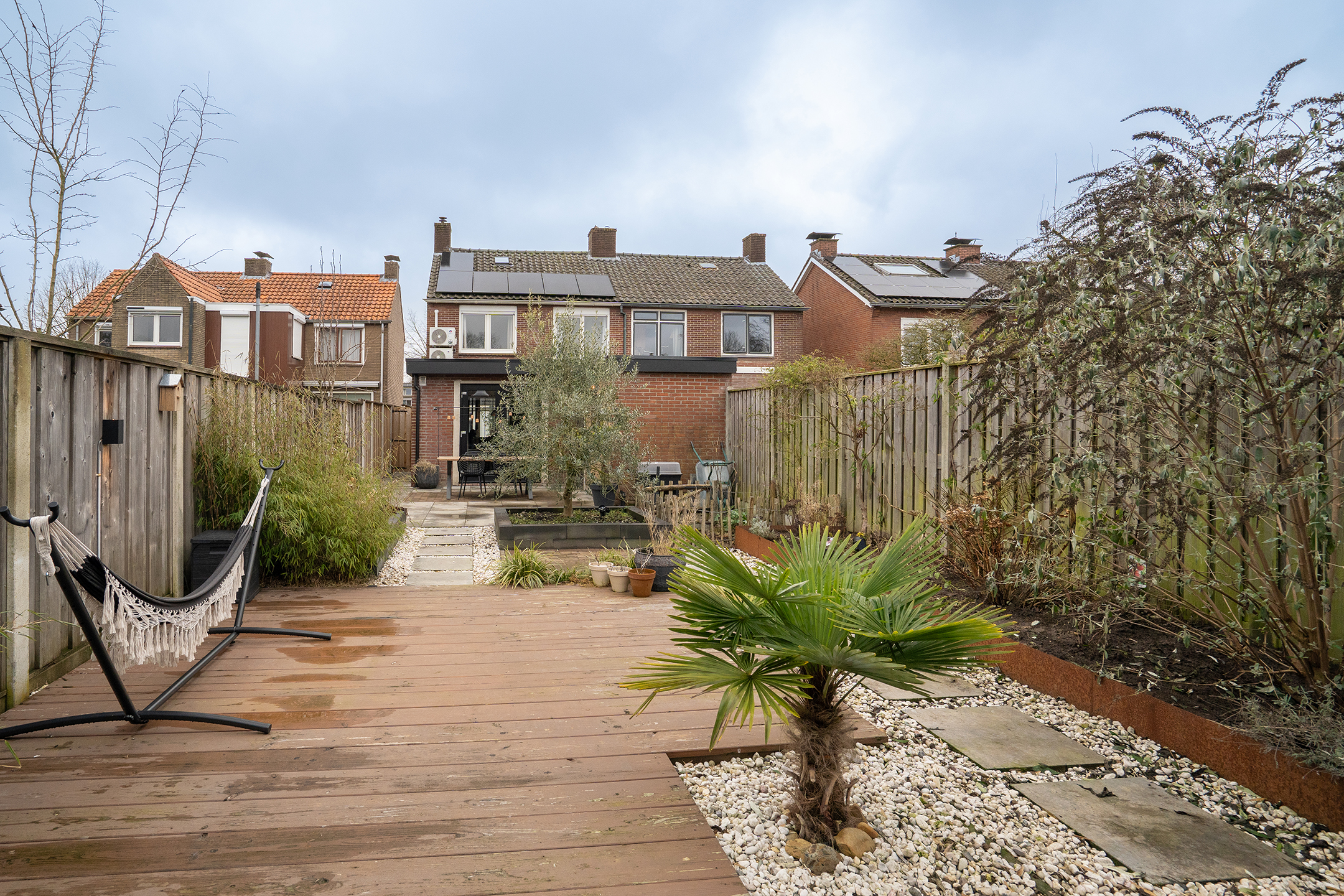 De achtertuin is sfeervol en doordacht ingericht met meerdere zitplekken. Dankzij de gunstige ligging is de tuin heerlijk zonnig, waardoor je op verschillende momenten van de dag kunt genieten van het buitenleven. Direct achter de woning bevindt zich een ruim terras, perfect voor lange zomeravonden aan de eettafel. Verderop in de tuin is een tweede terras met houten vlonder gerealiseerd, wat zorgt voor een speels effect en extra leefruimte buiten.