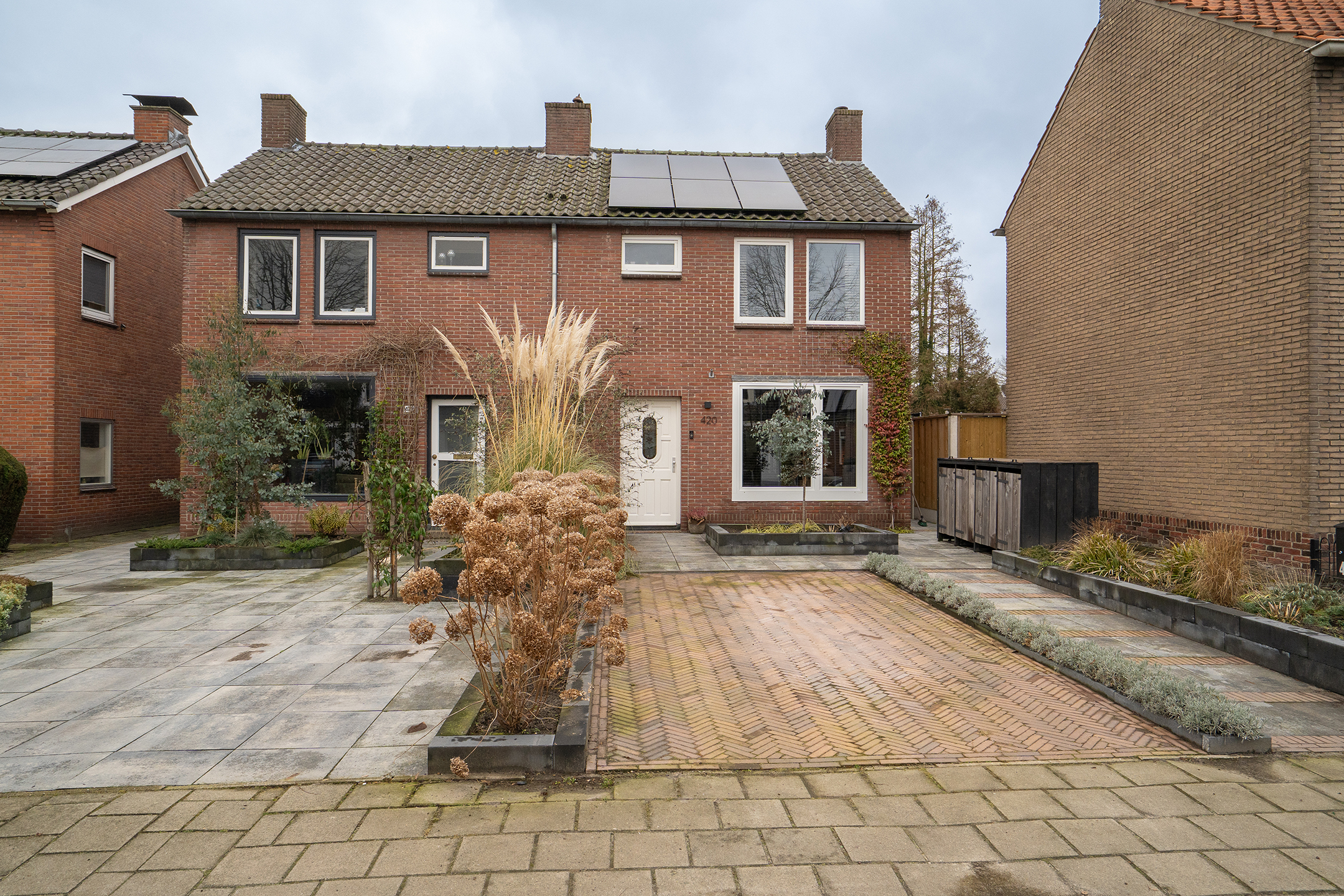 De voortuin is onderhoudsvriendelijk aangelegd en biedt parkeergelegenheid op eigen terrein. Strakke bestrating in combinatie met groenborders zorgt voor een prettige balans tussen groen en gemak.
