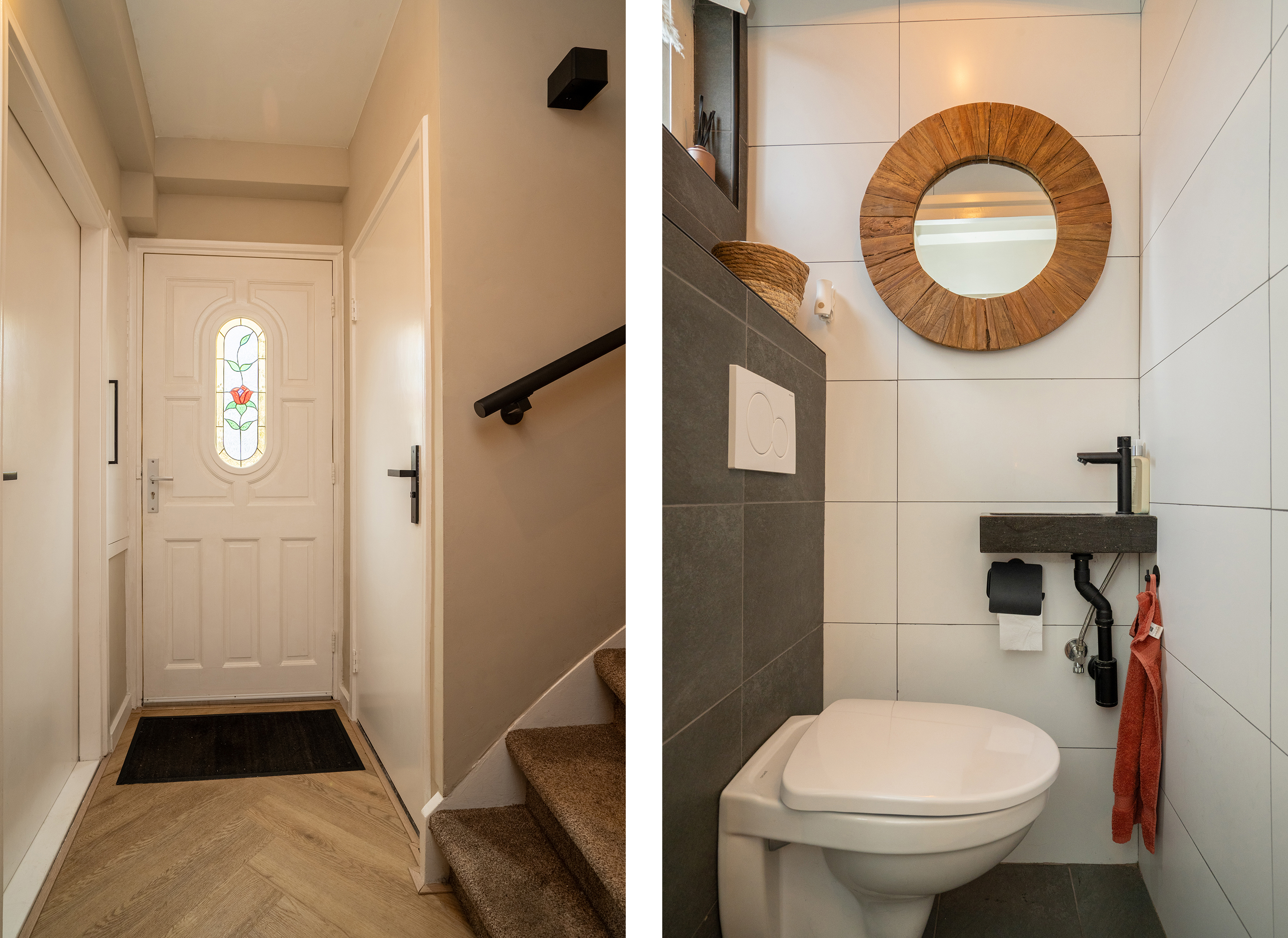 Begane grond: Via de verzorgde en onderhoudsvriendelijke voortuin, met parkeergelegenheid op eigen terrein, bereik je de voordeur en stap je binnen in een nette entree met garderoberuimte, modern toilet, trapopgang en praktische trapkast.