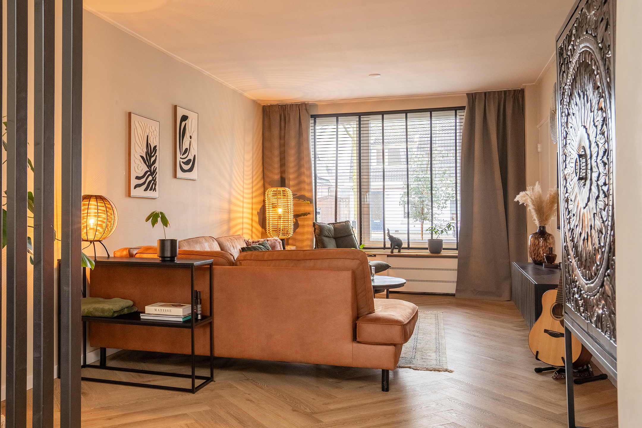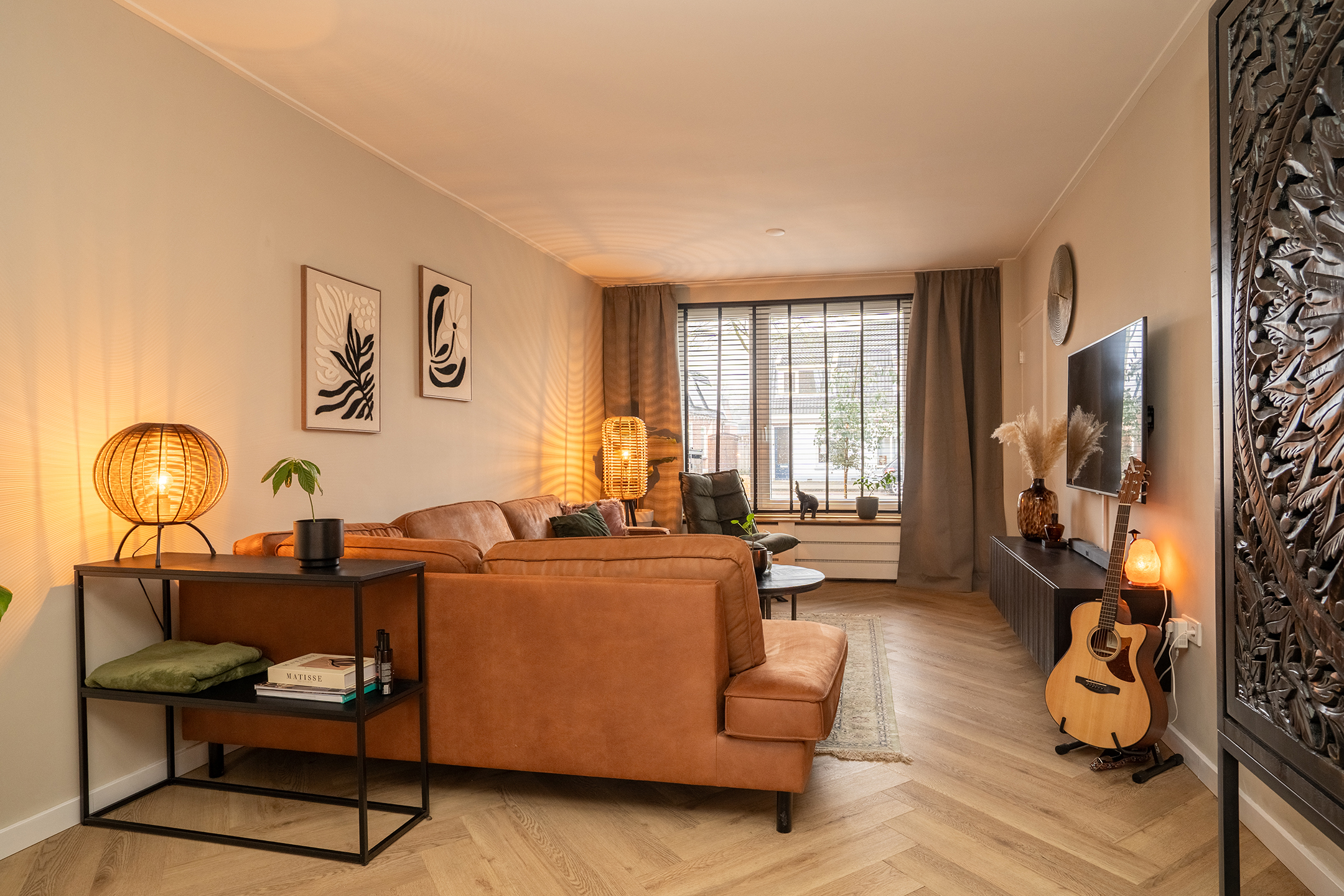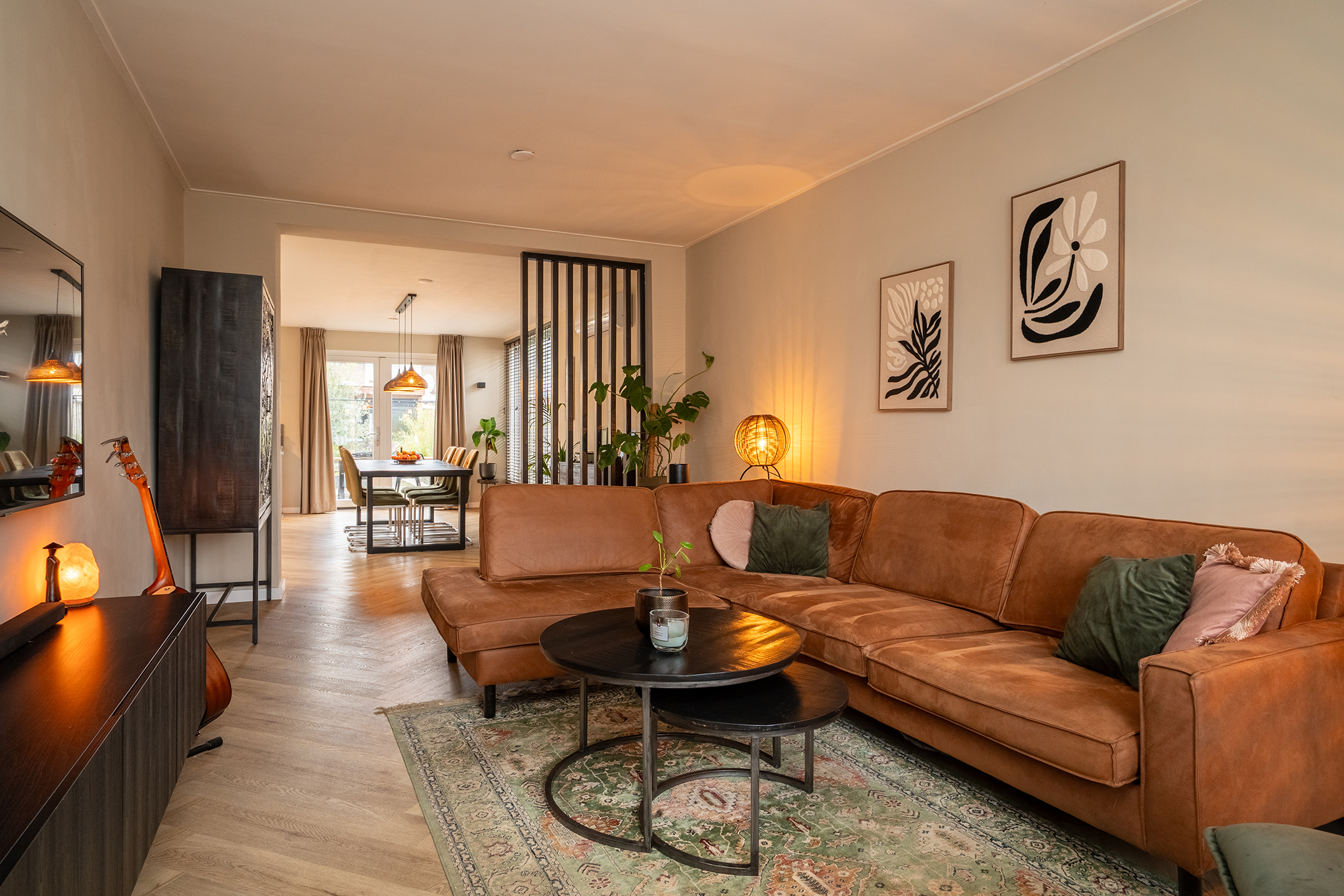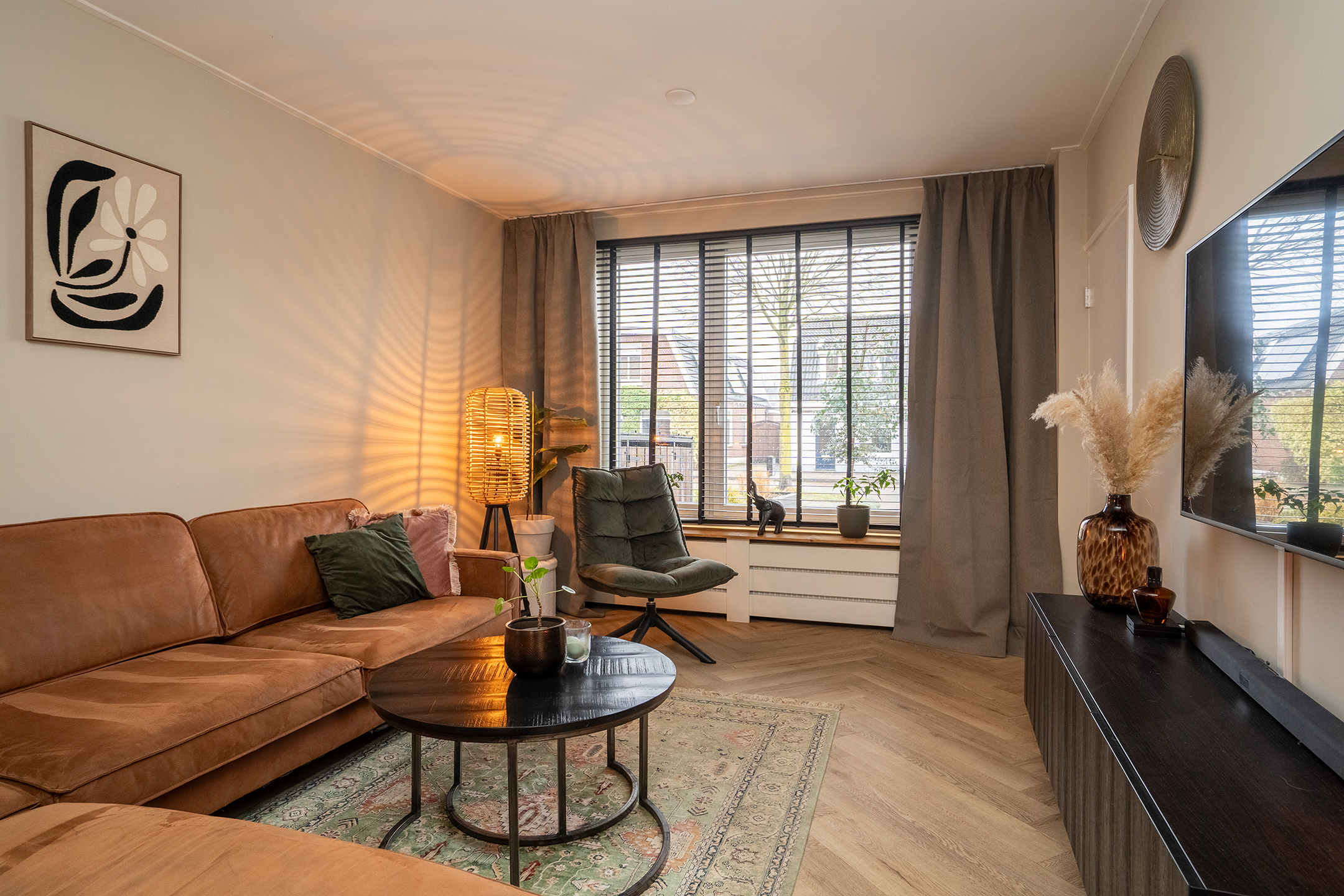 Vanuit de hal loop je door naar de royale leefruimte. Direct valt de prachtige visgraatvloer op, die zorgt voor een warme en stijlvolle uitstraling. De woonkamer is gelegen aan de voorzijde van de woning en beschikt over een grote raampartij, waardoor er veel natuurlijk daglicht binnenvalt