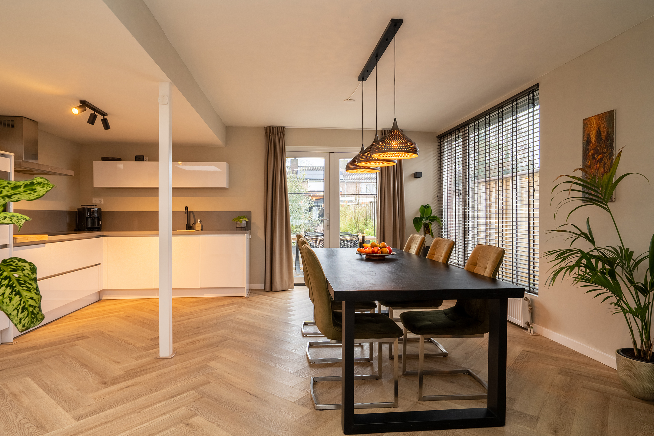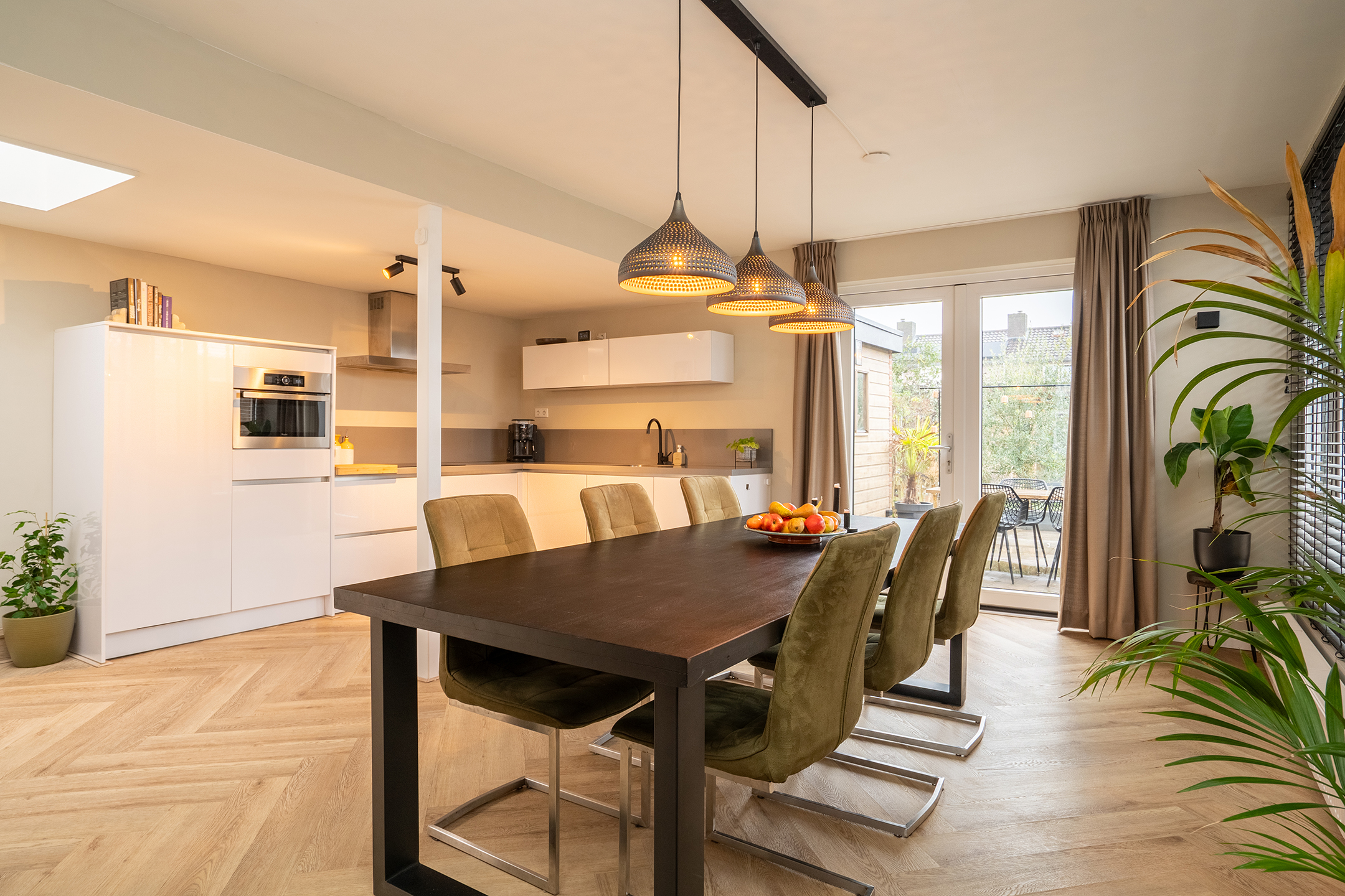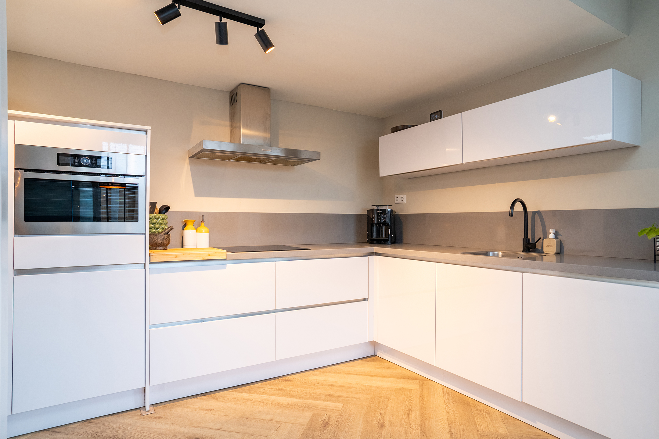 Aan de achterzijde bevindt zich de moderne open keuken, uitgevoerd in een lichte kleurstelling en volledig vernieuwd in 2022. Dankzij de uitbouw is hier een heerlijke leefkeuken ontstaan met volop ruimte voor een grote eettafel. De keuken is voorzien van diverse inbouwapparatuur, waaronder een inductie kookplaat, vaatwasser, koelkast en oven. De praktische opstelling en het directe contact met de eetkamer maken dit een fijne plek om te koken en samen te komen.