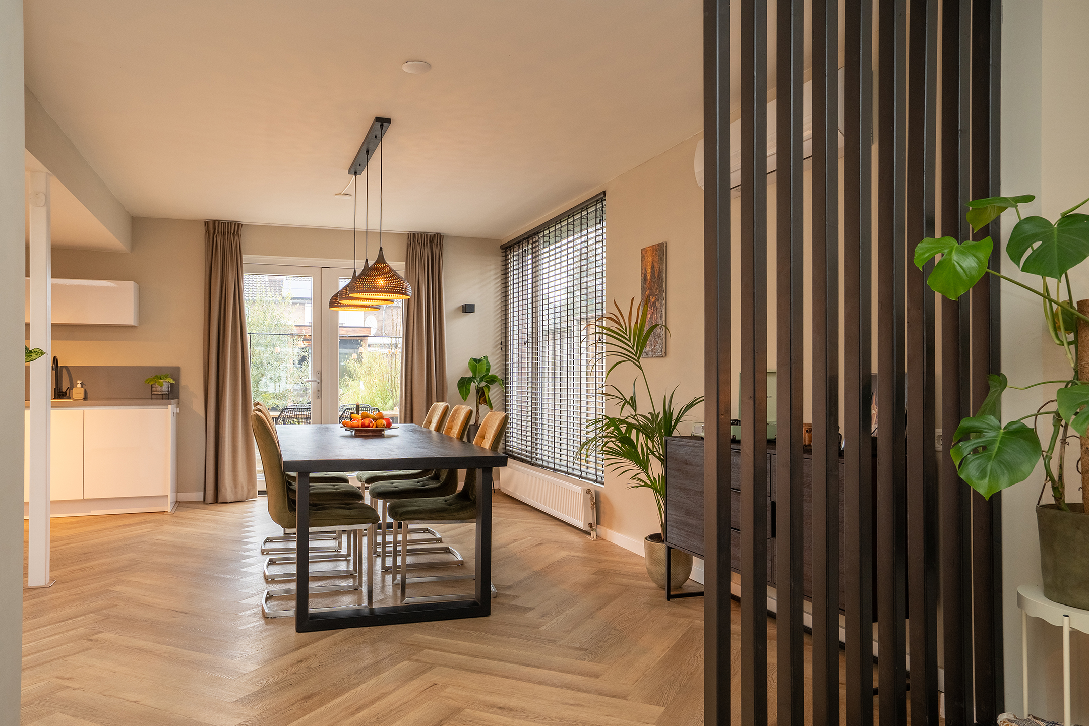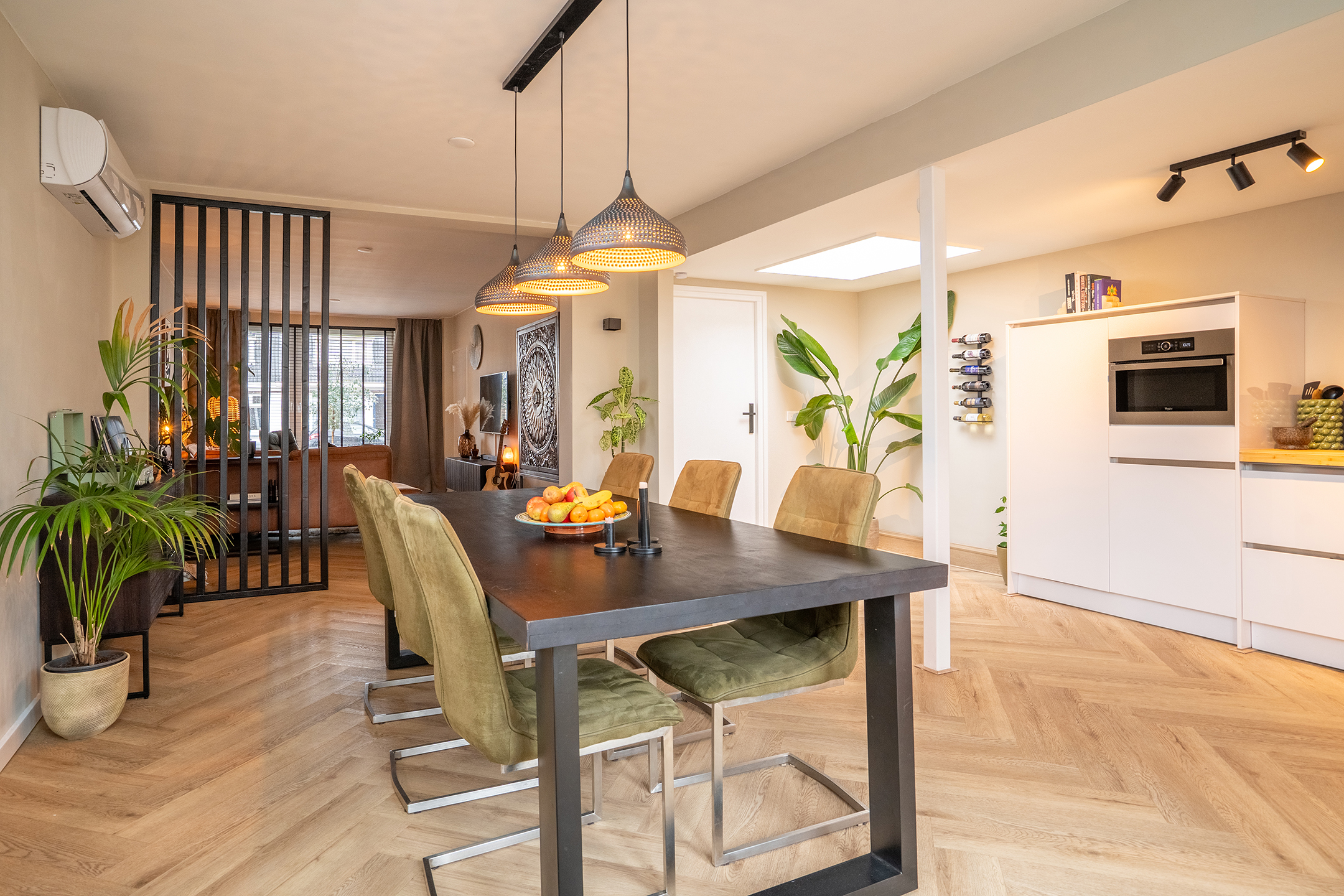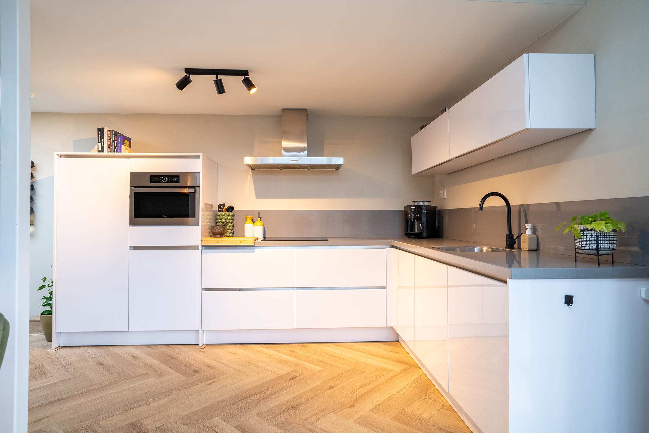 Aan de achterzijde bevindt zich de moderne open keuken, uitgevoerd in een lichte kleurstelling en volledig vernieuwd in 2022. Dankzij de uitbouw is hier een heerlijke leefkeuken ontstaan met volop ruimte voor een grote eettafel. De keuken is voorzien van diverse inbouwapparatuur, waaronder een inductie kookplaat, vaatwasser, koelkast en oven. De praktische opstelling en het directe contact met de eetkamer maken dit een fijne plek om te koken en samen te komen.