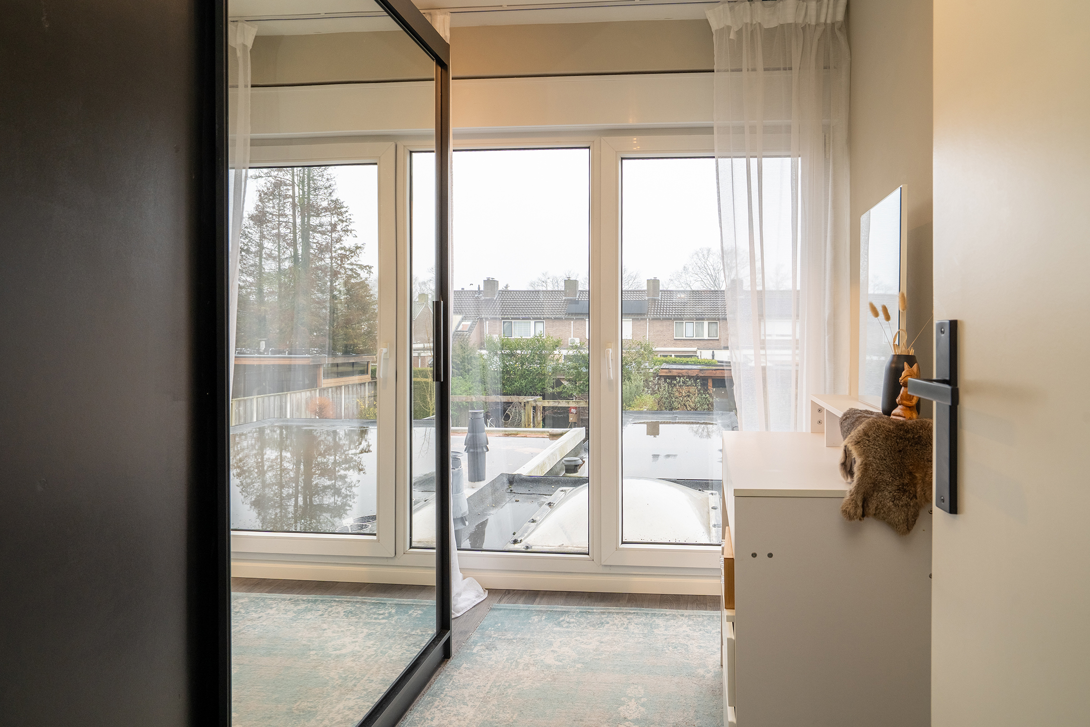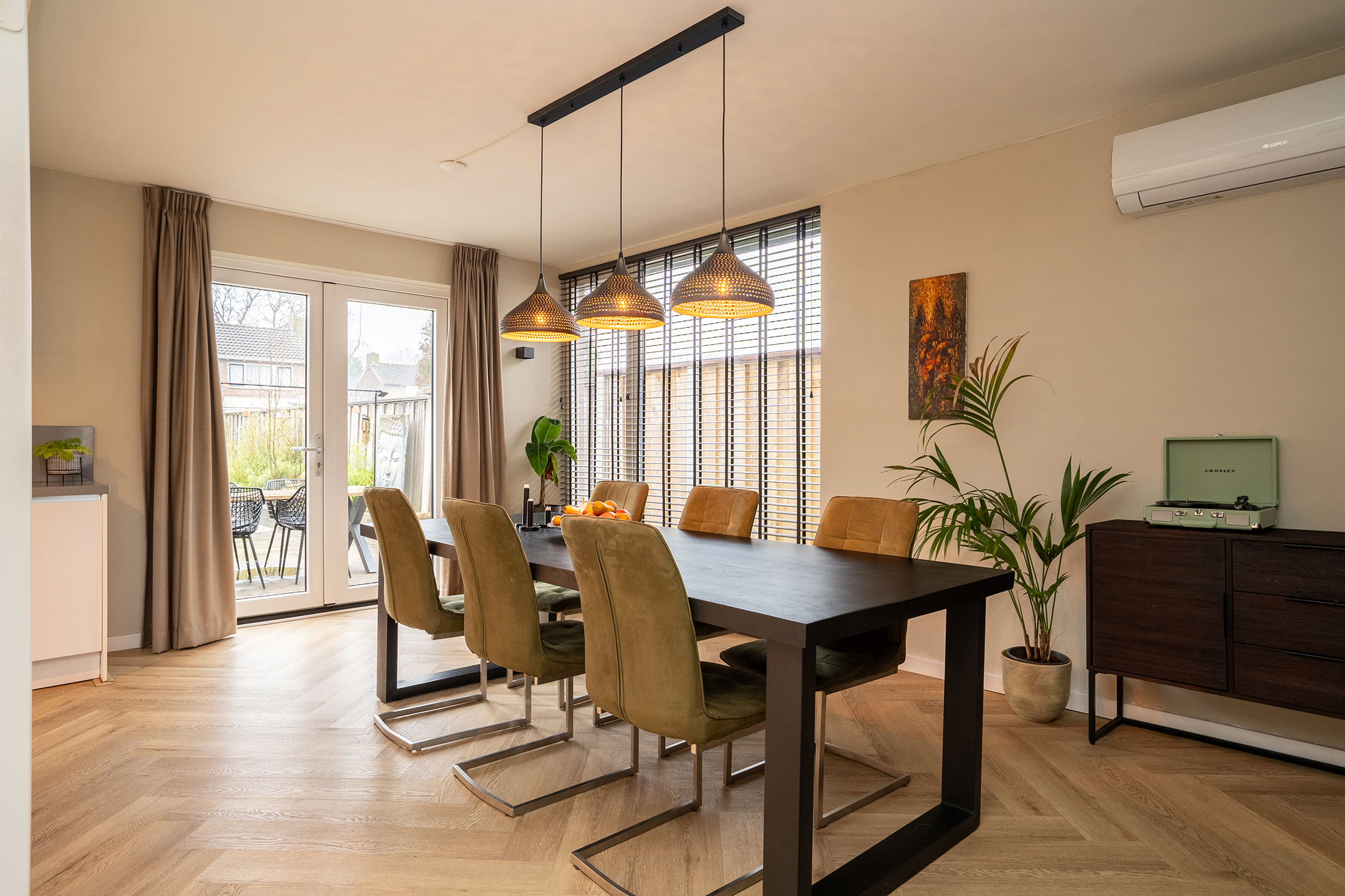Via de openslaande deuren is er toegang tot de tuin, waardoor binnen en buiten op een prettige manier in elkaar overlopen.