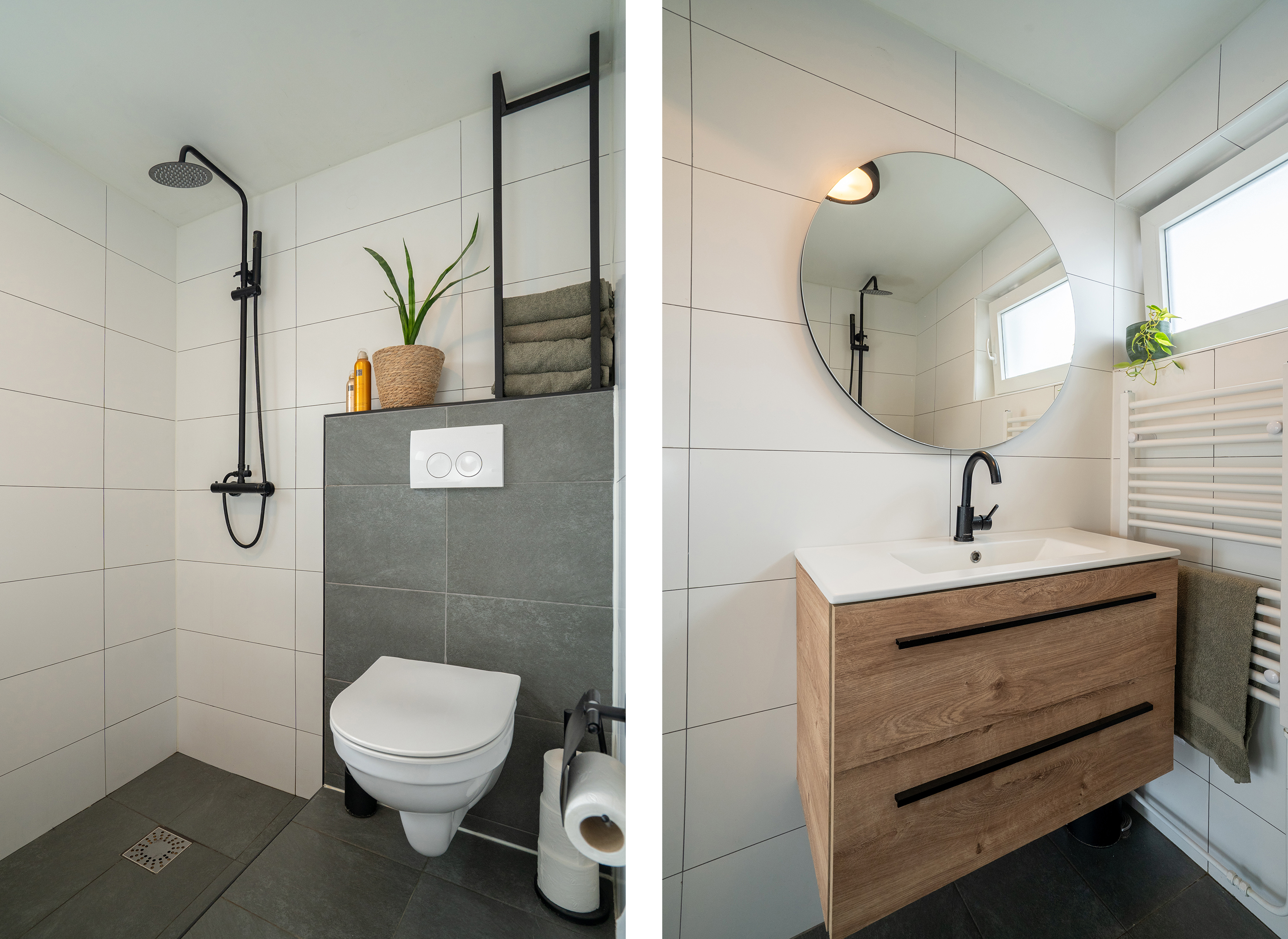 De badkamer is in 2022 volledig vernieuwd en uitgevoerd in een stijlvolle en eigentijdse uitstraling. De ruimte is volledig betegeld en voorzien van een inloopdouche met stortdouche en handdouche, een hangcloset, radiator en een m-odern wastafelmeubel met dubbele lades. Dankzij het raam is er bovendien prettig daglicht en natuurlijke ventilatie.