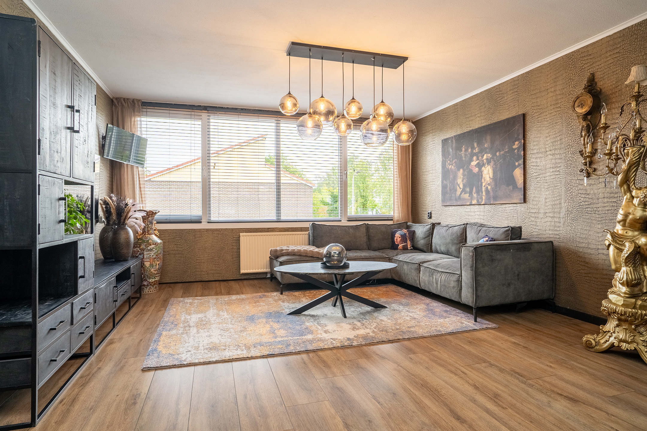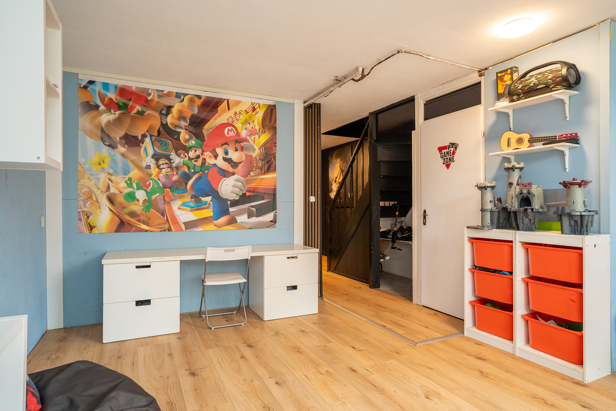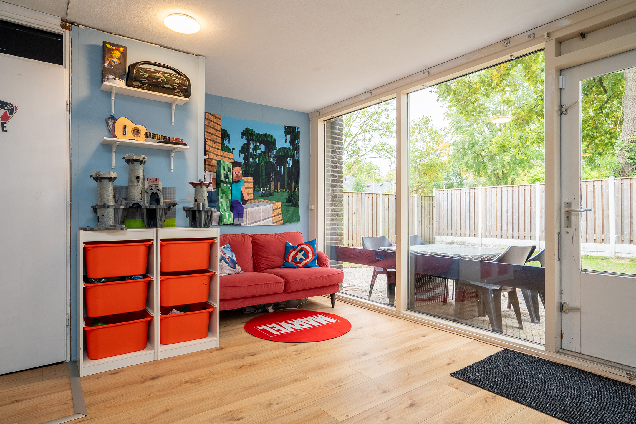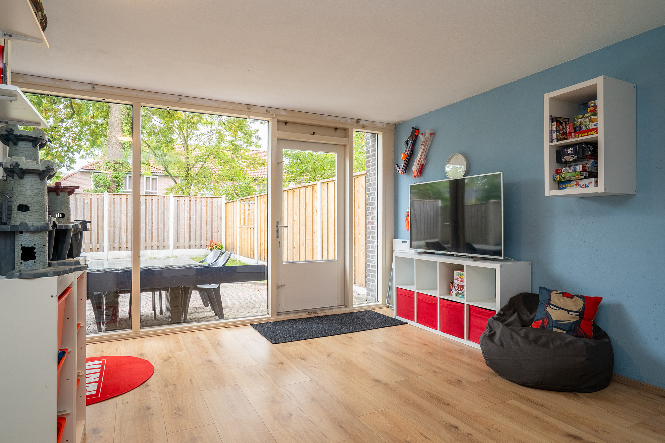 Aan de achterzijde bevindt zich een lichte tuinkamer met een laminaatvloer en grote raampartijen, die zorgen voor veel daglicht. Vanuit deze kamer heb je direct toegang tot de achtertuin. Deze ruimte is multifunctioneel en kan bijvoorbeeld worden gebruikt als speelkamer, werkkamer of extra zitkamer.