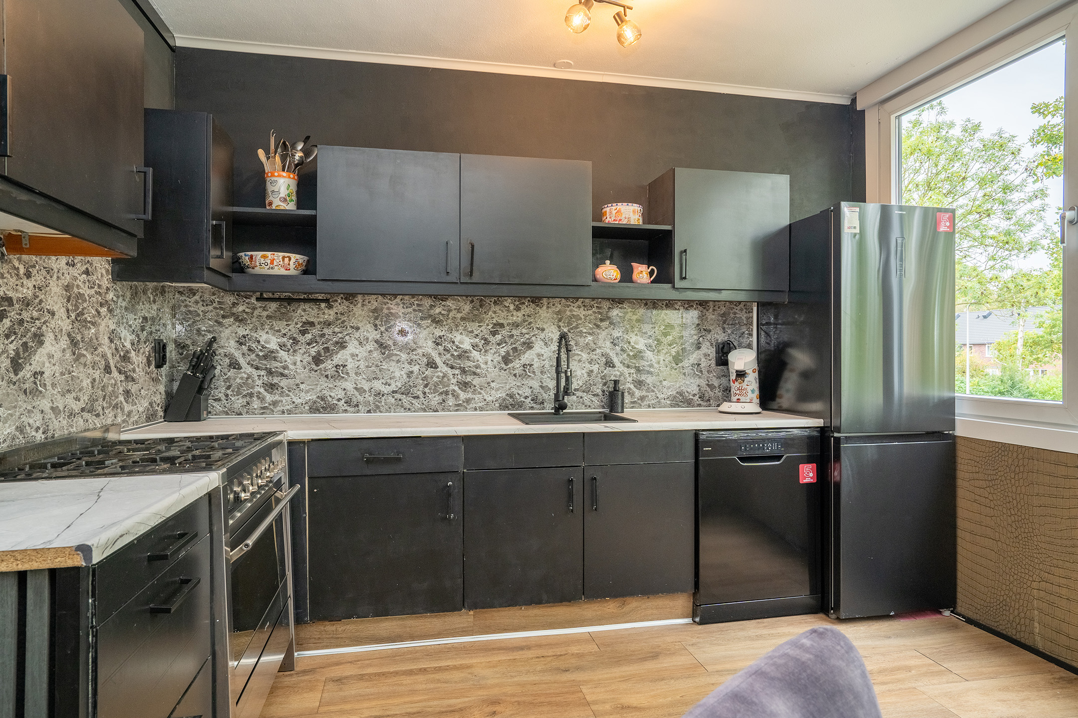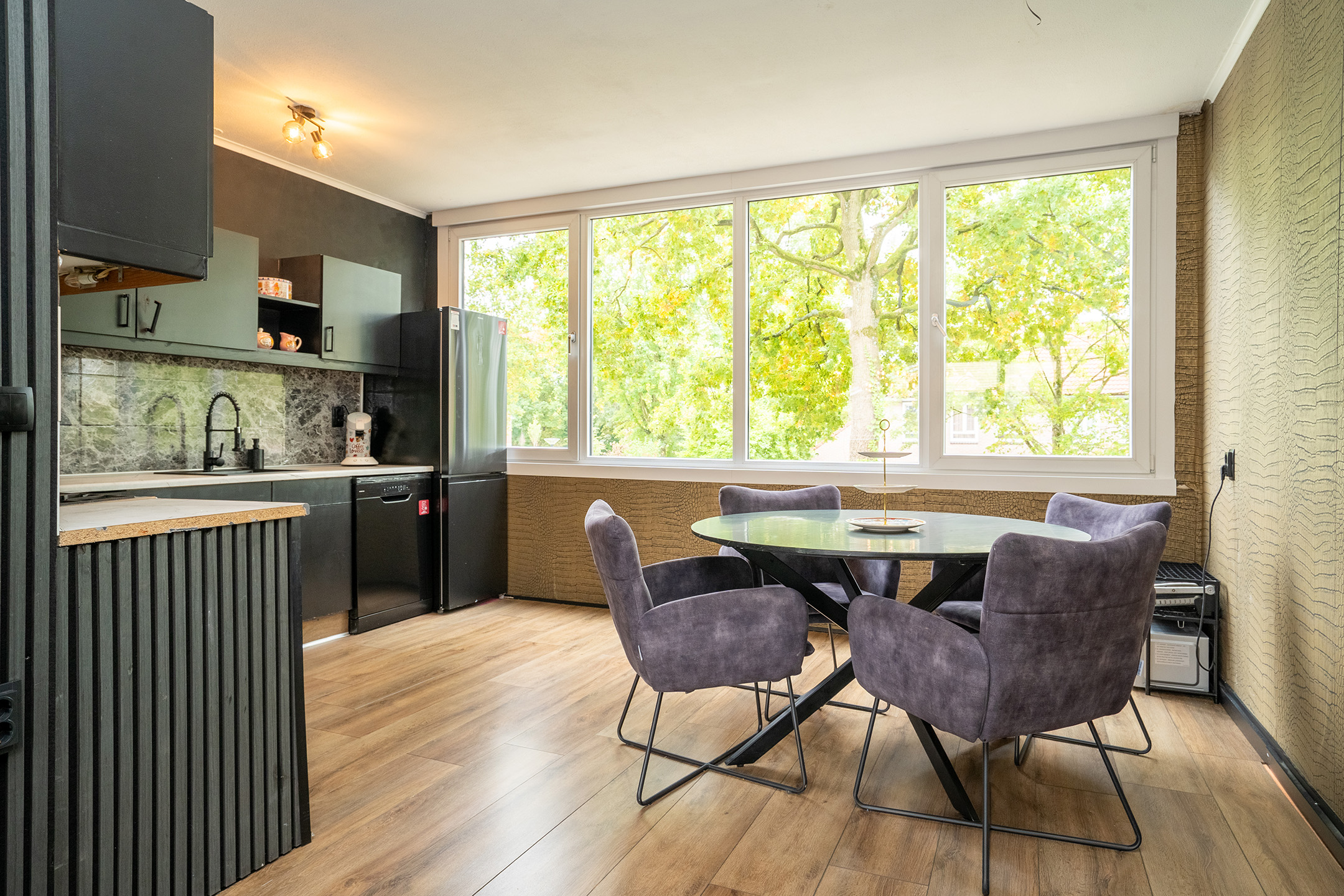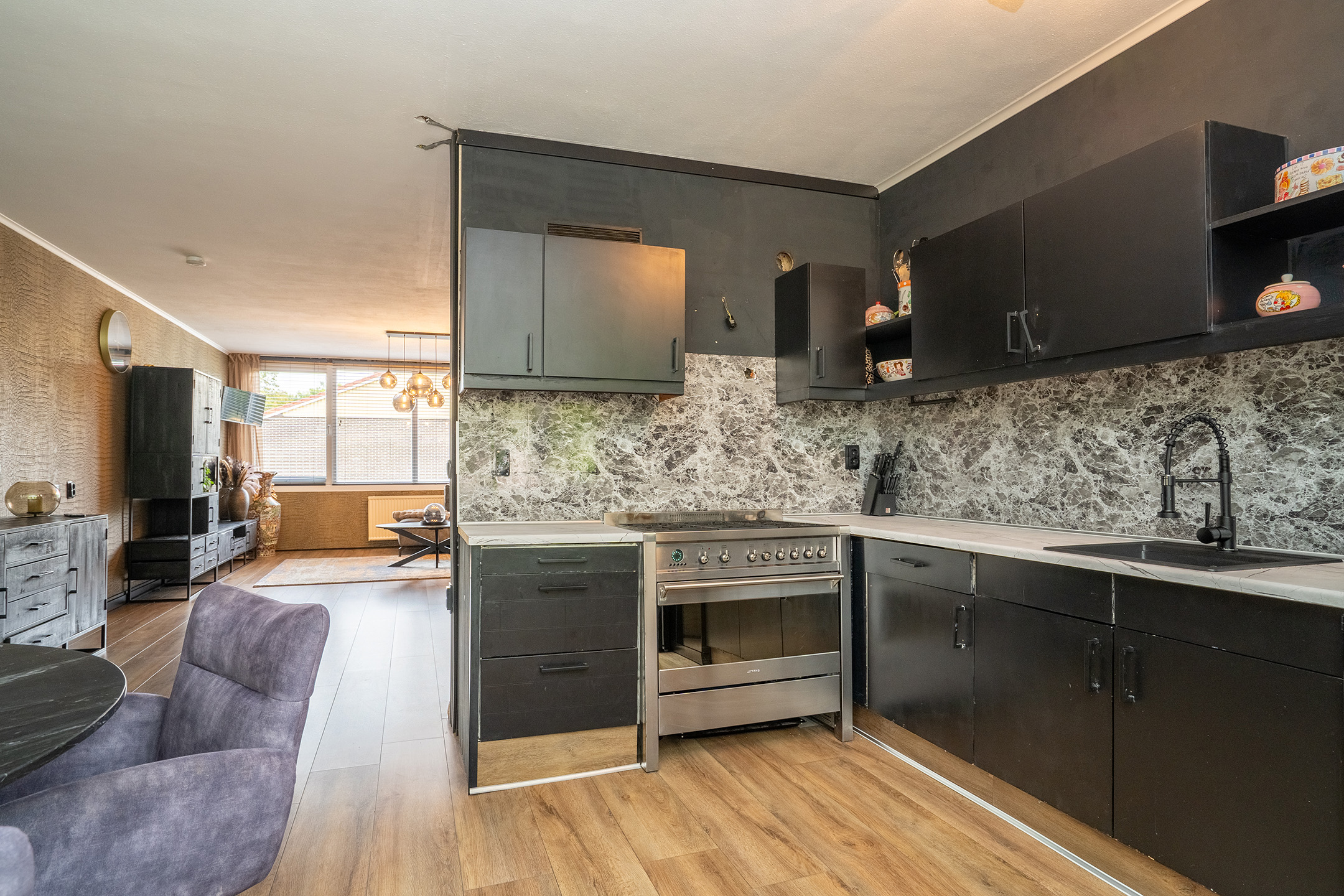Aan de achterzijde vind je de keuken met eethoek. Er is volop ruimte voor een eettafel waar je gezellig kunt dineren of borrelen met vrienden en familie.