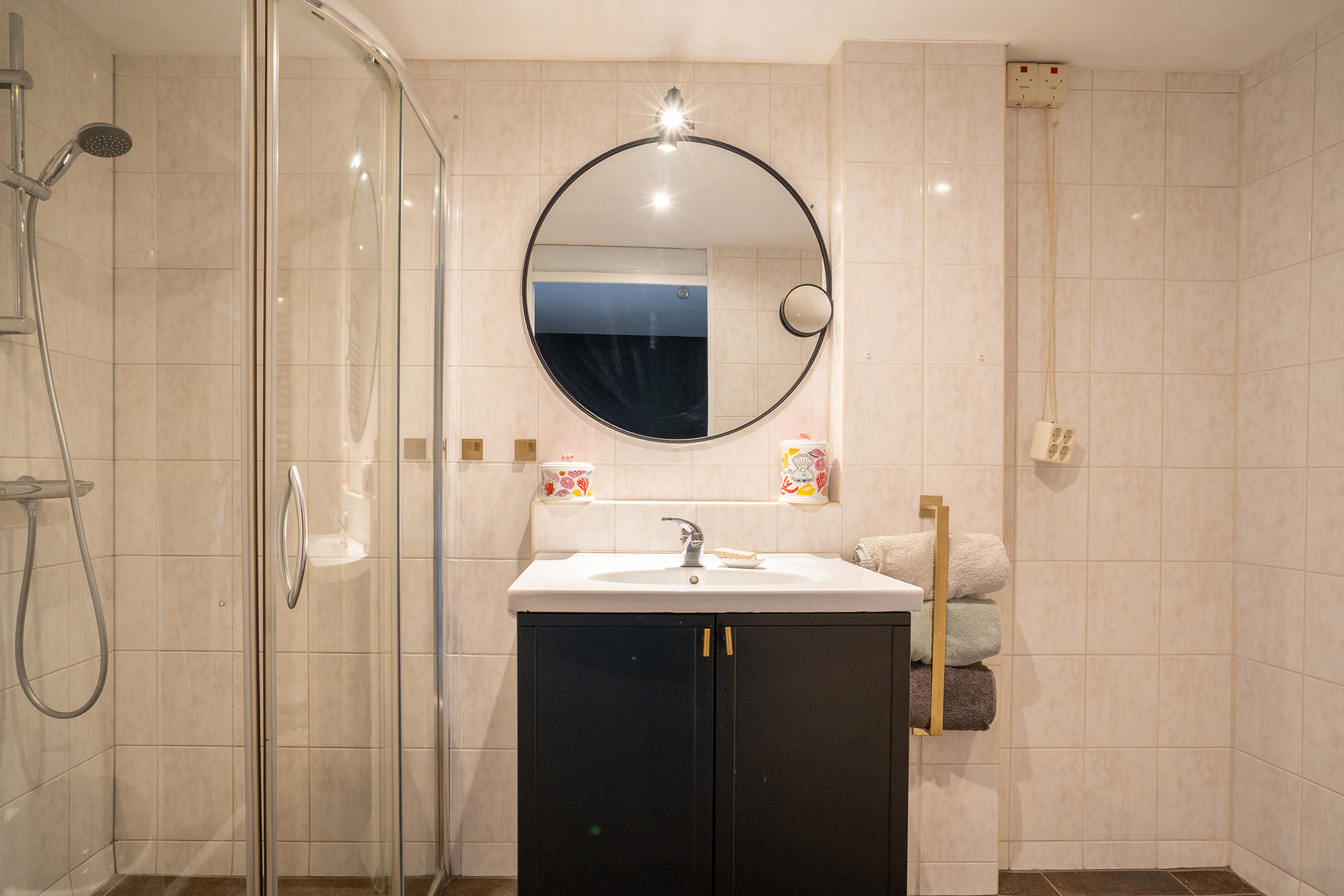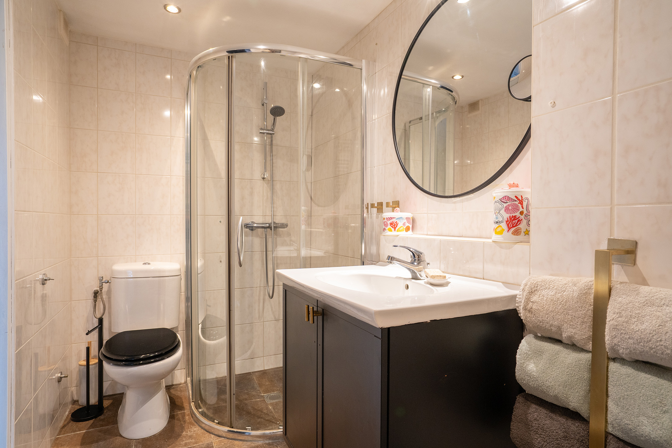 De geheel betegelde badkamer is uitgerust met een douchecabine, een wastafelmeubel met spiegel en een tweede toilet.