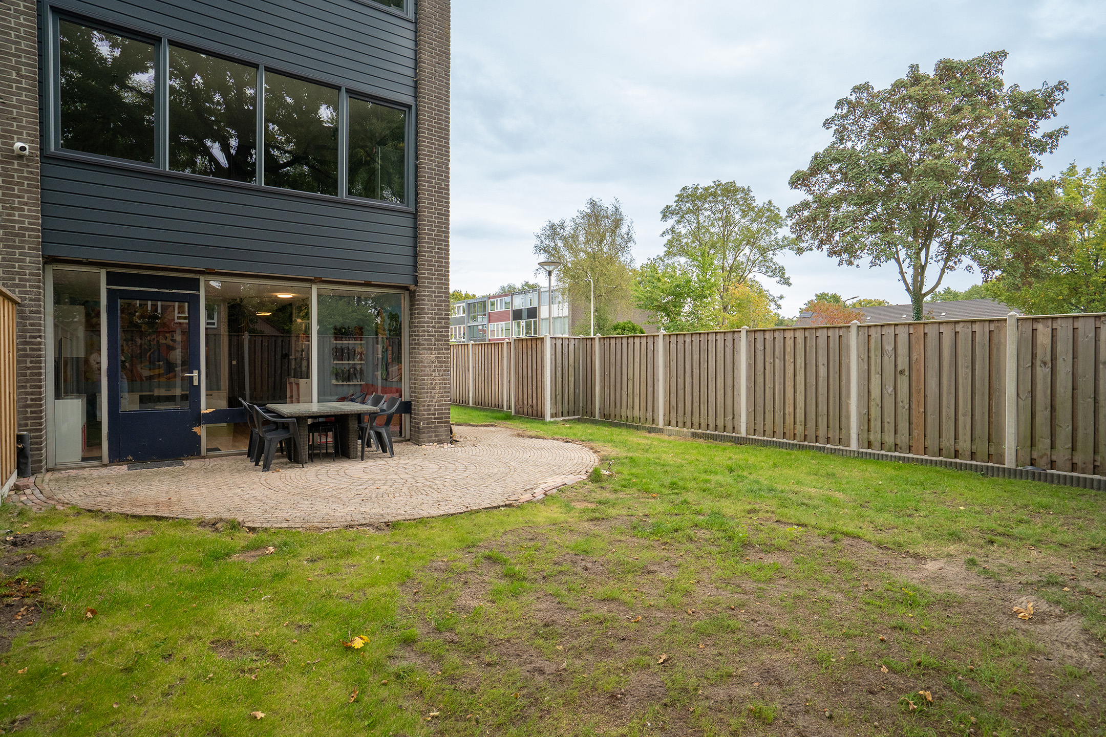 Via de zijkant van de woning is er een eigen achterom, waardoor je de tuin gemakkelijk kunt bereiken zonder door de woning te hoeven gaan.