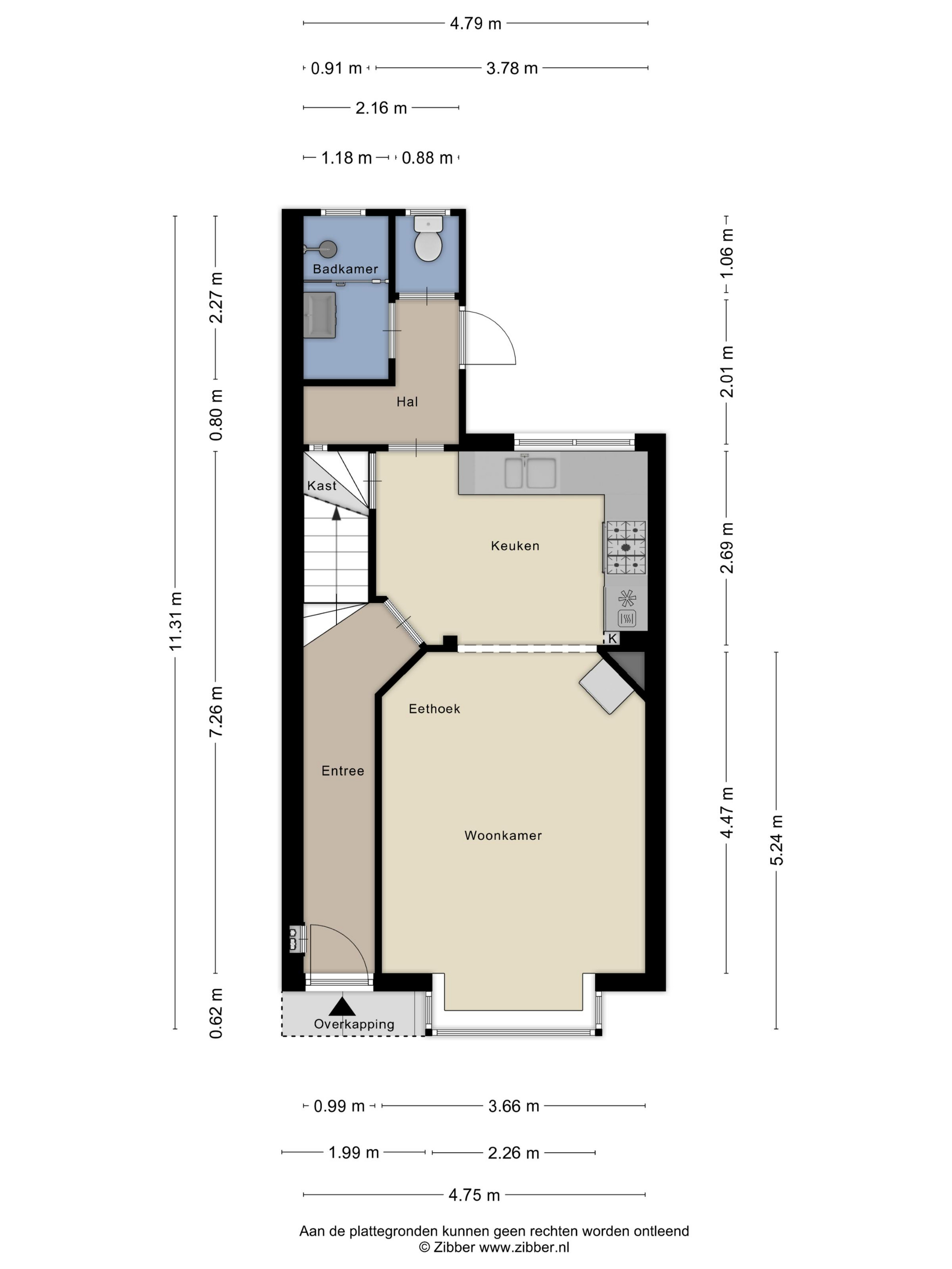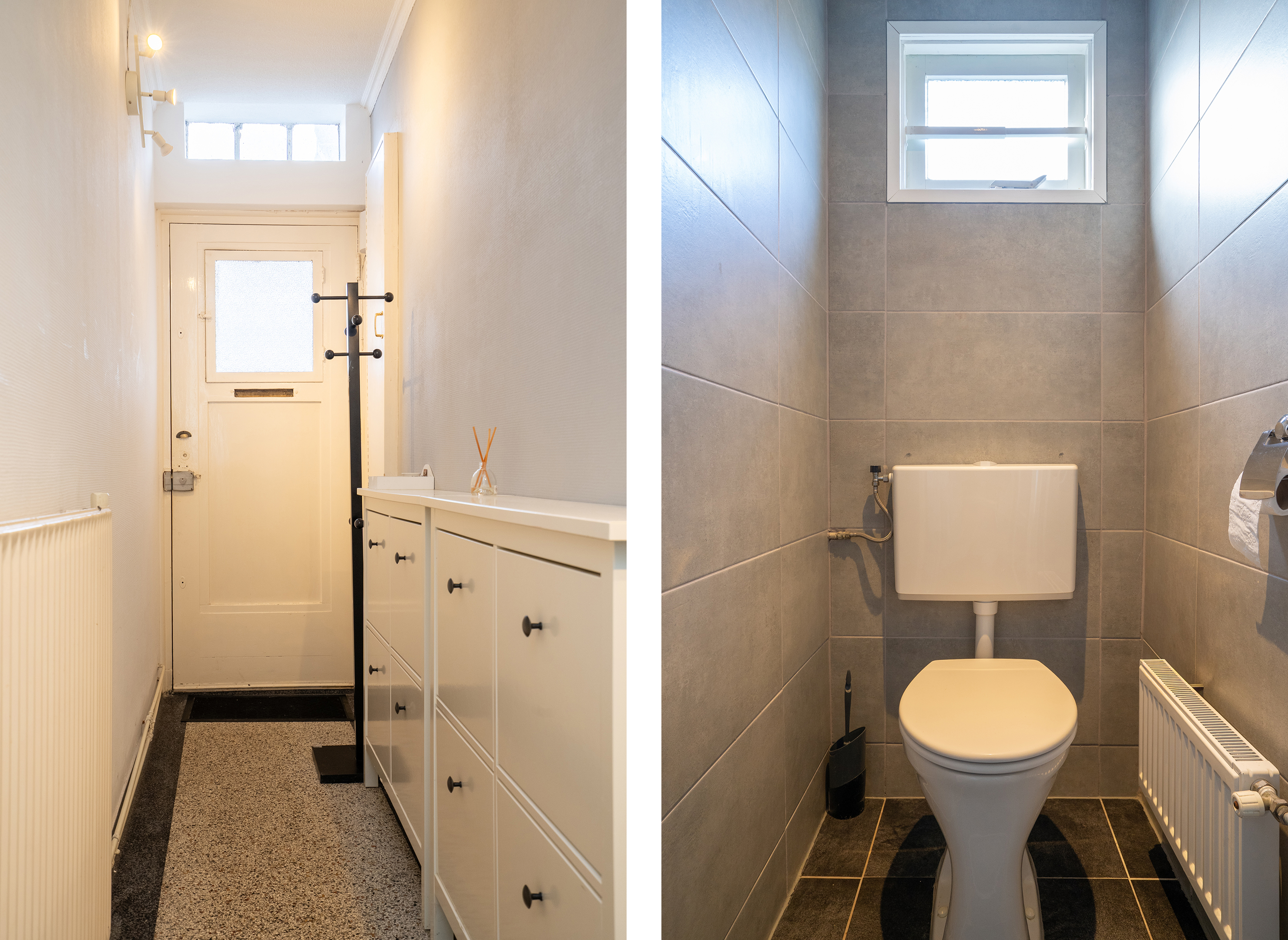 Je komt binnen in de lange hal met toegang tot de trapopgang naar de eerste verdieping en de deur naar de keuken waarbij je via de keuken toegang hebt tot woonkamer.