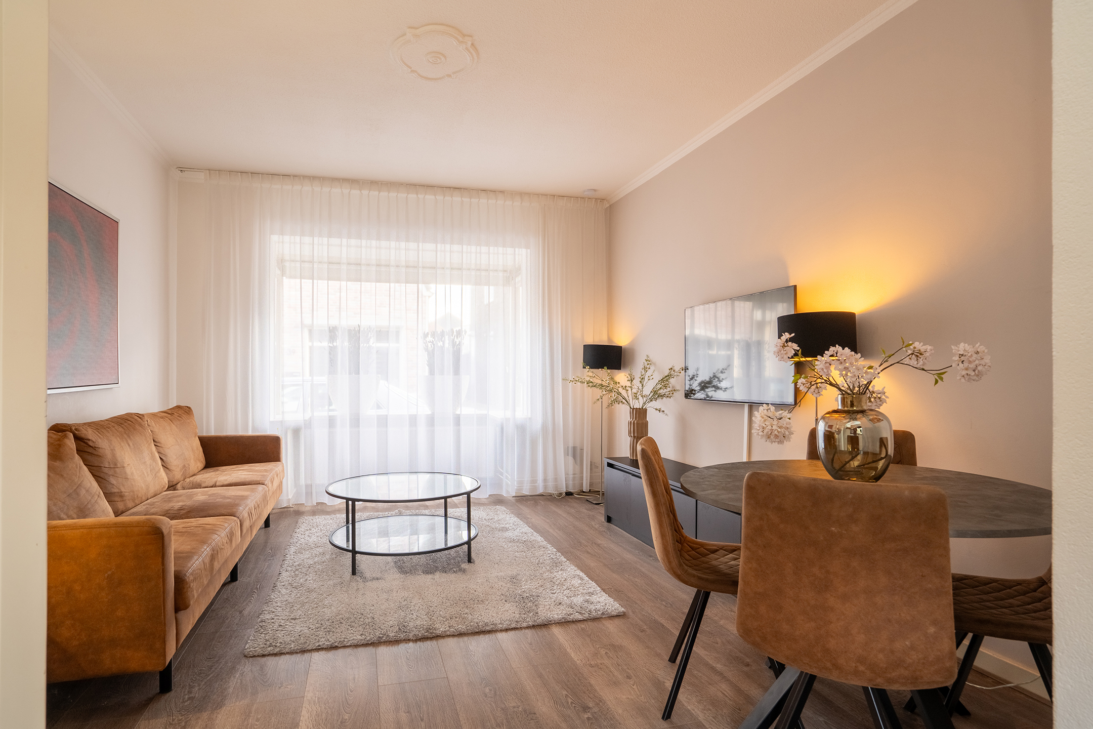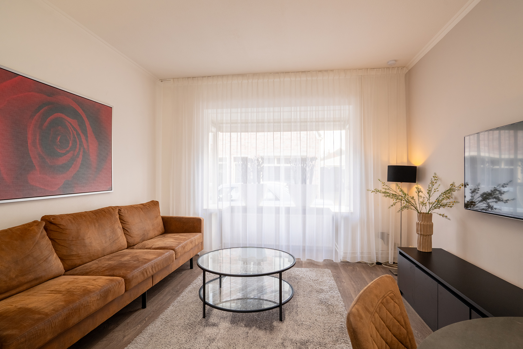 Aan de voorzijde van de woning bevindt zich de lichte en gezellige woonkamer. Dankzij de grote raampartij is er veel natuurlijke lichtinval. De afwerking is strak, met een warme vloer en neutrale tinten, wat zorgt voor een moderne en huiselijke sfeer.