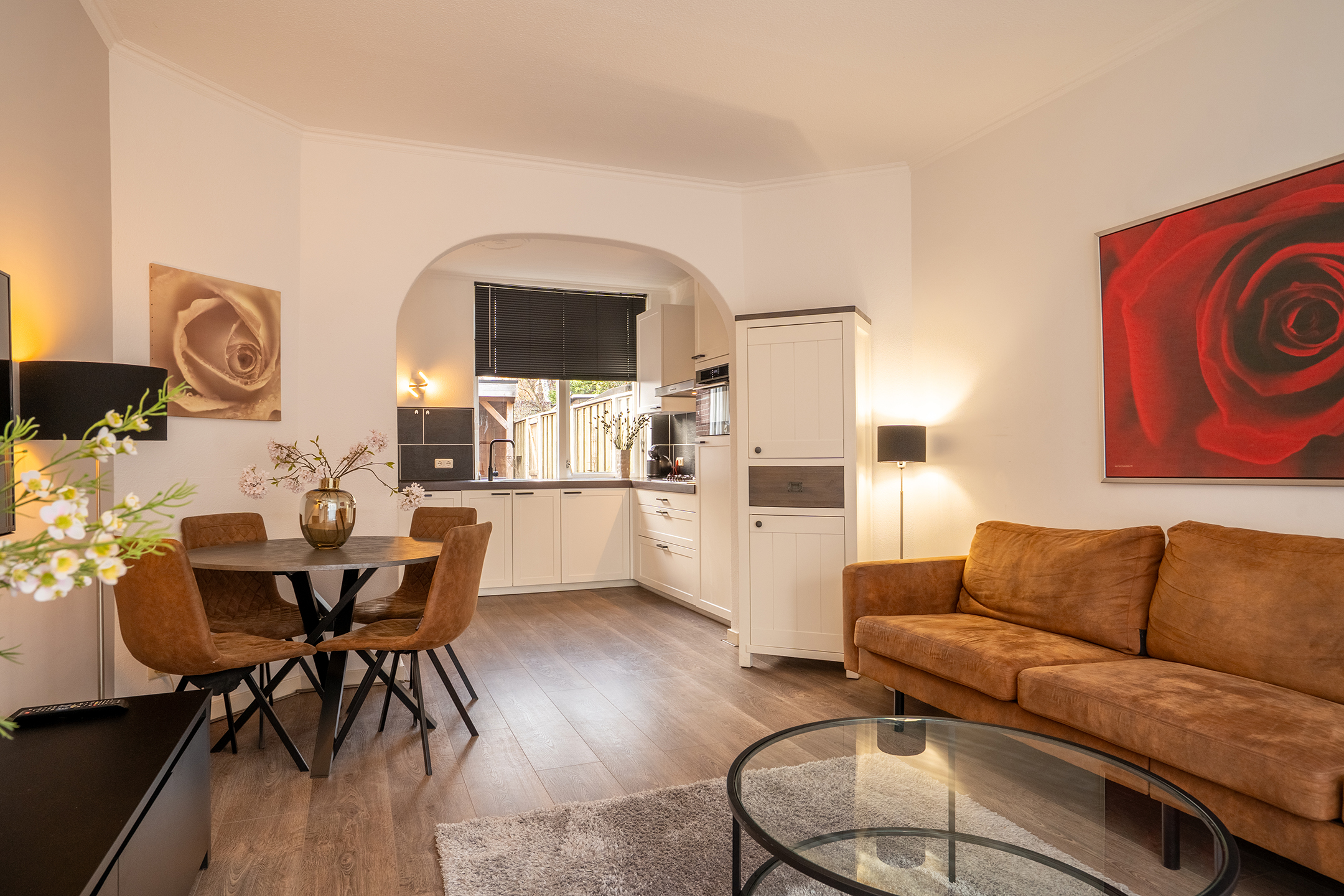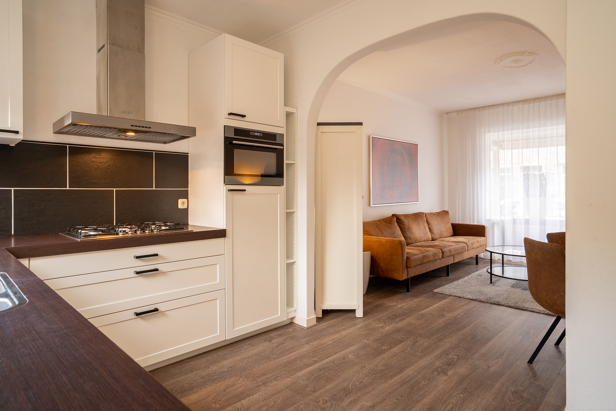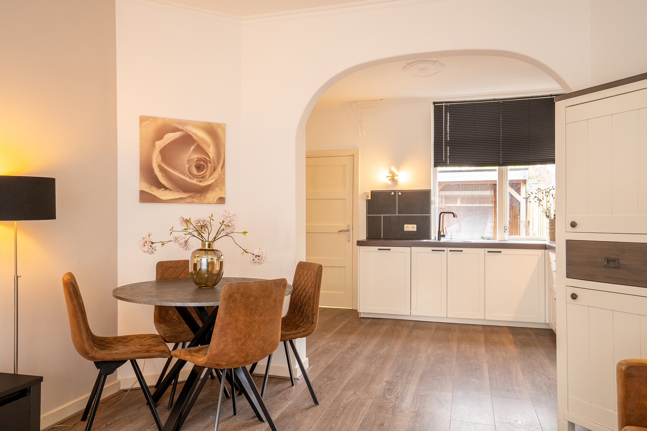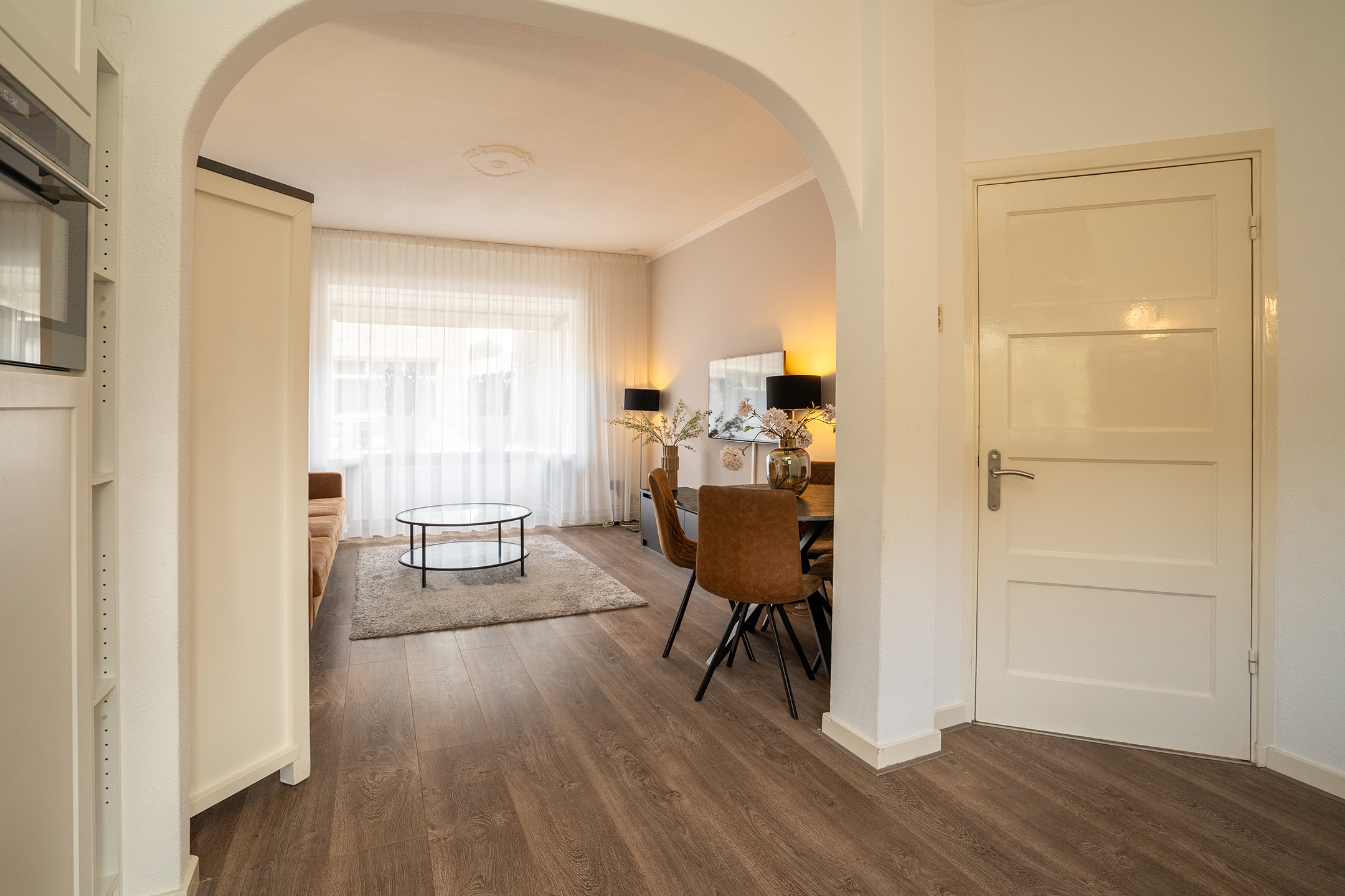 Vanuit de woonkamer heb je een mooi doorkijkje richting de keuken. Hierdoor voelt het geheel open en verbonden aan. De eethoek bevindt zich centraal tussen beide ruimtes.