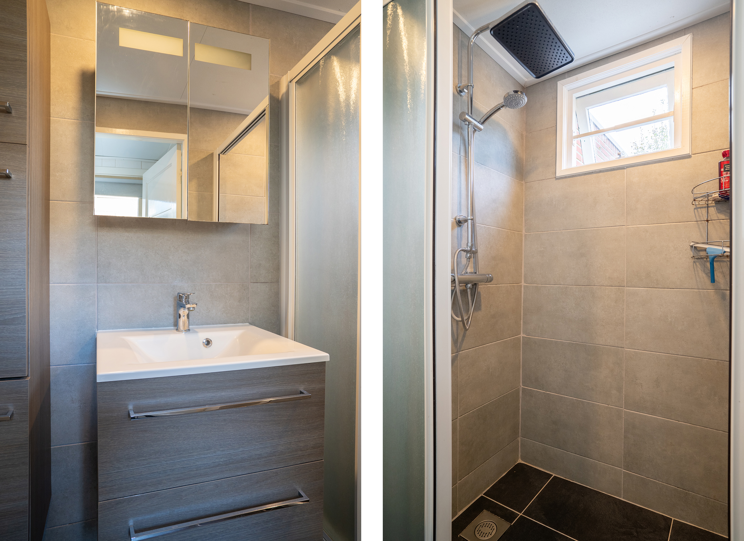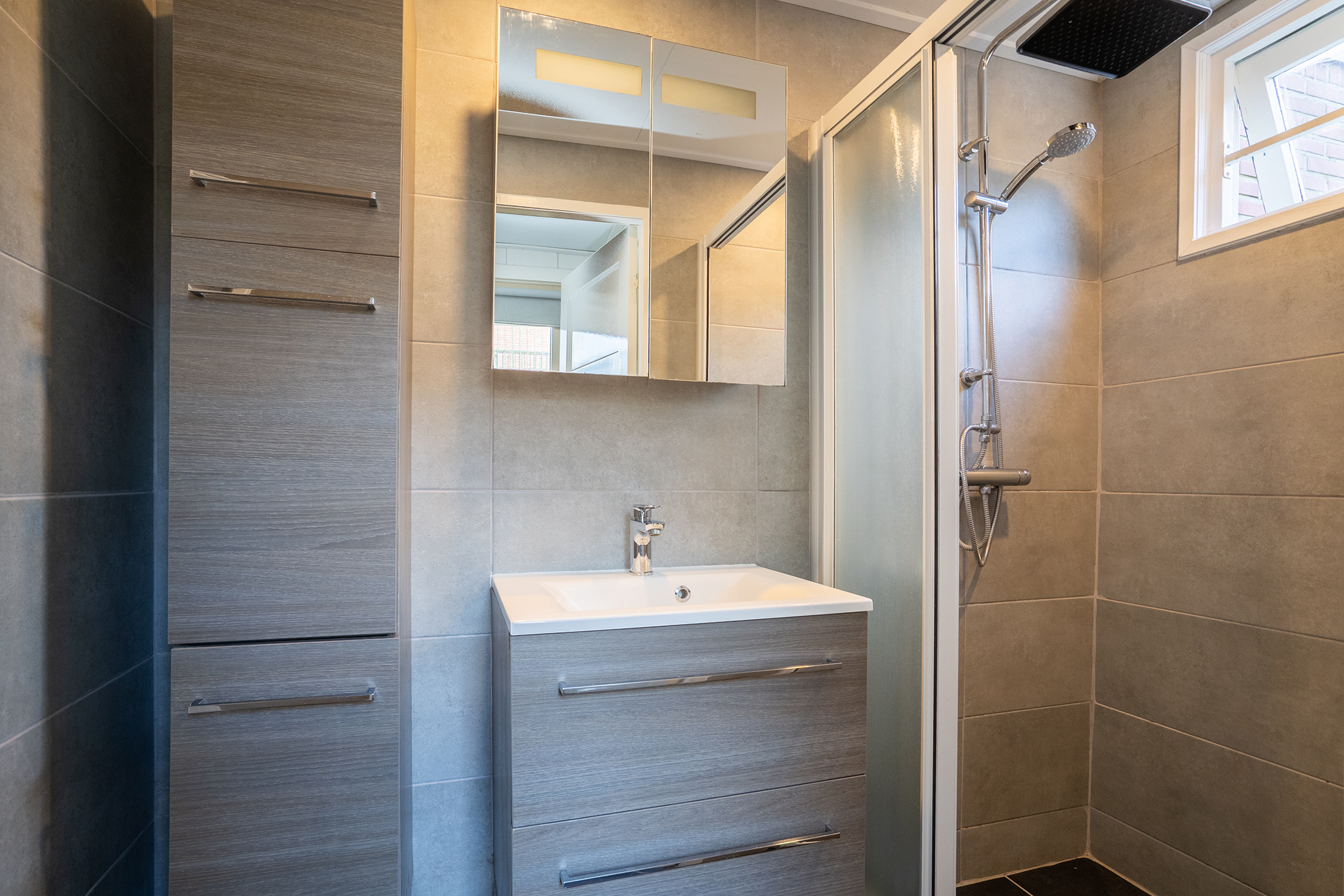 De moderne badkamer is volledig betegeld en voorzien van een inloopdouche, wastafelmeubel met spiegelkast en een extra opbergkast.