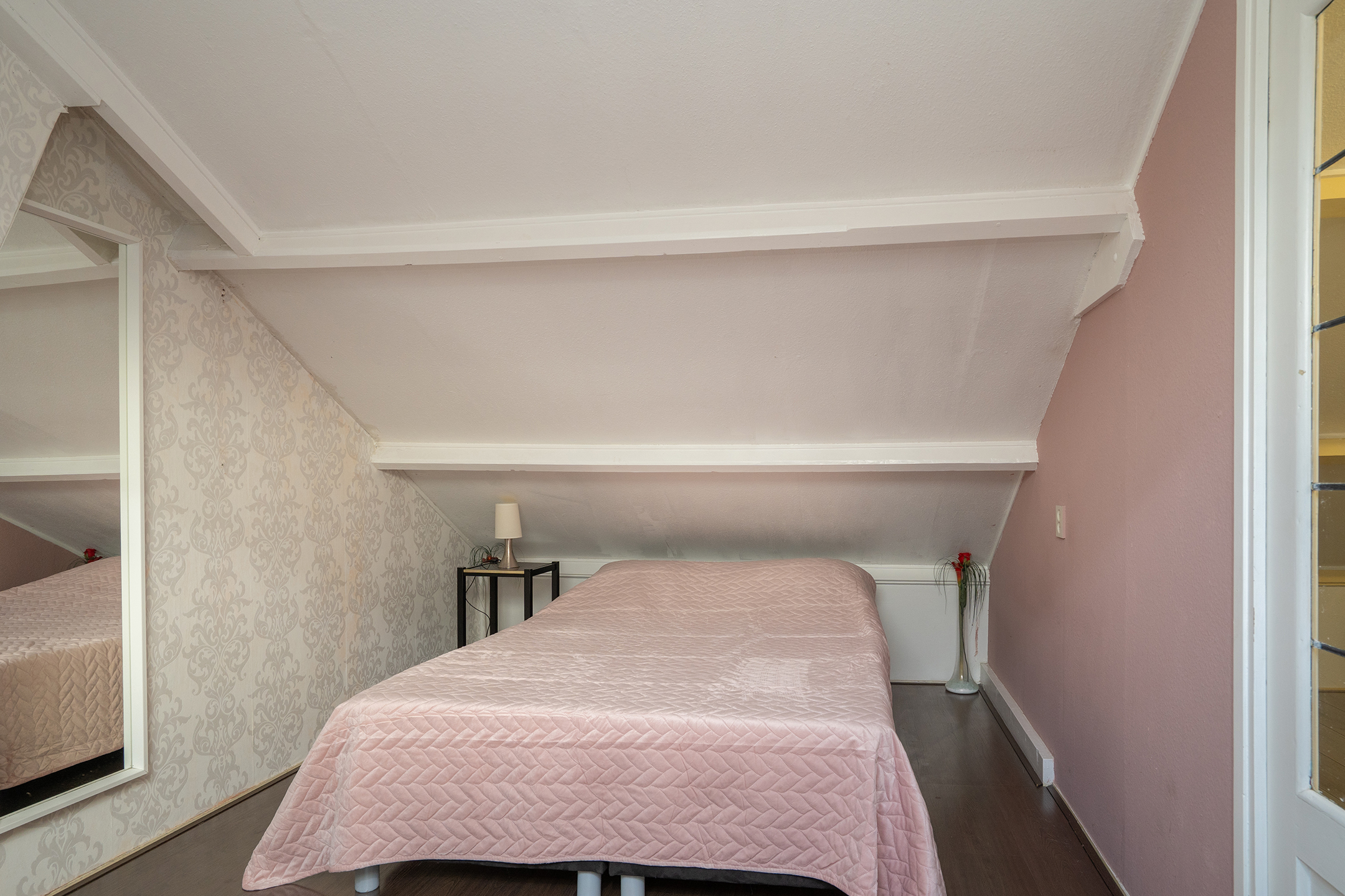 2e verdieping: Via een vaste trap bereik je de zolderverdieping. Deze ruimte is keurig afgewerkt en voorzien van een groot dakraam, waardoor er veel natuurlijk licht binnenvalt. De ruimte is nu in gebruik als extra slaapkamer, maar leent zich ook uitstekend als werk- of hobbykamer.