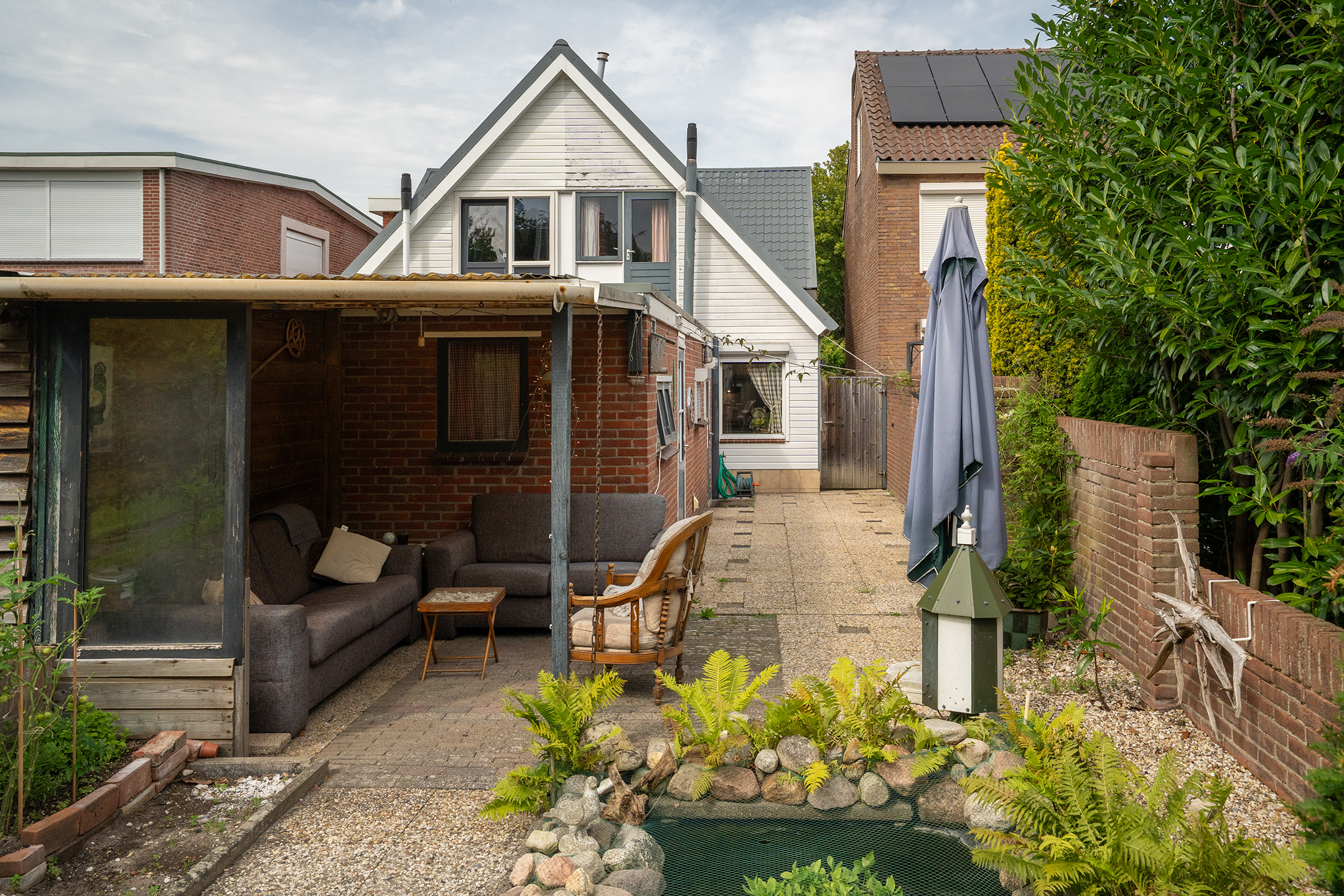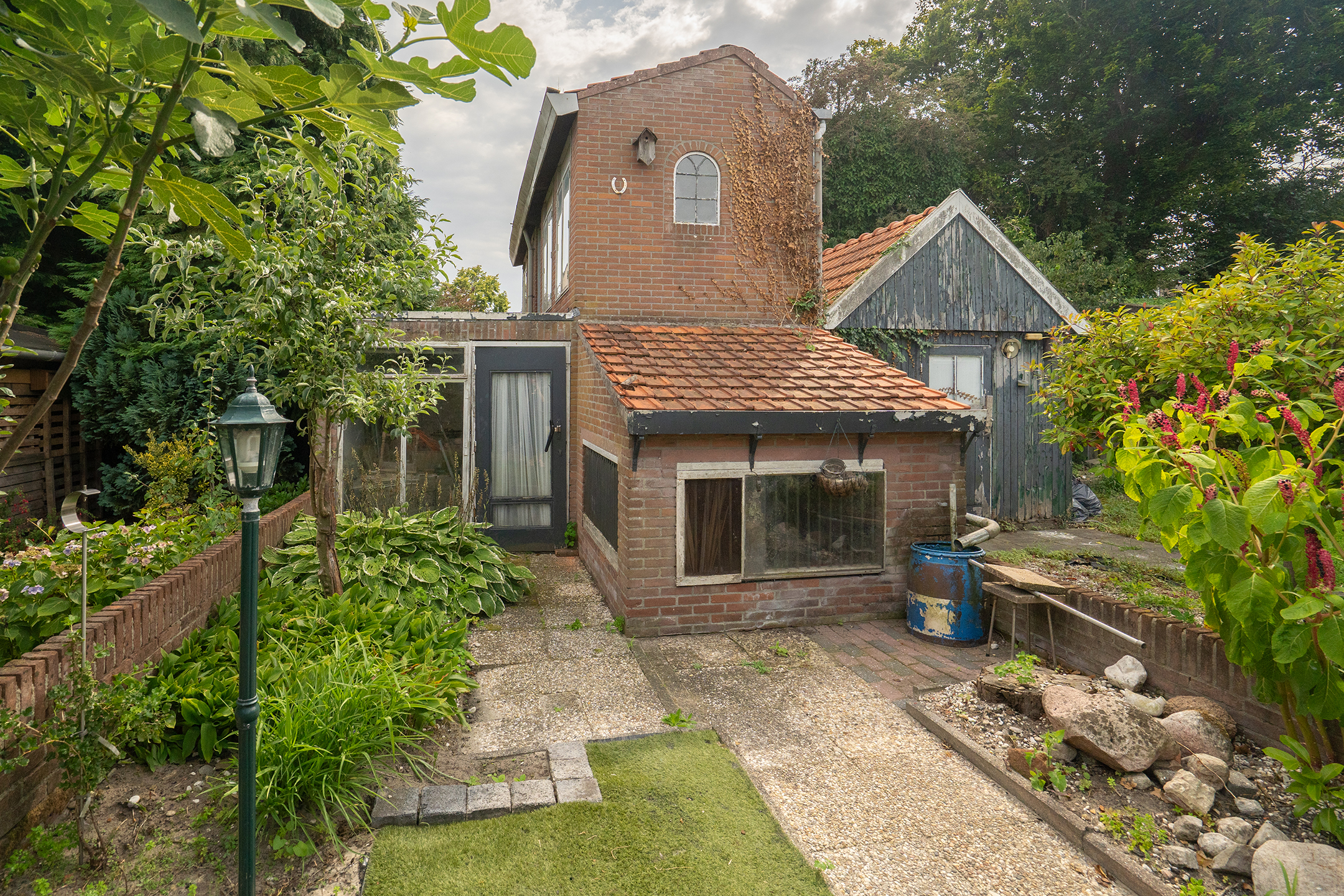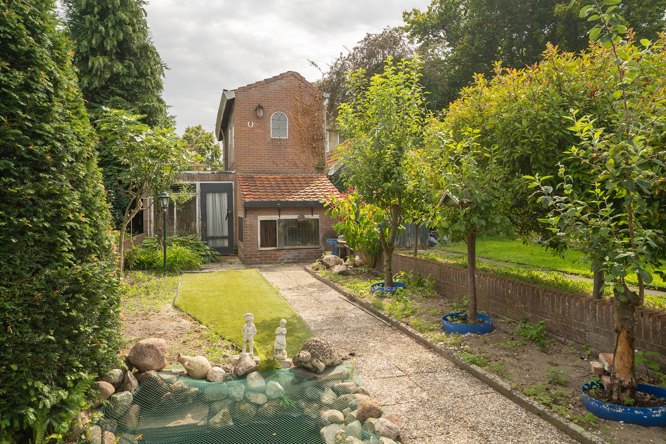 Tuin: diepe tuin op het zuiden met vijverpartij, een aangebouwde stenen berging en achterop het perceel een riante berging van ca. 60 m² (voormalig duivenverblijf).