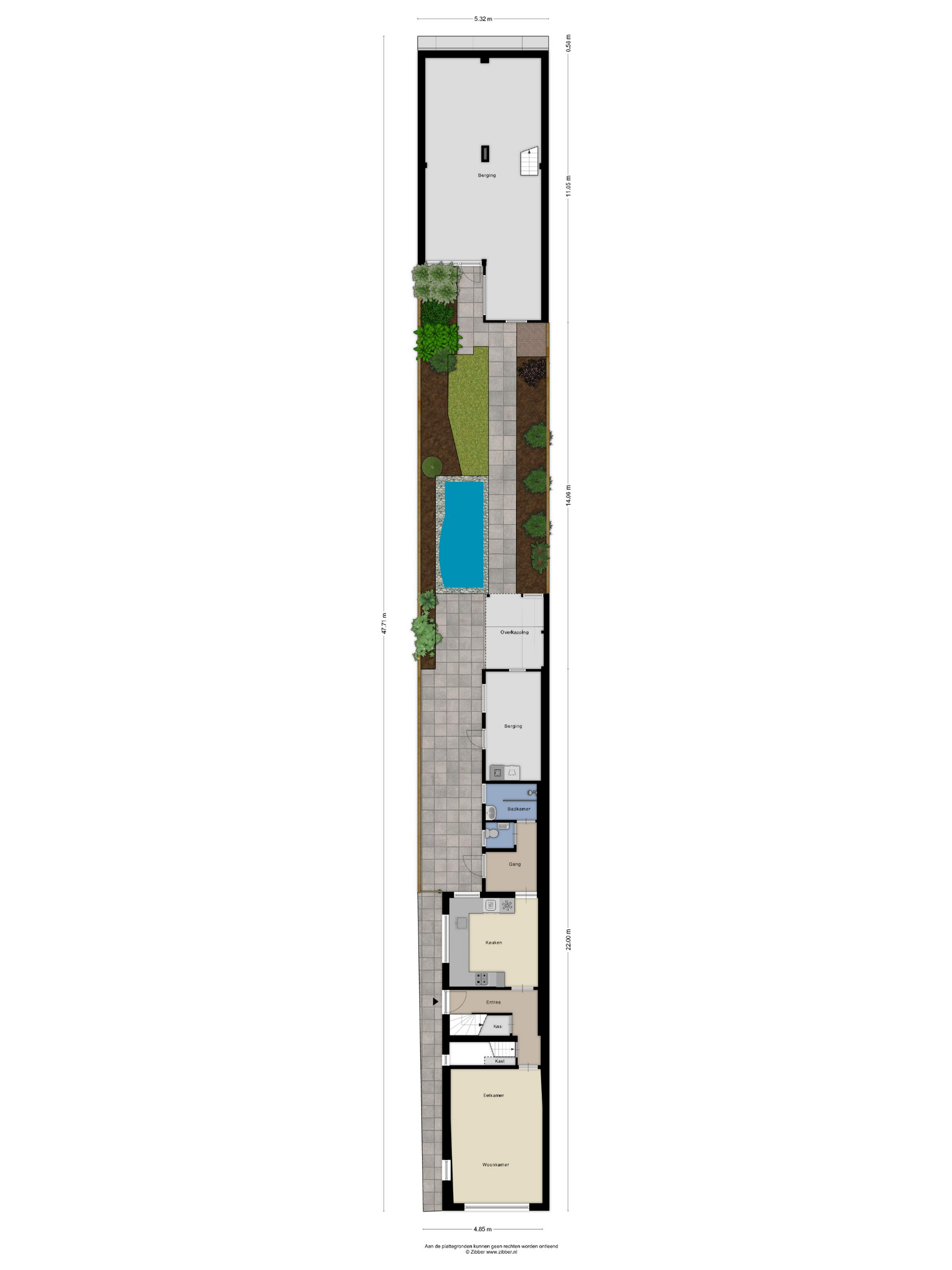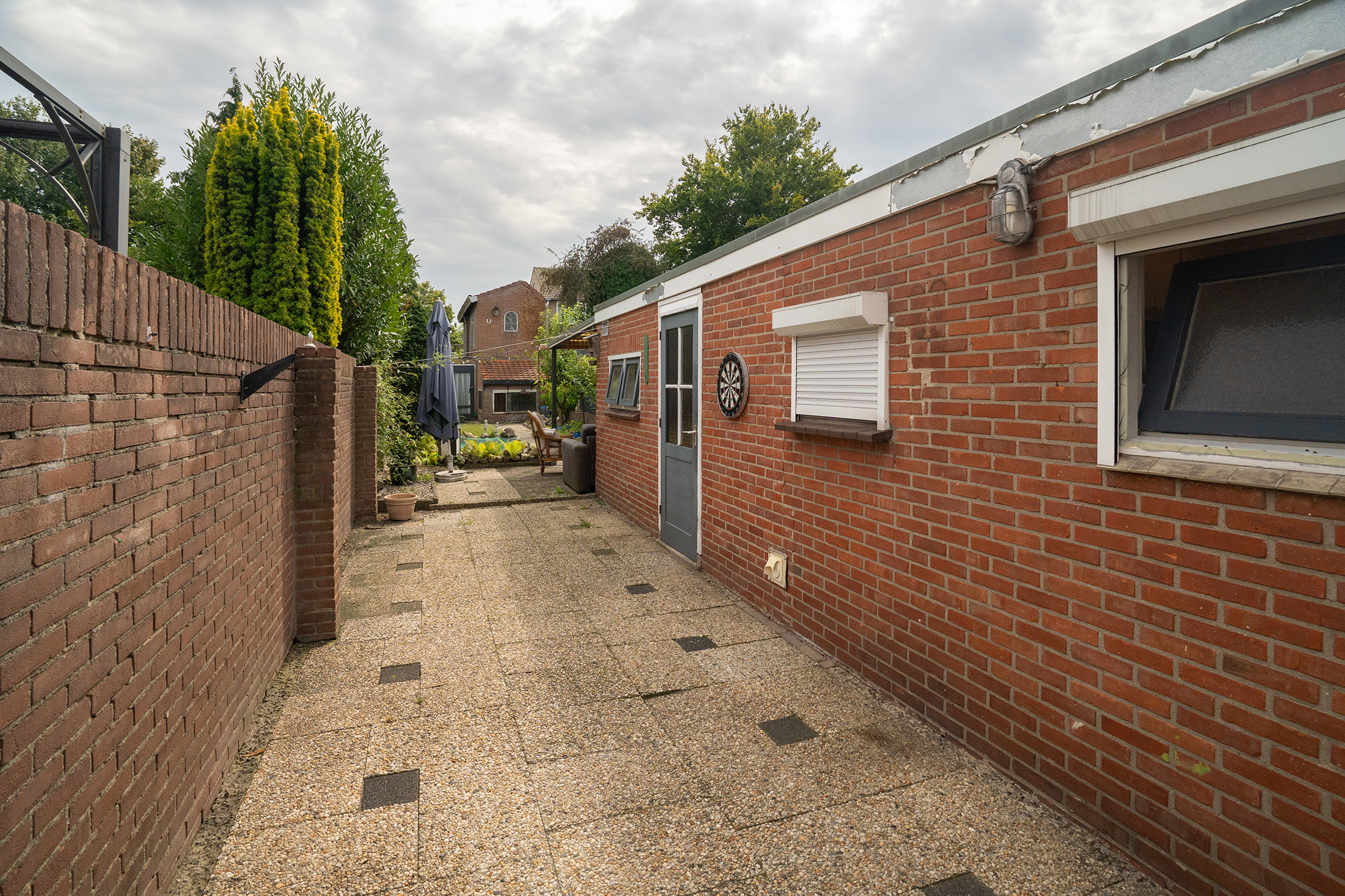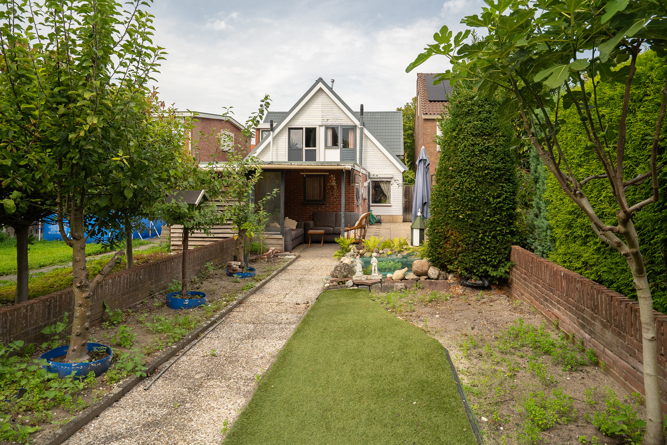 Tuin: diepe tuin op het zuiden met vijverpartij, een aangebouwde stenen berging en achterop het perceel een riante berging van ca. 60 m² (voormalig duivenverblijf).