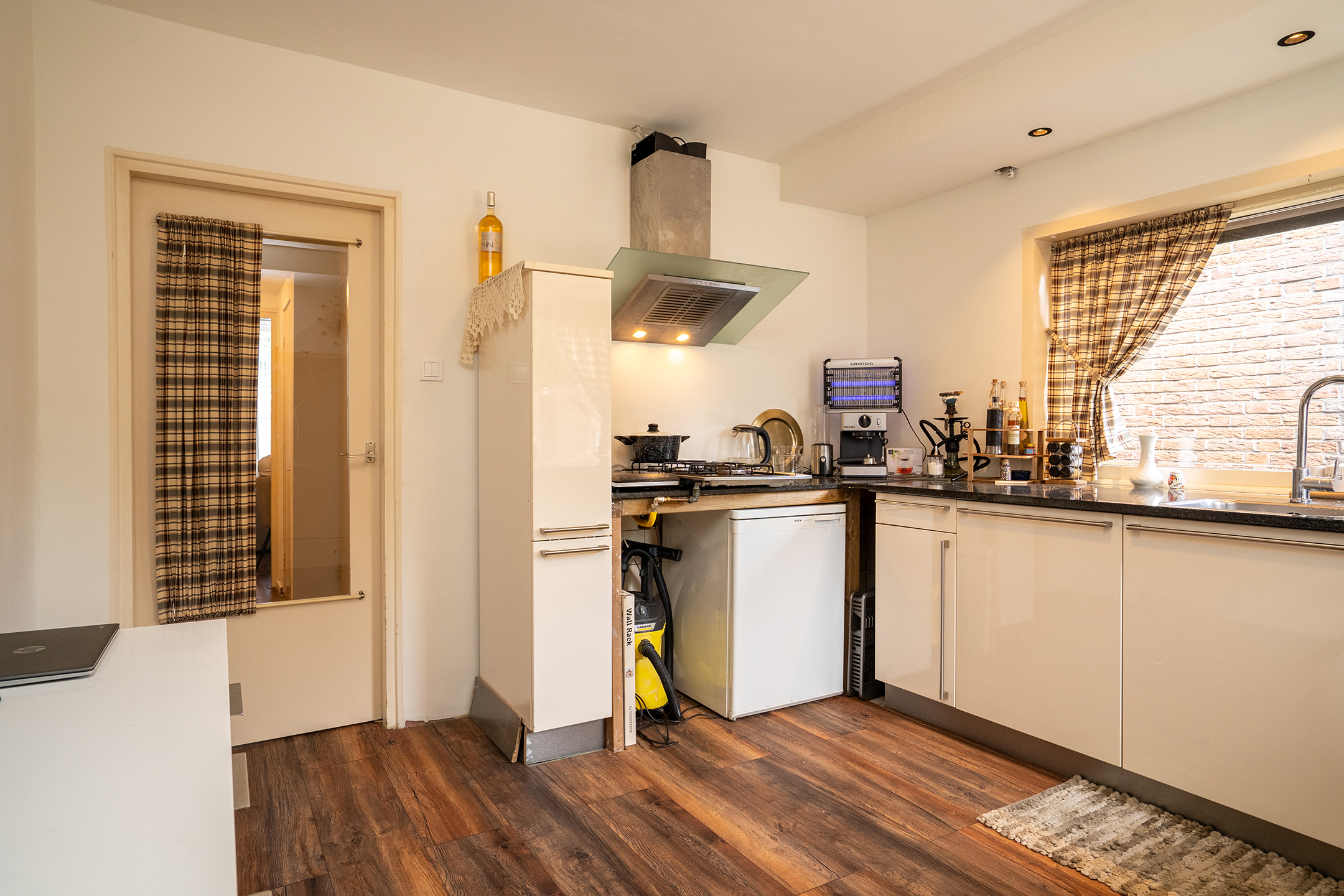 Begane grond: zij-entree/hal, trapopgang, trapkast, kelder en de woonkamer is gesitueerd aan de voorzijde van de woning. Eetkeuken met eenvoudig keukenblok met hardstenen granito blad en wasmachine- en drogeraansluiting, bijkeuken/tussenhal met opstelling cv-ketel, separaat toilet, een badkamer met ligbad, douche en een wastafel.