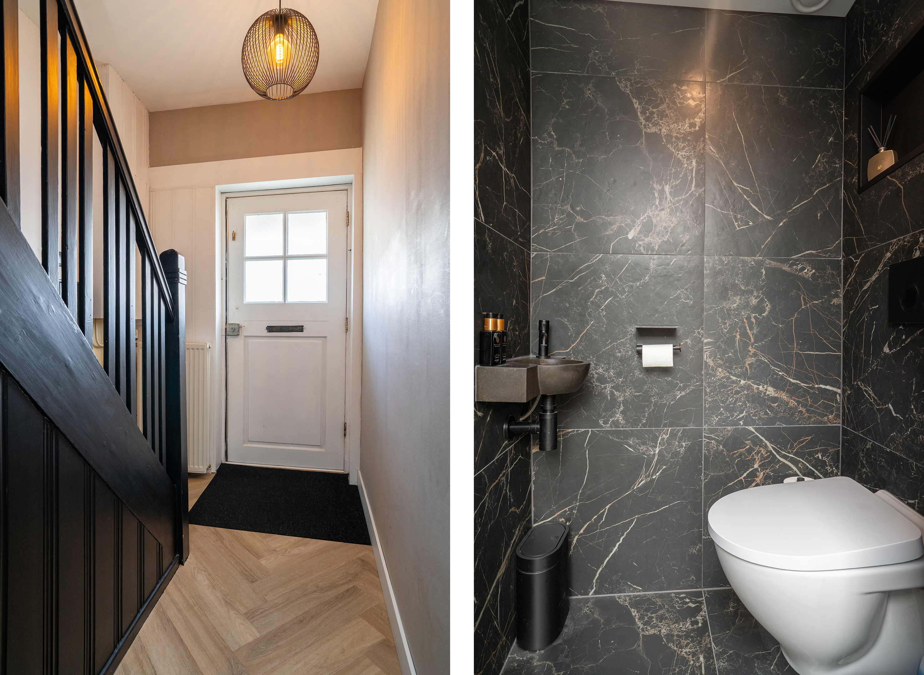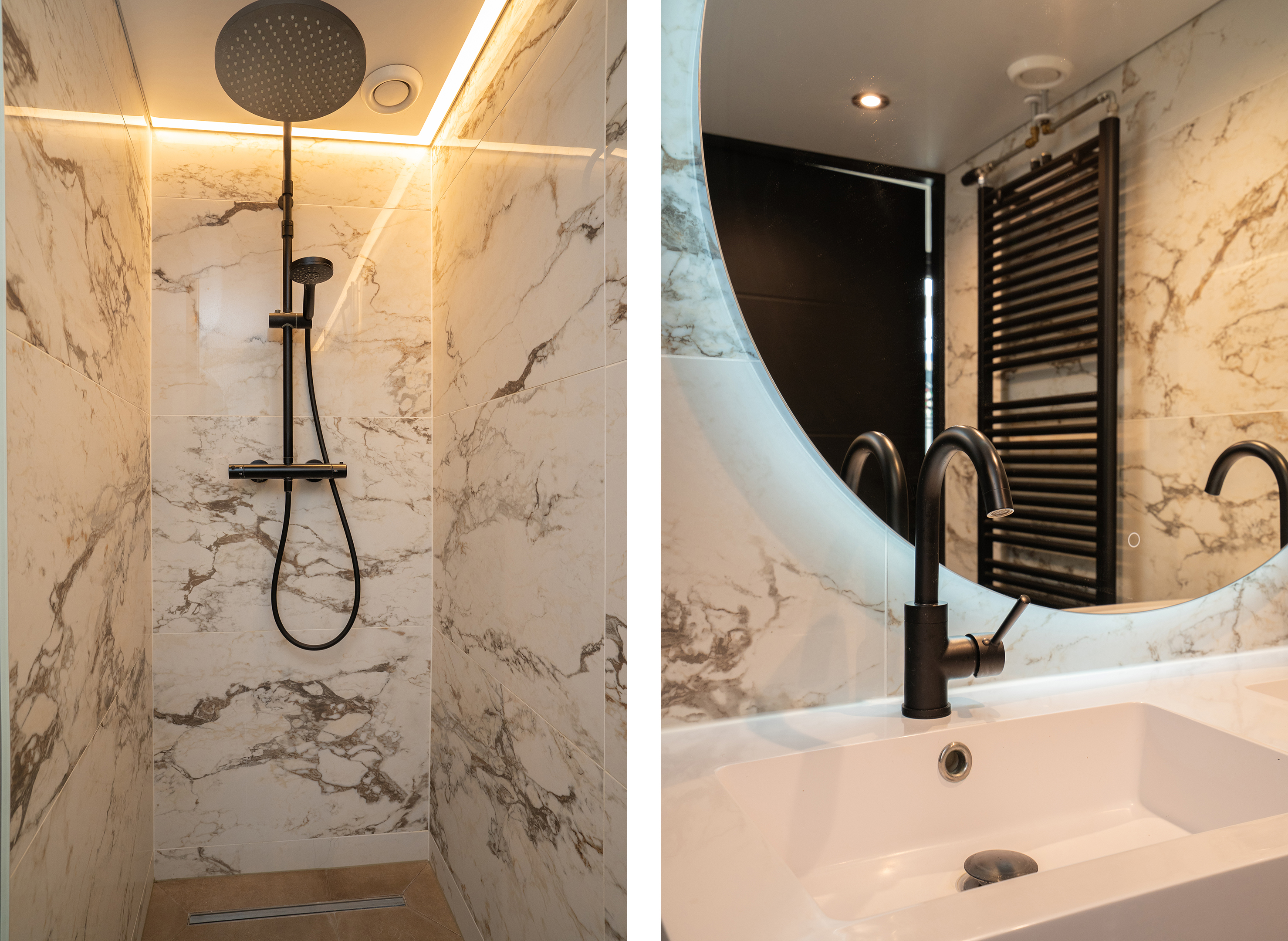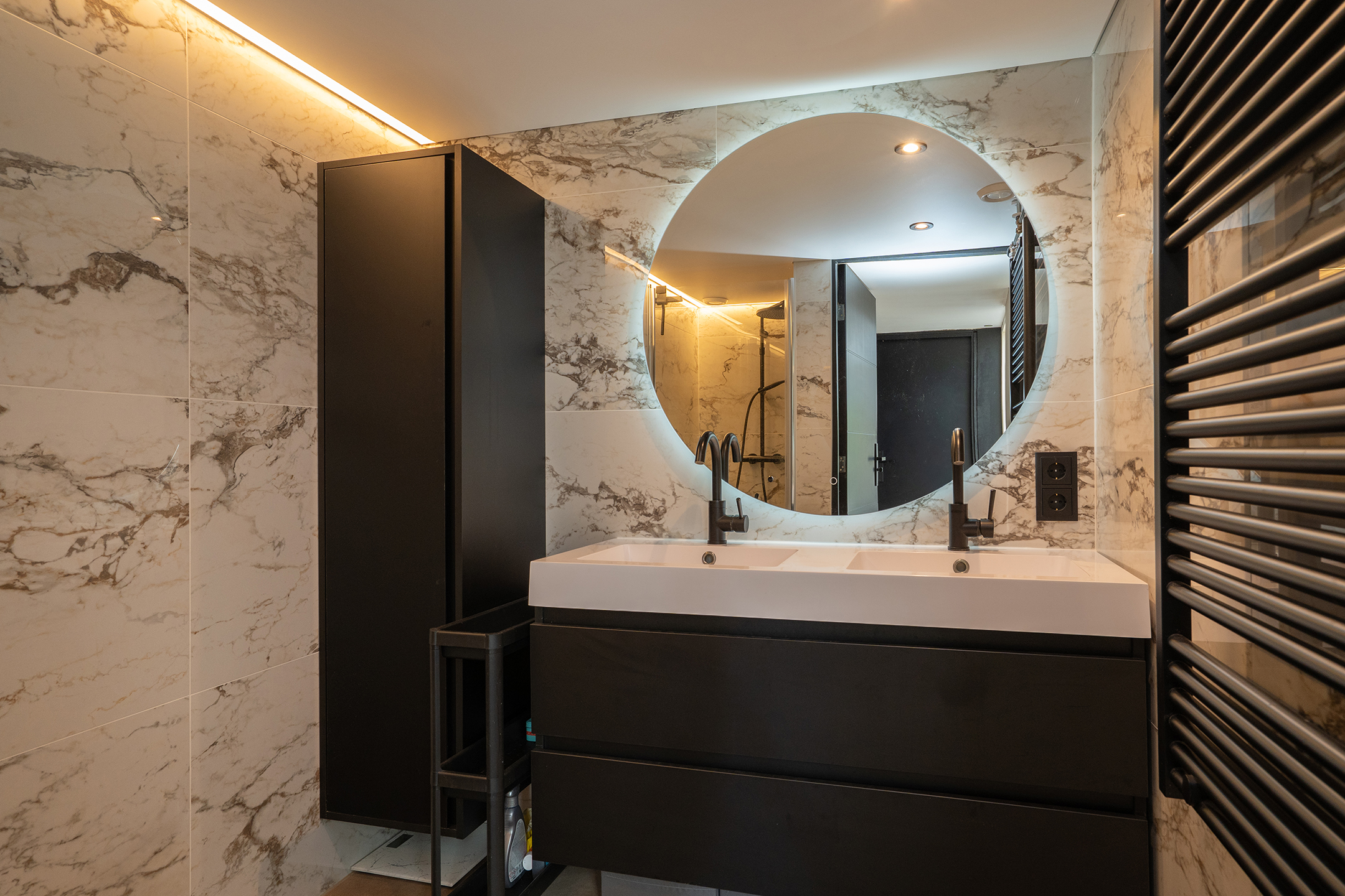 De badkamer is in 2023 volledig vernieuwd en luxe uitgevoerd. De ruimte is geheel betegeld en voorzien van een strak spanplafond met geïntegreerde (sfeer)verlichting. Daarnaast beschikt de badkamer over een stijlvolle designspiegel, een dubbele wastafel met dubbele lades en een moderne designradiator. De inloopdouche is uitgerust met zowel een handdouche als een comfortabele stortdouche. De zwarte accenten geven het geheel een moderne en luxe uitstraling.