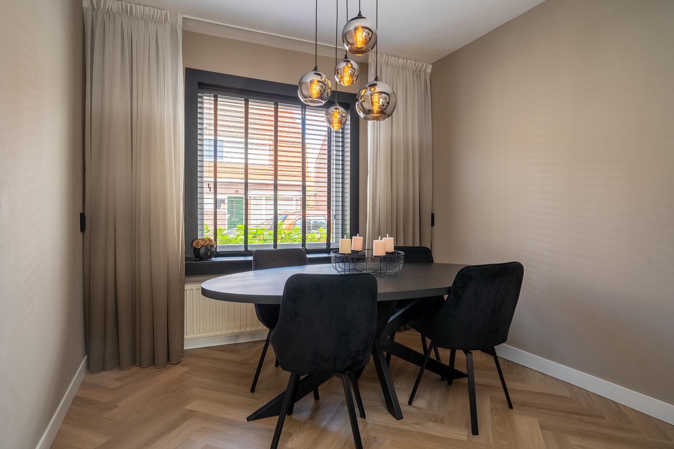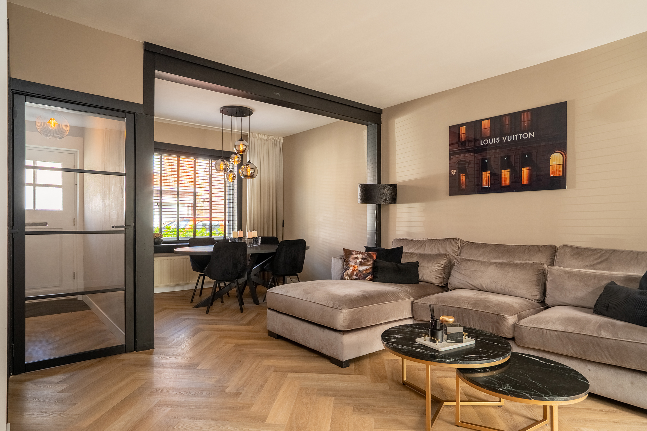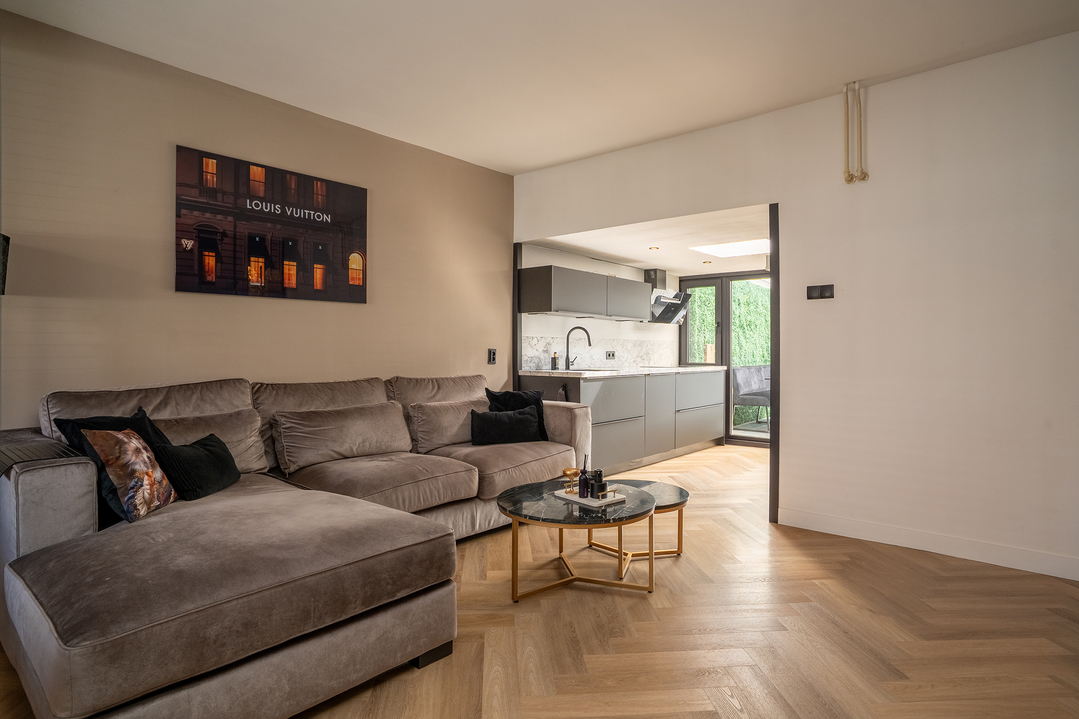 De woonkamer is ruim opgezet en modern afgewerkt, met een warme en stijlvolle uitstraling. De begane grond is voorzien van een visgraatvloer, wat zorgt voor een luxe en eigentijdse uitstraling. De woonkamer biedt voldoende ruimte voor zowel een comfortabele zithoek als een gezellige eethoek.