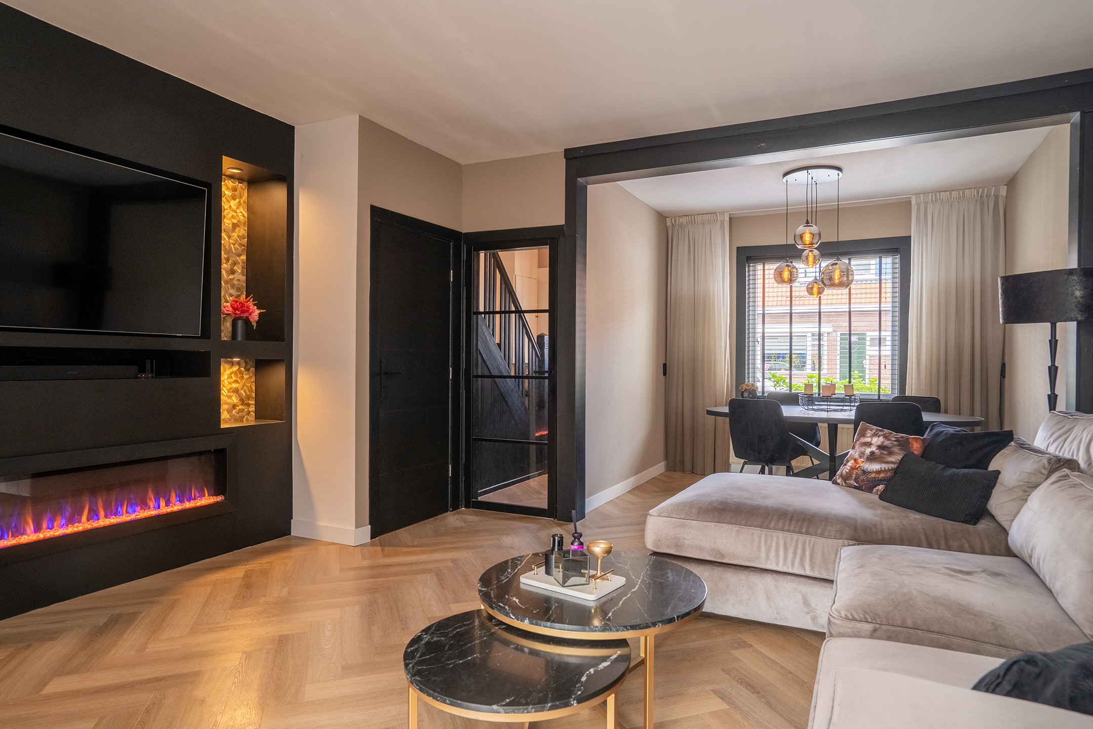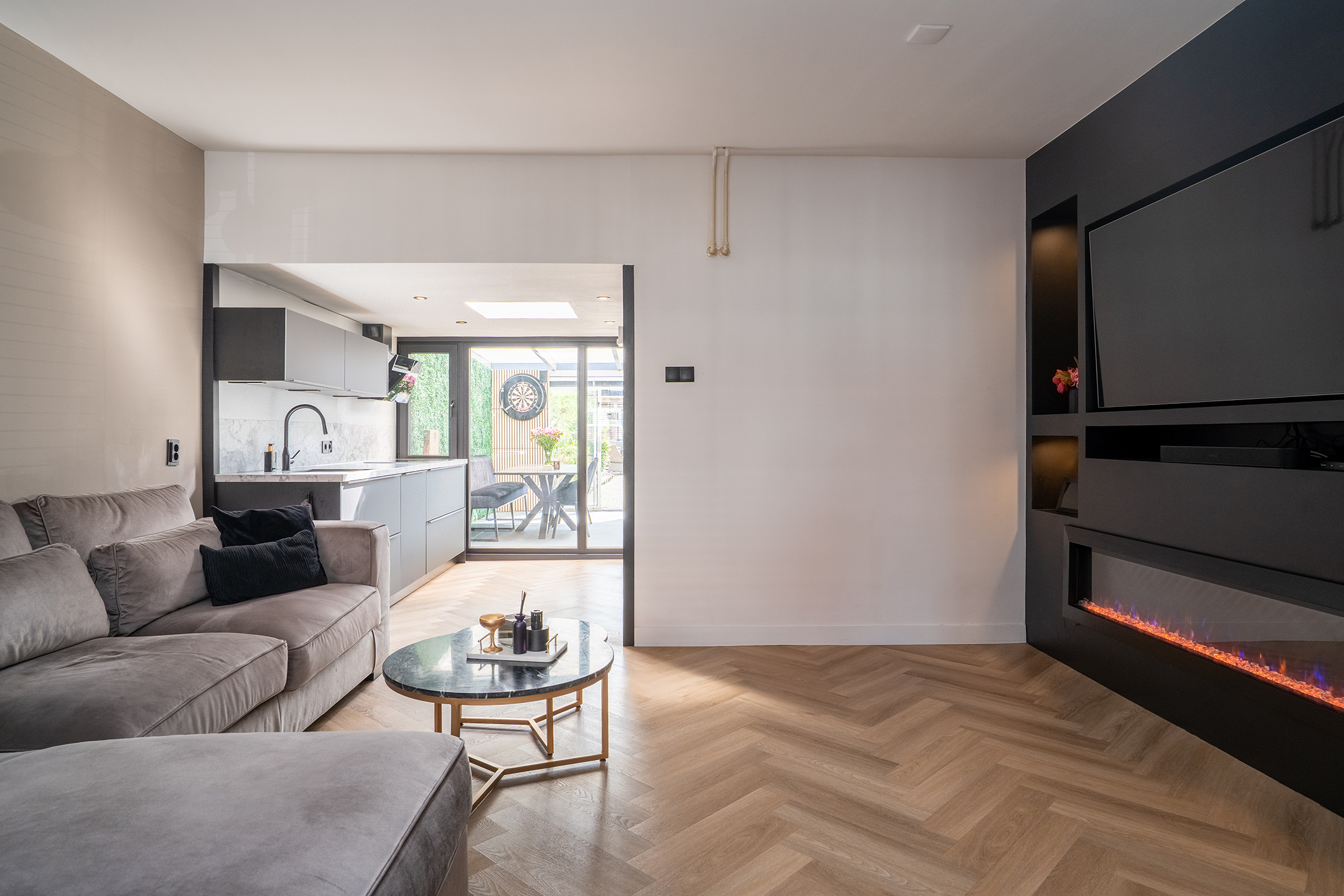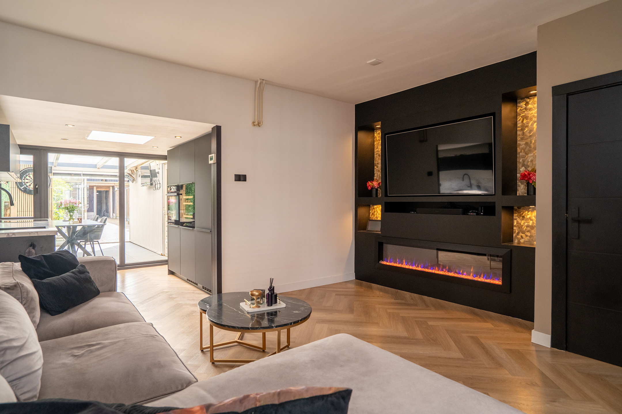 Een echte eyecatcher is de op maat gemaakte wand met elektrische sfeerhaard en tv-meubel, die zorgt voor extra sfeer en comfort.