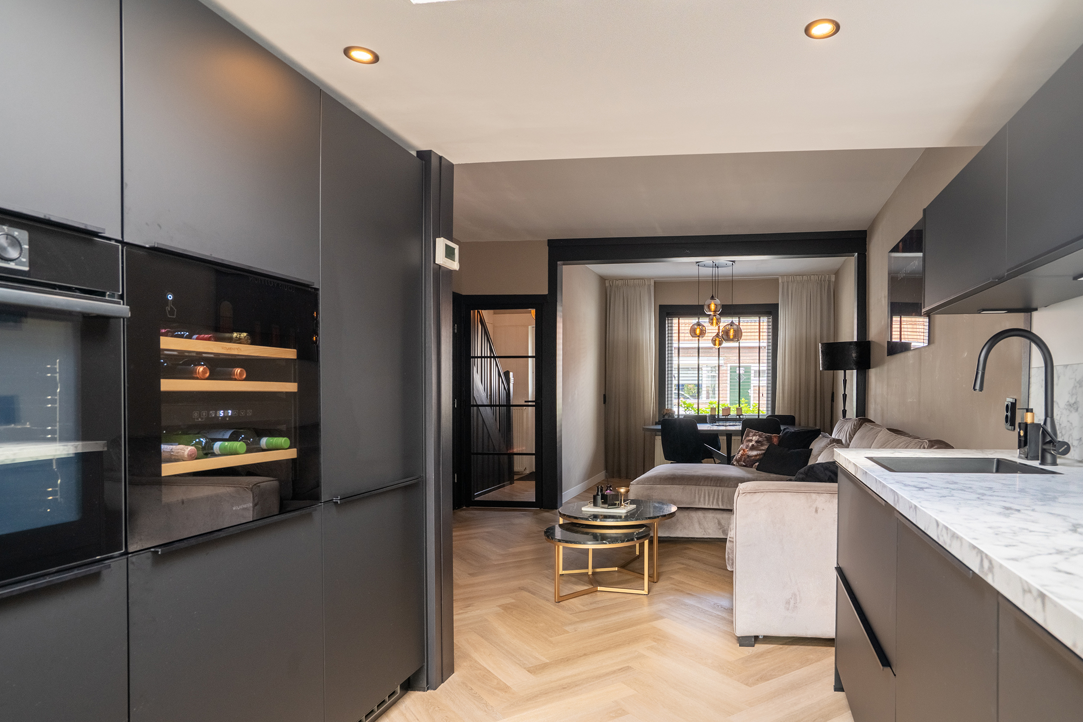 De keuken is voorzien van diverse inbouwapparatuur, waaronder een vaatwasser, kookplaat, wandschouwafzuigkap, koelkast, vriezer, combi-oven en een wijnklimaatkast. Daarmee is het geheel niet alleen stijlvol, maar ook van alle gemakken voorzien.