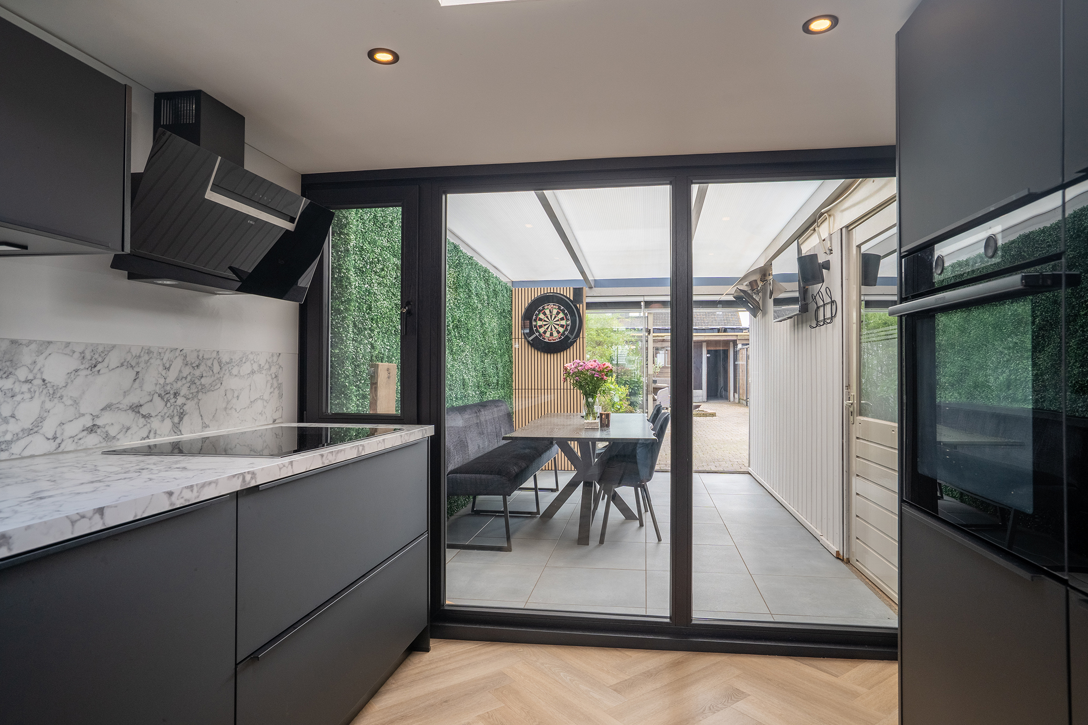 Aan de achterzijde staat de woonkamer in open verbinding met de keuken, wat zorgt voor een ruimtelijk gevoel en een fijne leefomgeving.