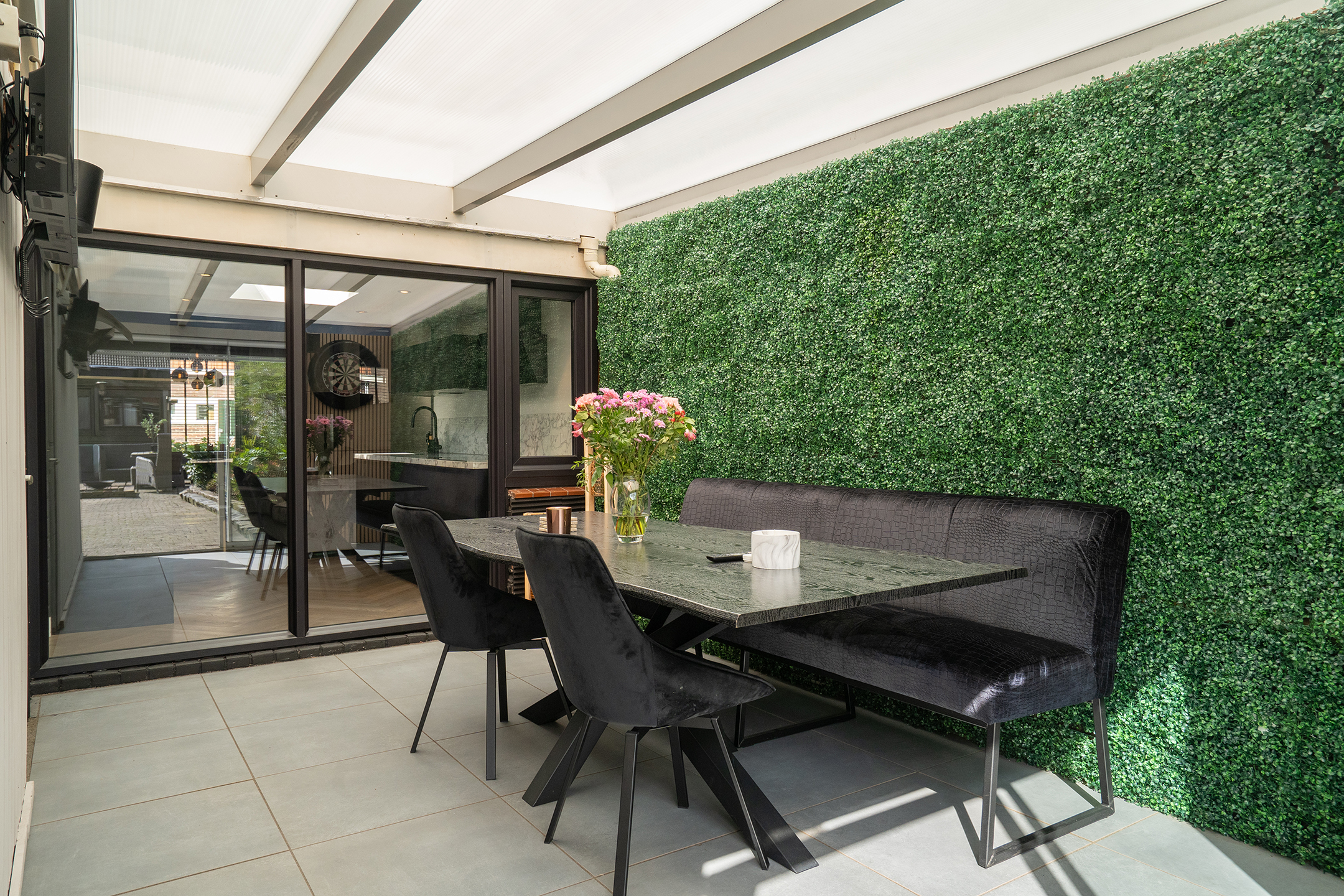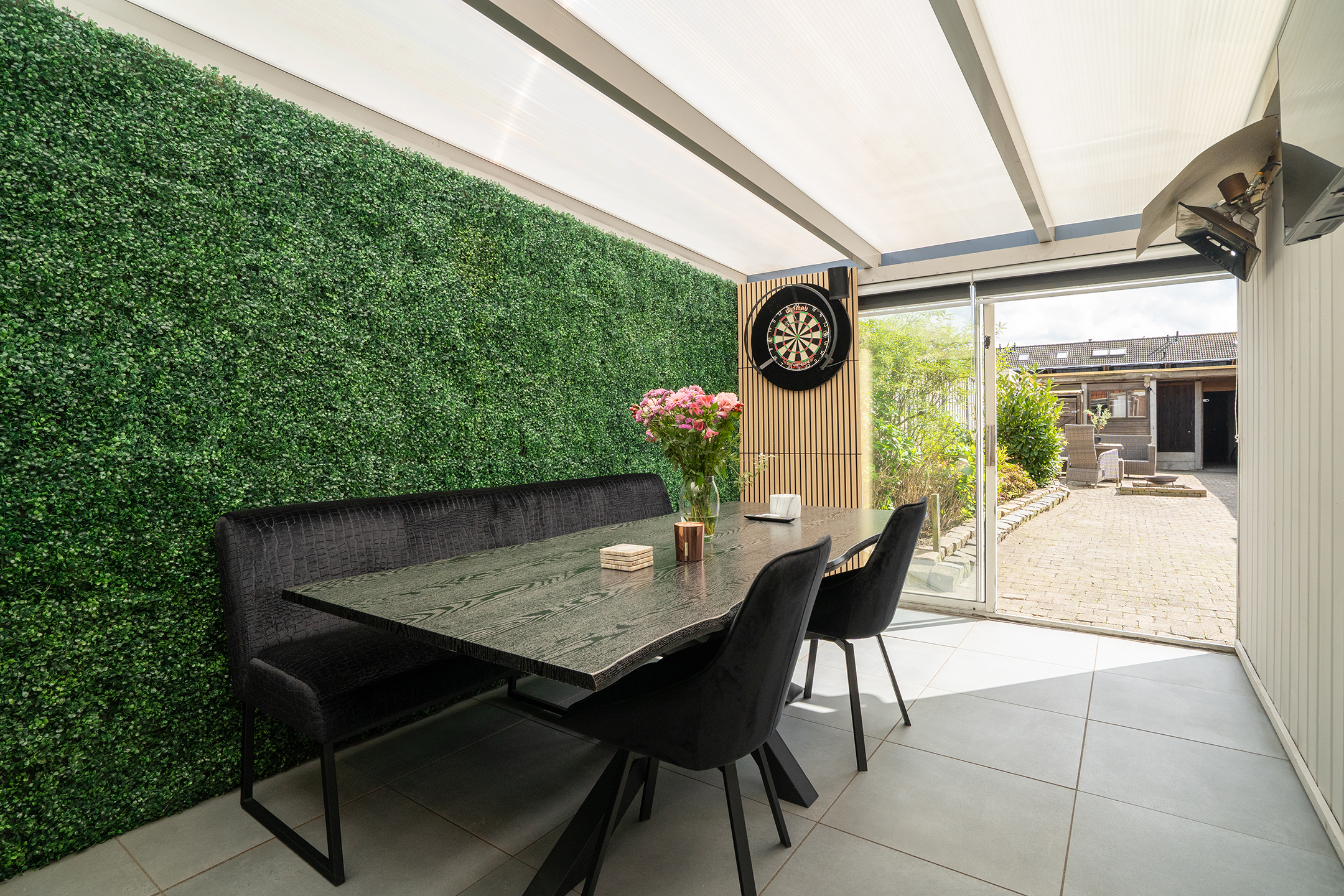 Direct aan de woning bevindt zich een heerlijke, overdekte tuinkamer. Deze is beschut gelegen en vormt een fijne plek om in alle seizoenen te ontspannen of te dineren.