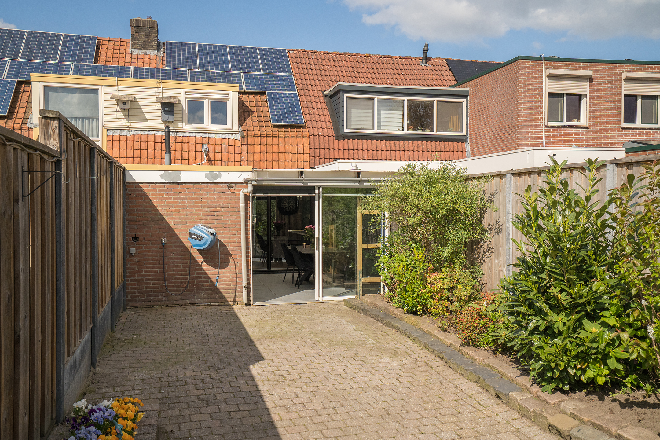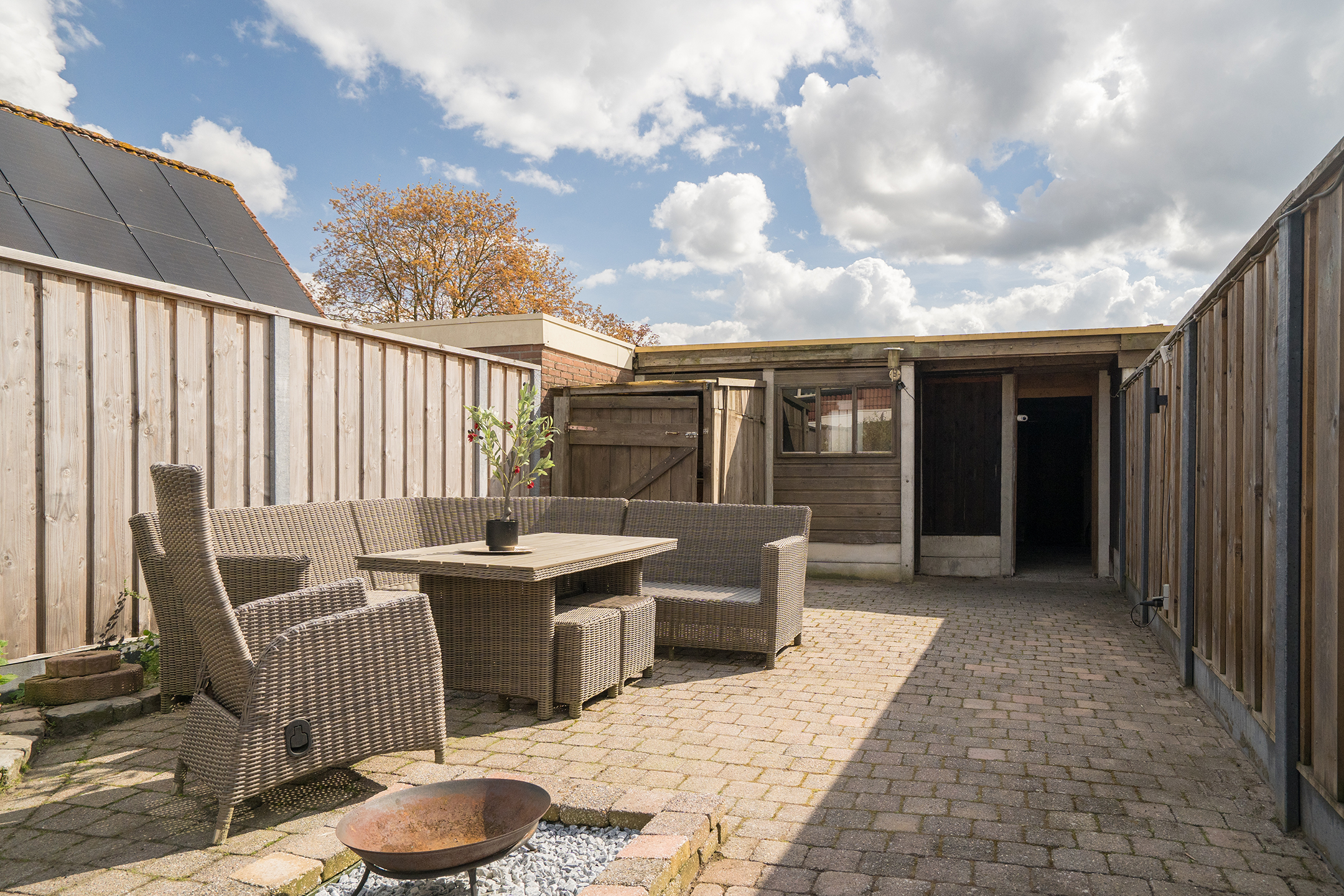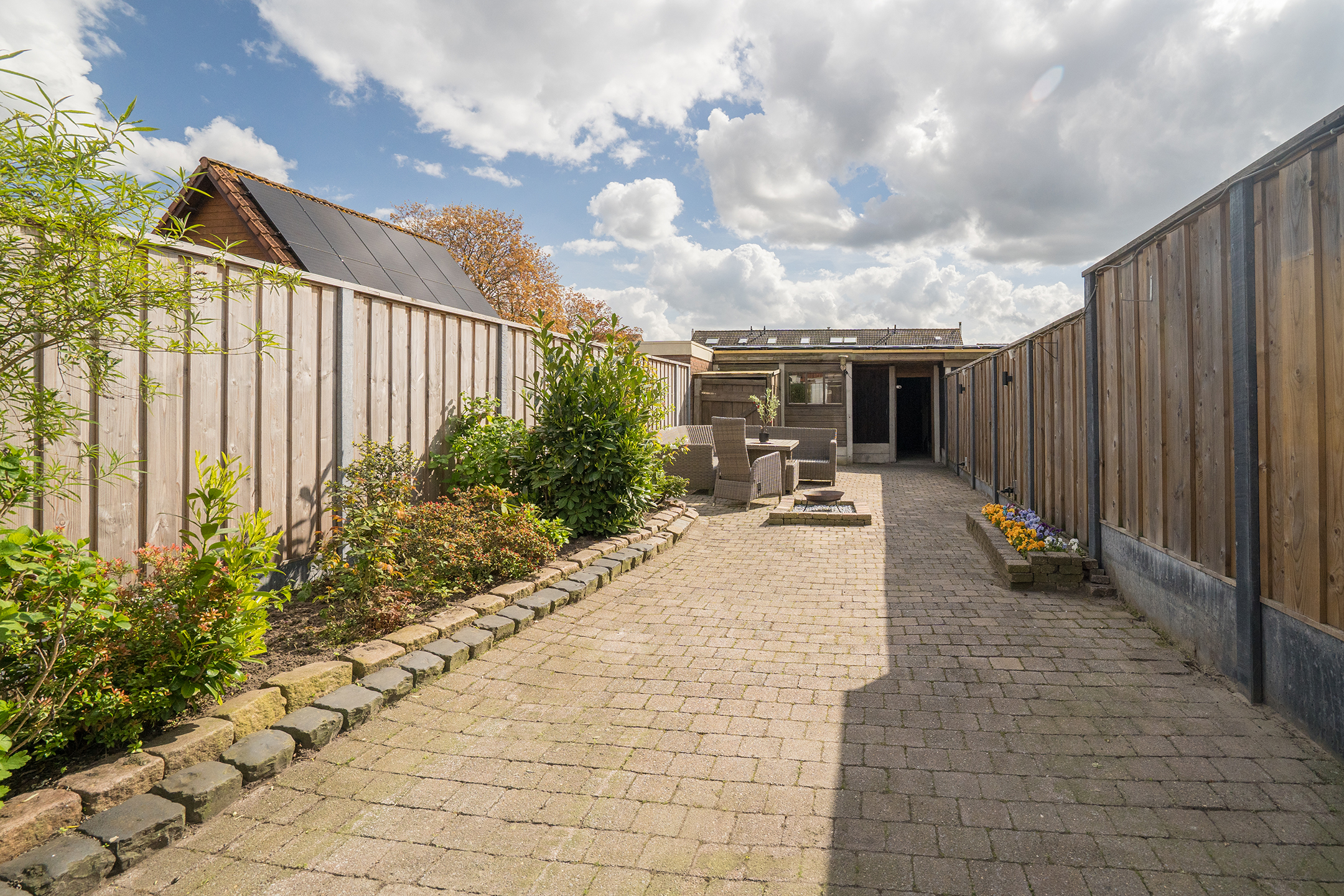 De tuin is grotendeels bestraat en daardoor onderhoudsarm, met daarnaast ruimte voor groen en meerdere zitplekken. Achterin de tuin bevinden zich meerdere bergingen, ideaal voor extra opslag of hobbyruimte.