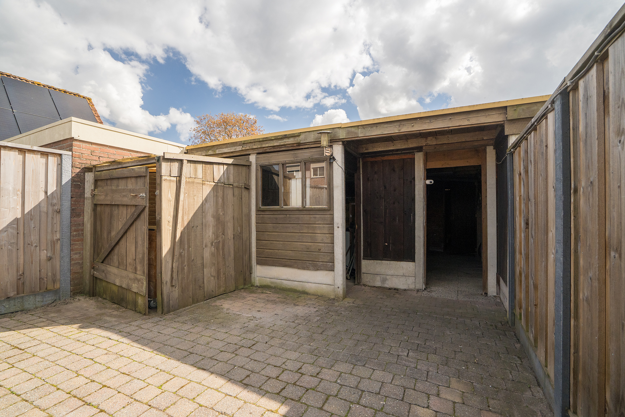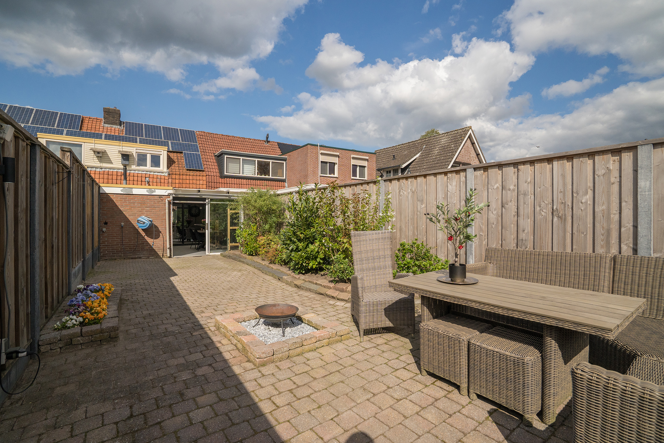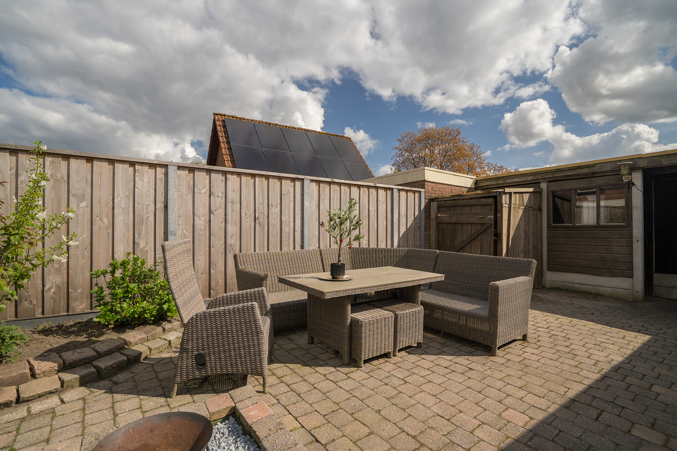 De tuin is grotendeels bestraat en daardoor onderhoudsarm, met daarnaast ruimte voor groen en meerdere zitplekken. Achterin de tuin bevinden zich meerdere bergingen, ideaal voor extra opslag of hobbyruimte.