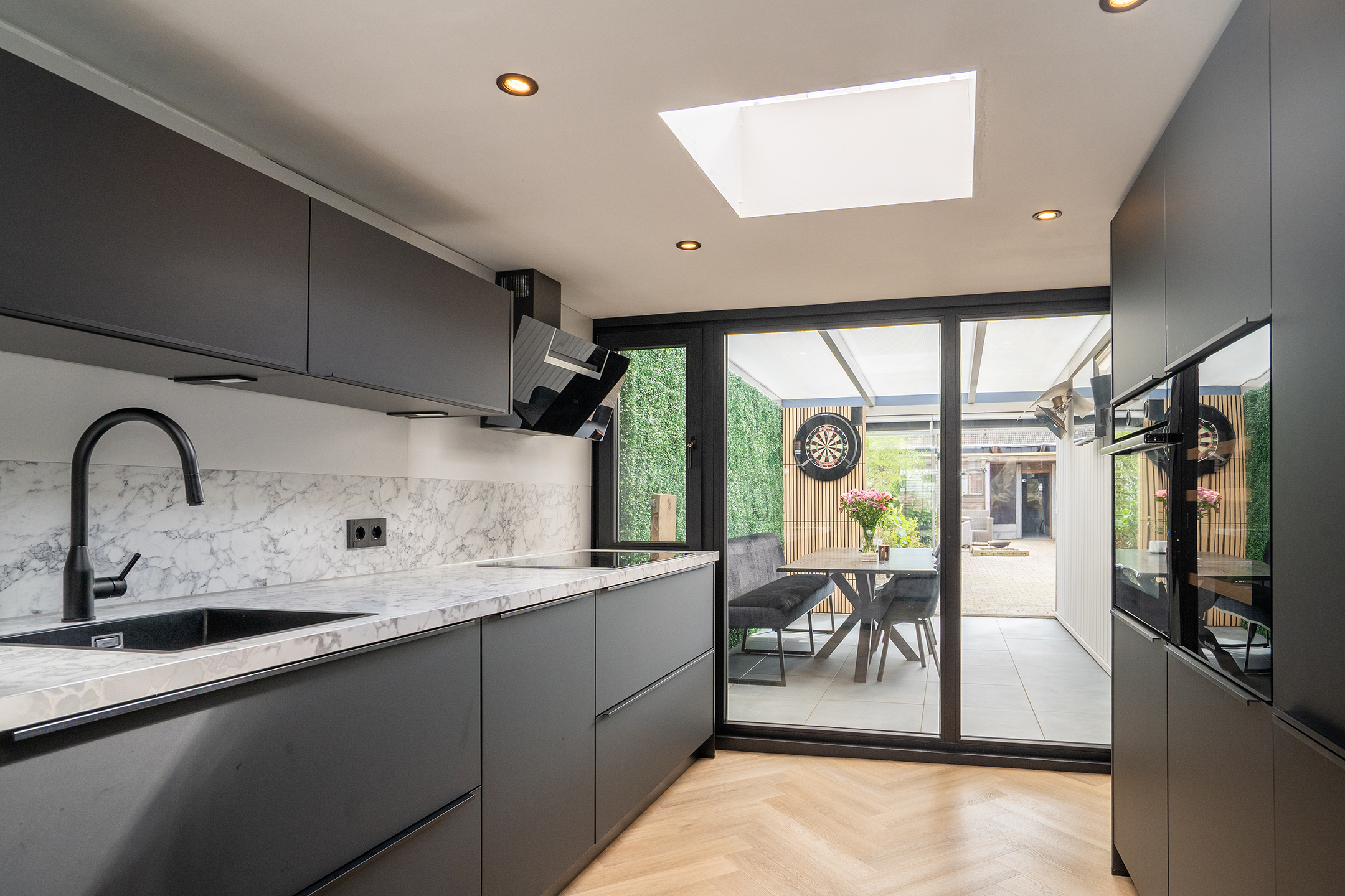 De moderne keuken, gerealiseerd in 2023, kenmerkt zich door de strakke uitstraling.