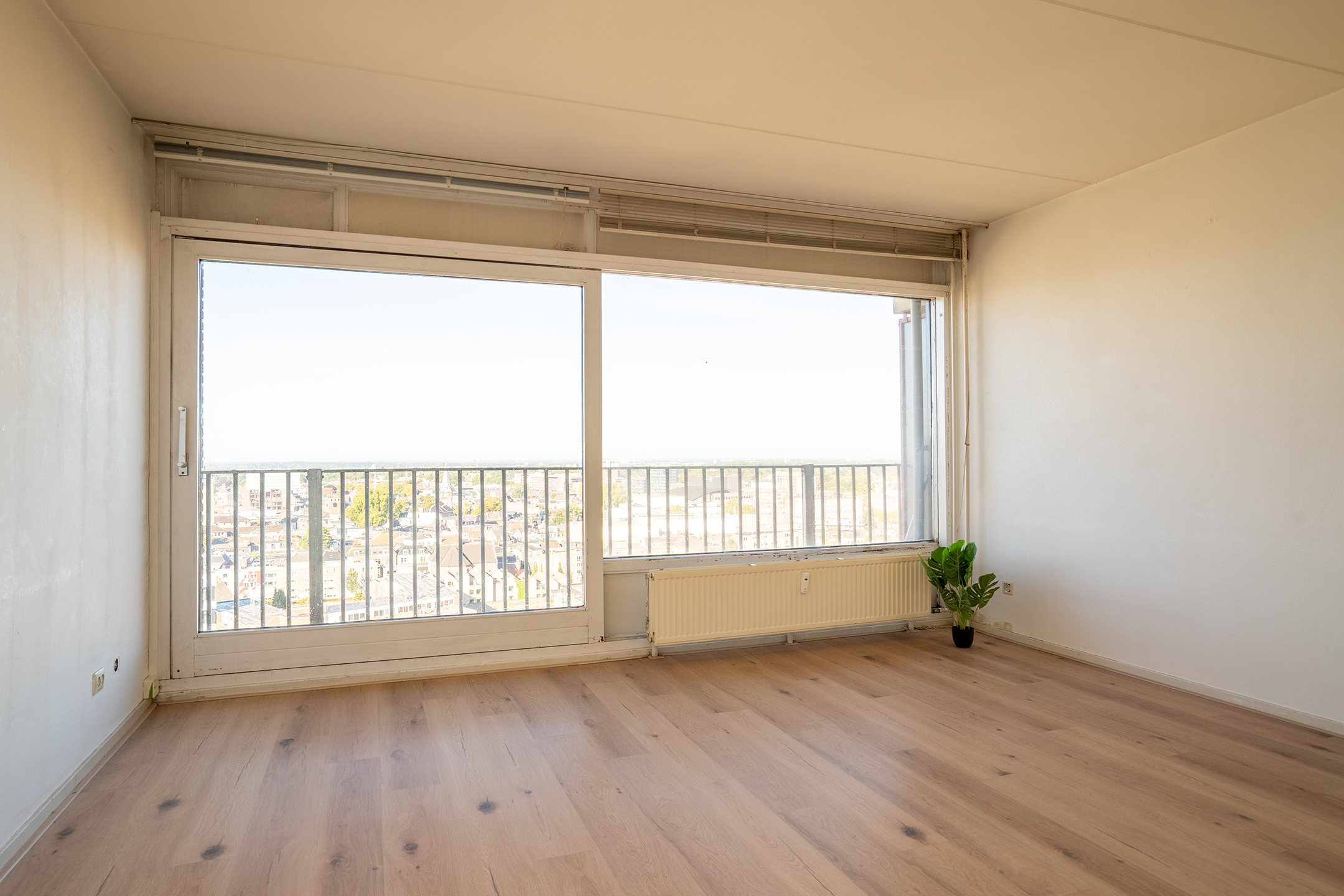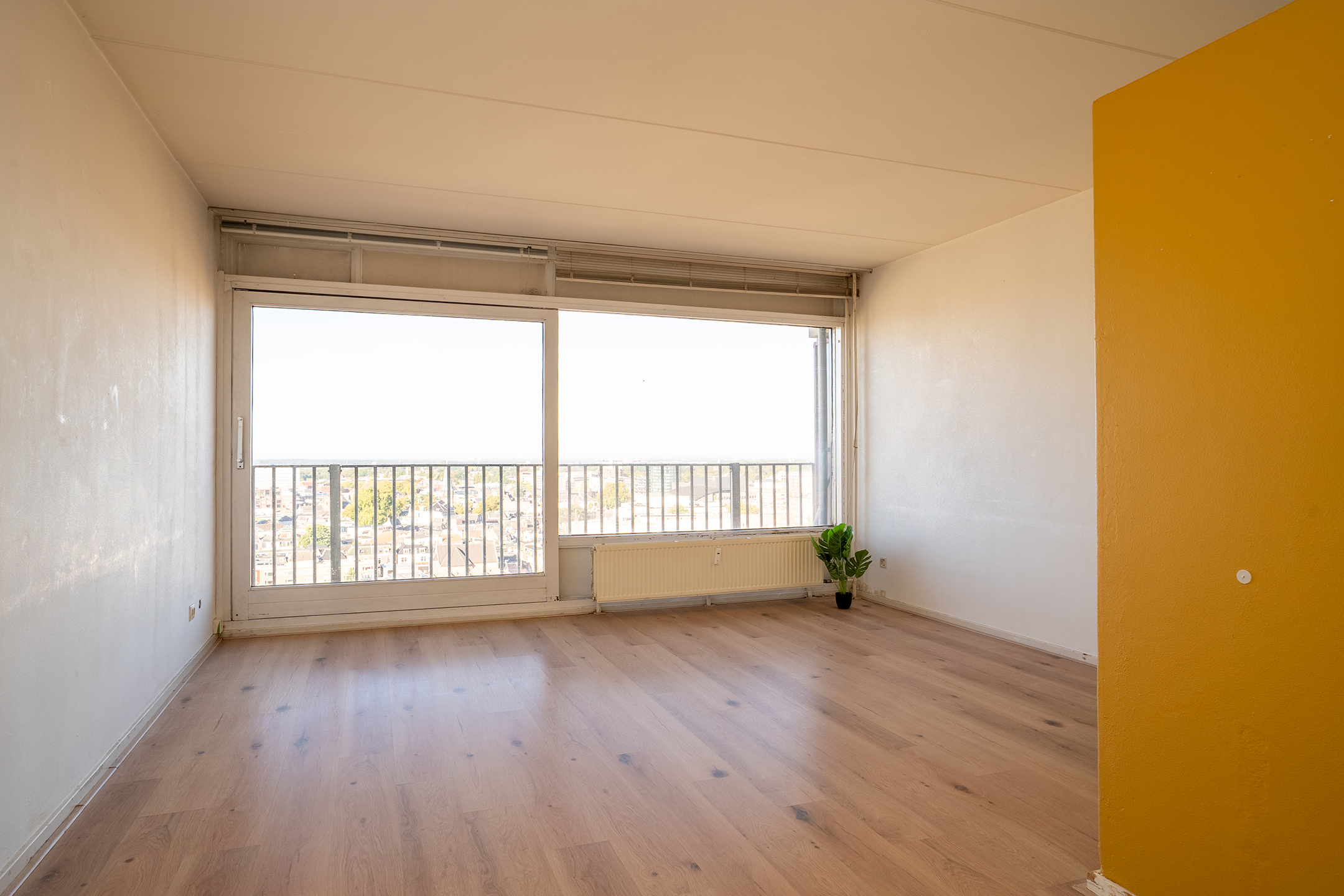 Indeling van de woning: Op de begane grond kom je binnen via de algemene entree met brievenbussen, trapopgang en de lift naar de verschillende verdiepingen. Wij gaan naar de 16e verdieping! Via de voordeur kom je binnen in de hal met toegang tot alle ruimtes. Aan je rechterhand is eerst de slaapkamer en vervolgens de badkamer. Aan het einde van de gang kom je binnen in de woonkamer met laminaatvloer, waarbij je direct het prachtige uitzicht over de stad te zien krijgt.