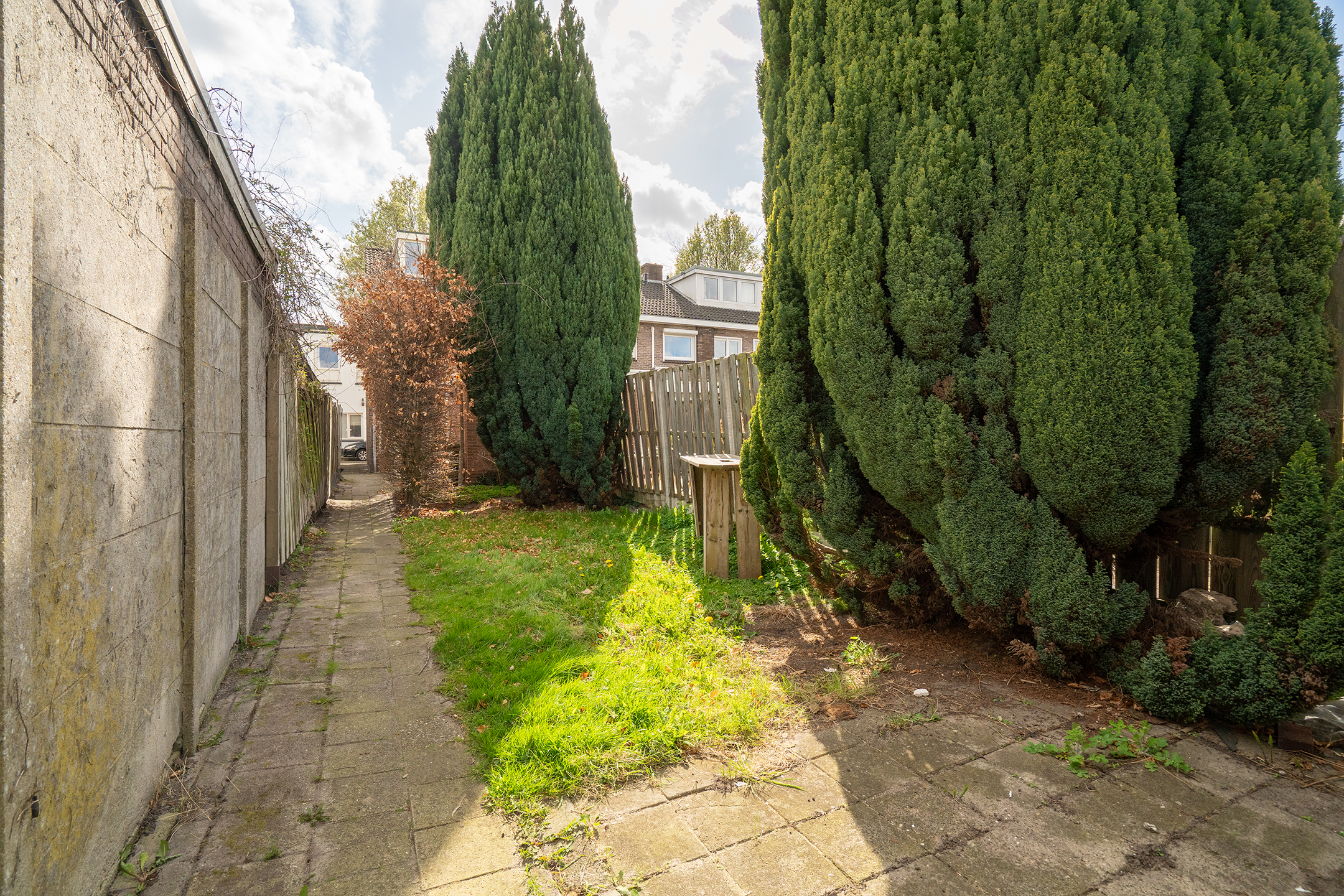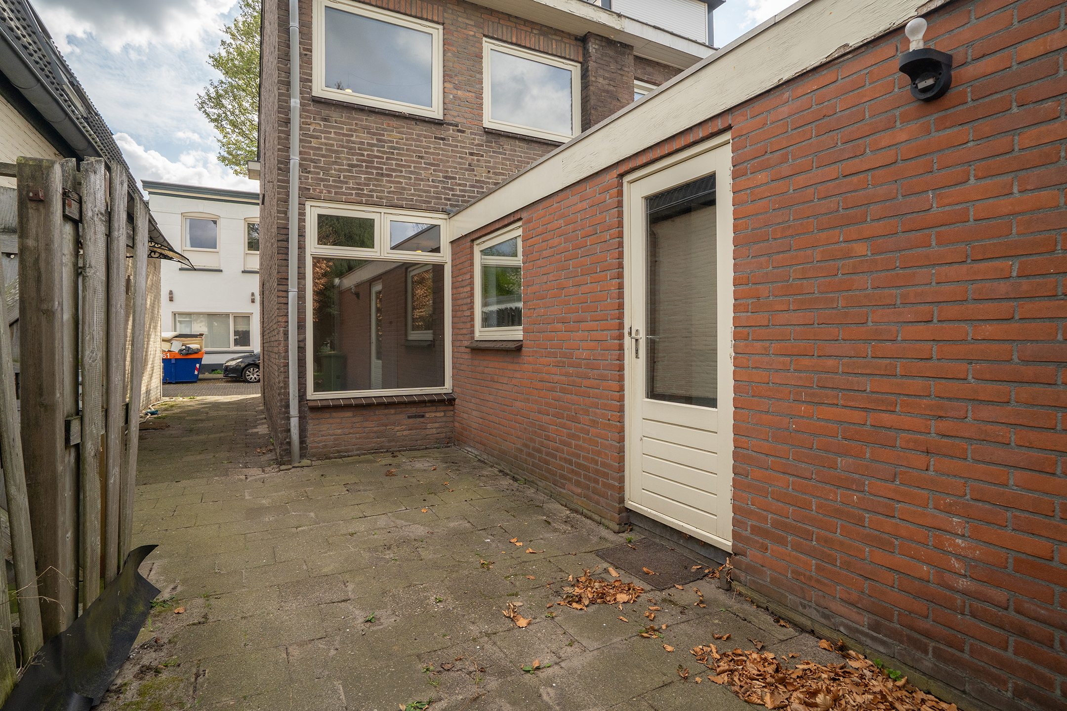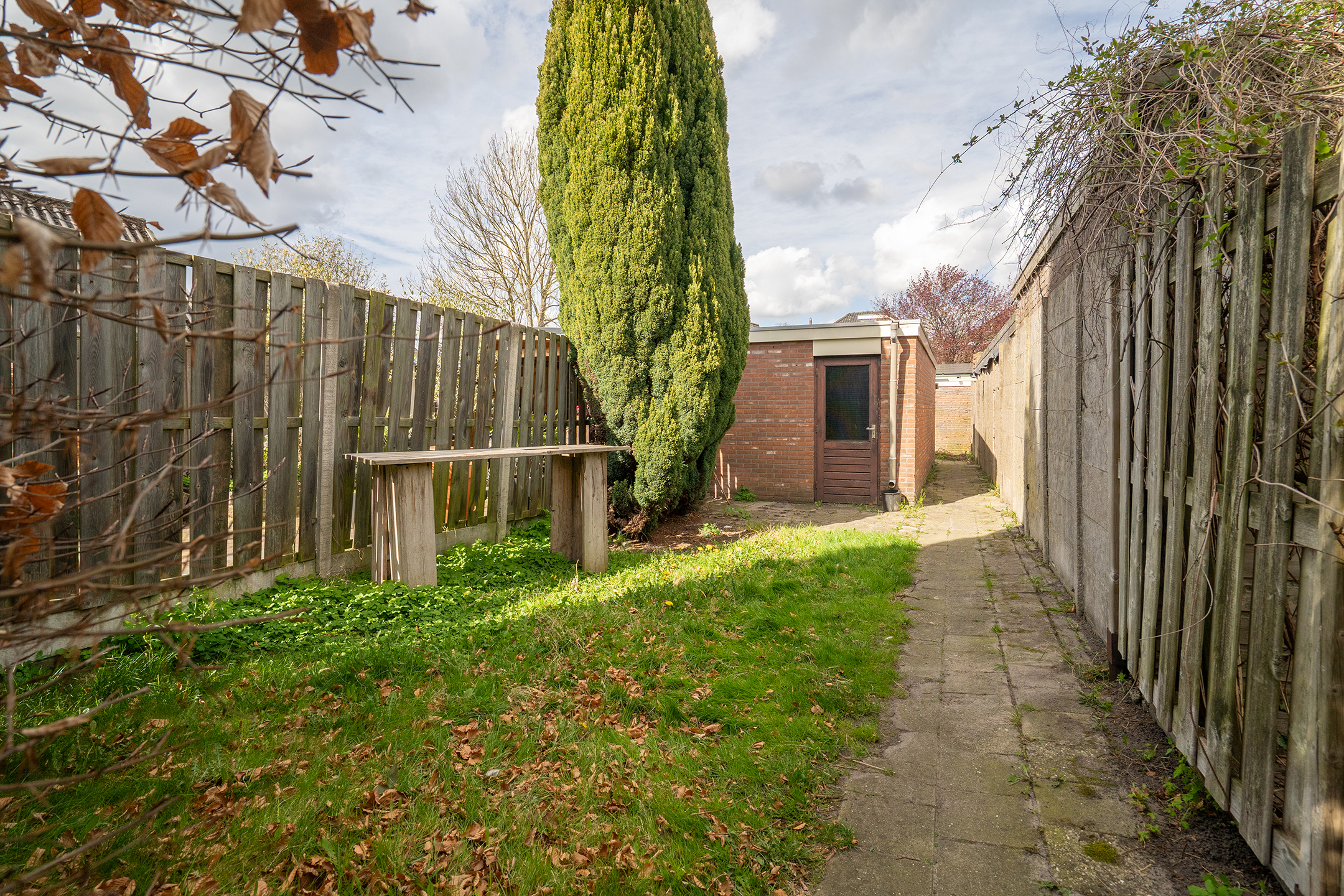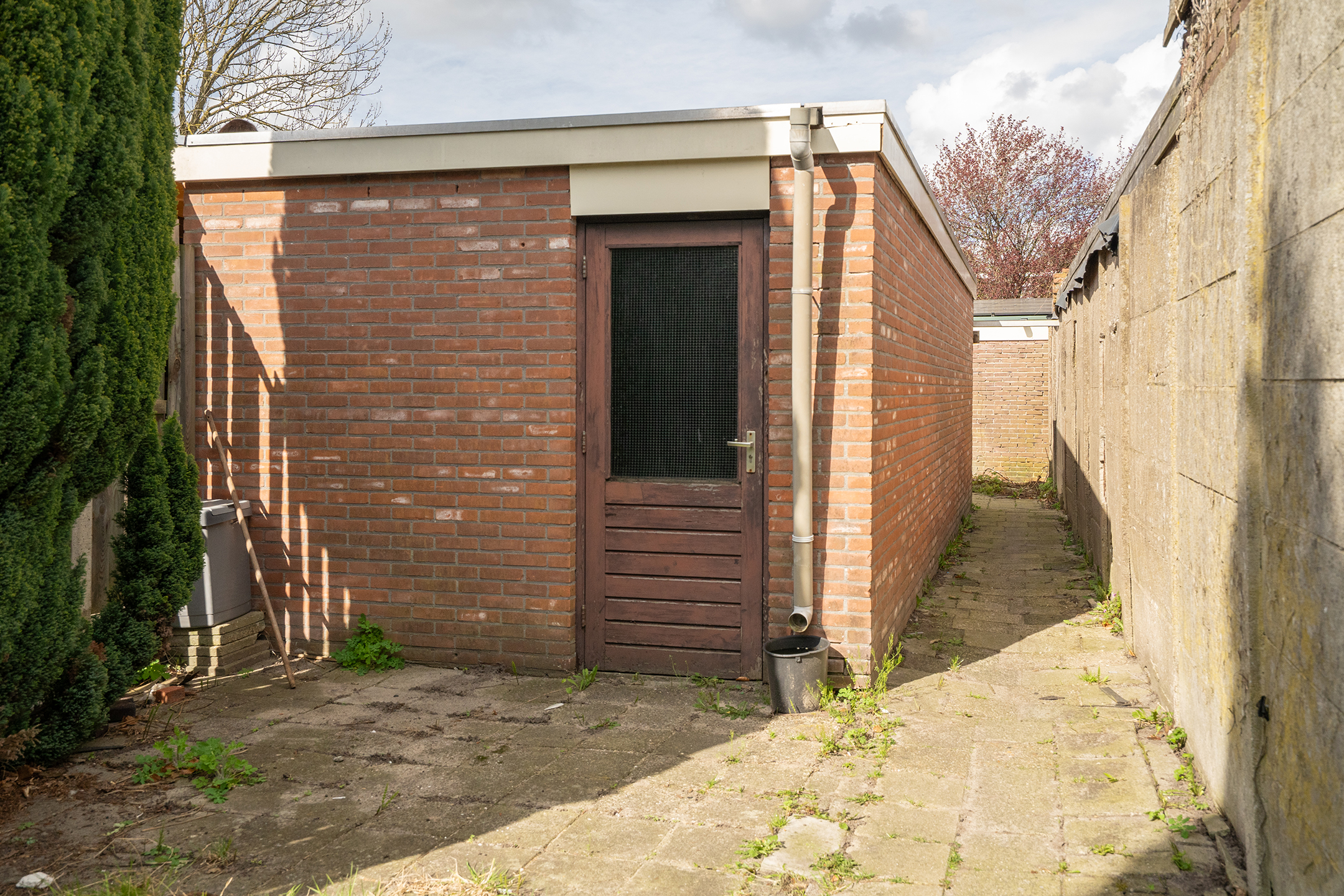 Buitenruimte: De achtertuin is diep en biedt veel privacy. Achterin staat een vrijstaande berging. Ideaal voor hobbyisten of extra opslag.