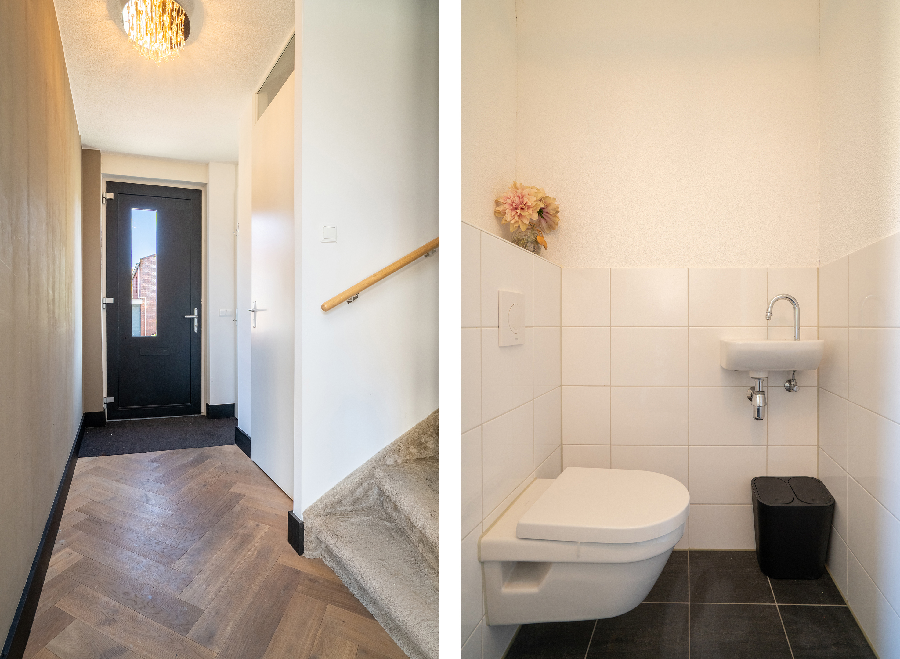 In de hal ligt een visgraatvloer. Hier bevinden zich de garderobe, het hangtoilet met fontein en de trapopgang met vloerbedekking naar de eerste verdieping.