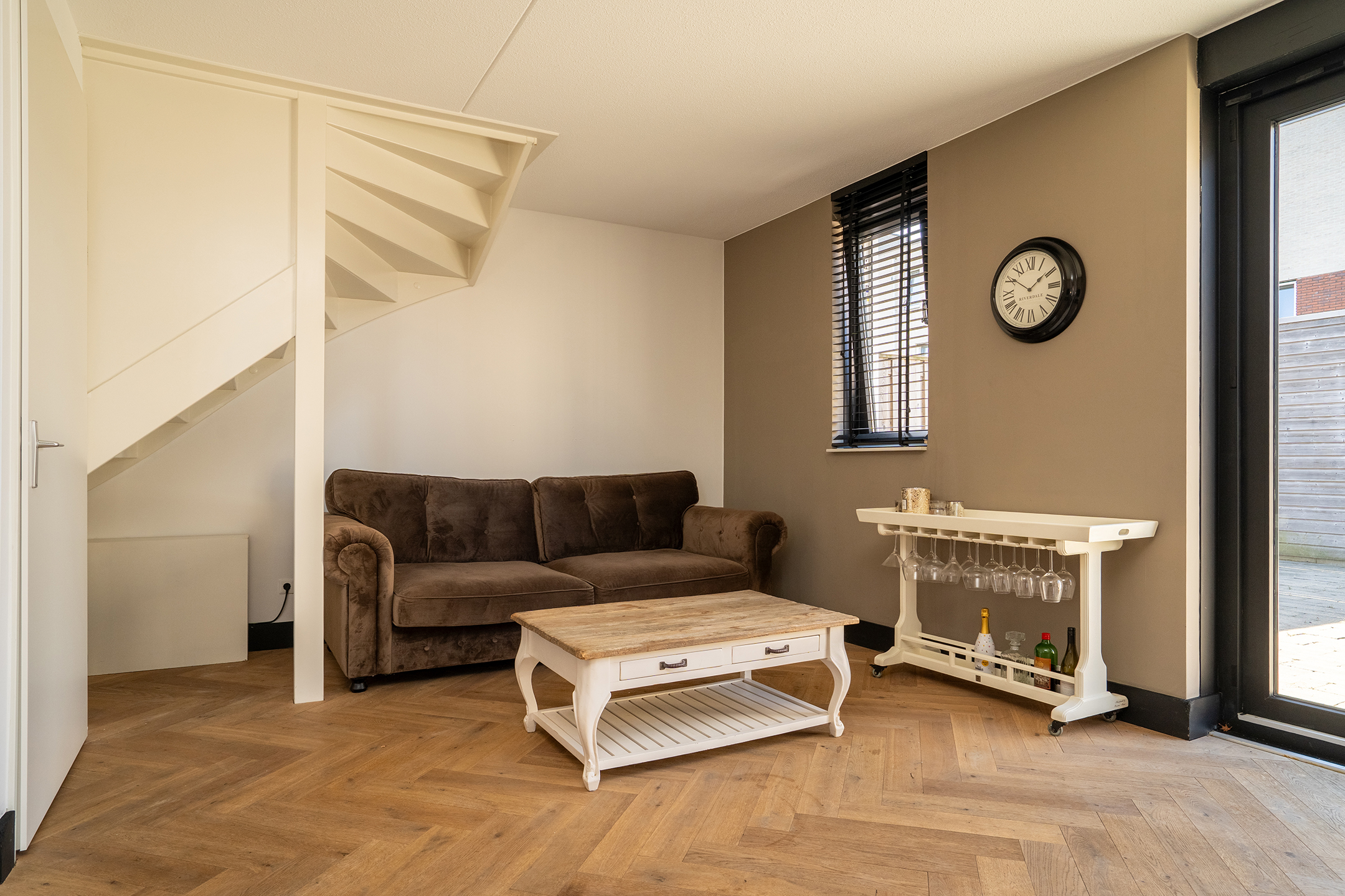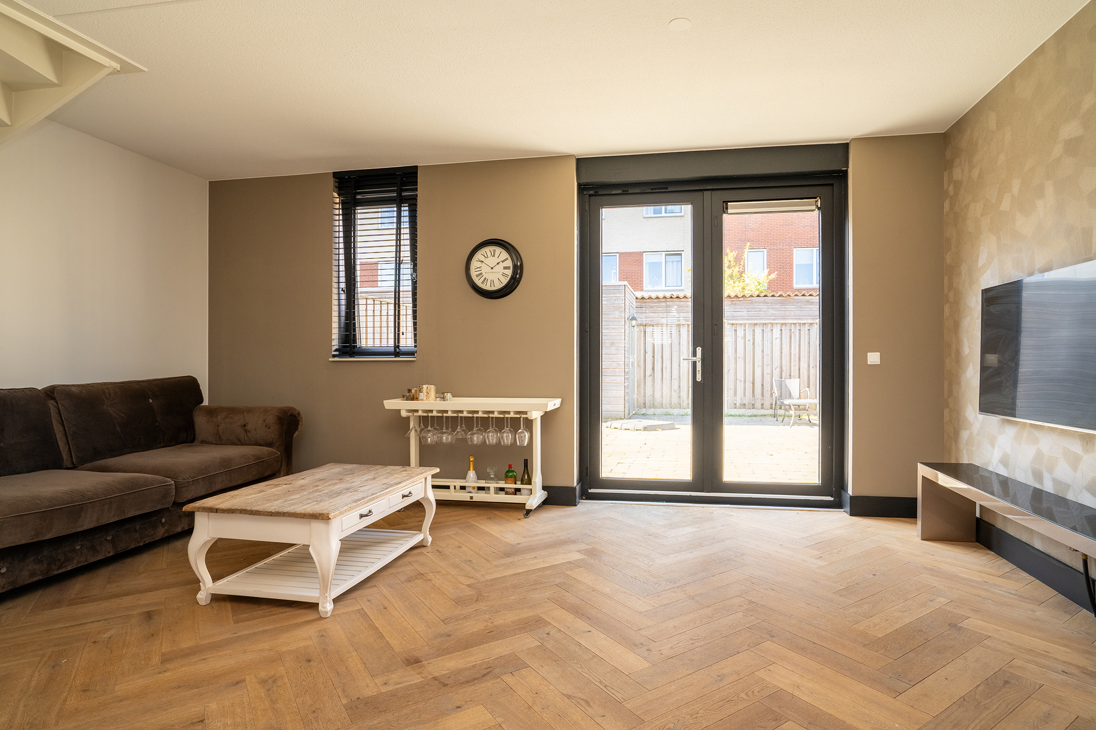 Vanuit de hal kom je in de lichte woonkamer. Dankzij de openslaande tuindeuren geniet je hier de hele dag van veel natuurlijk licht. De woonkamer biedt voldoende ruimte voor zowel een zit- als eethoek en is, net als de hal, afgewerkt met een visgraatvloer.