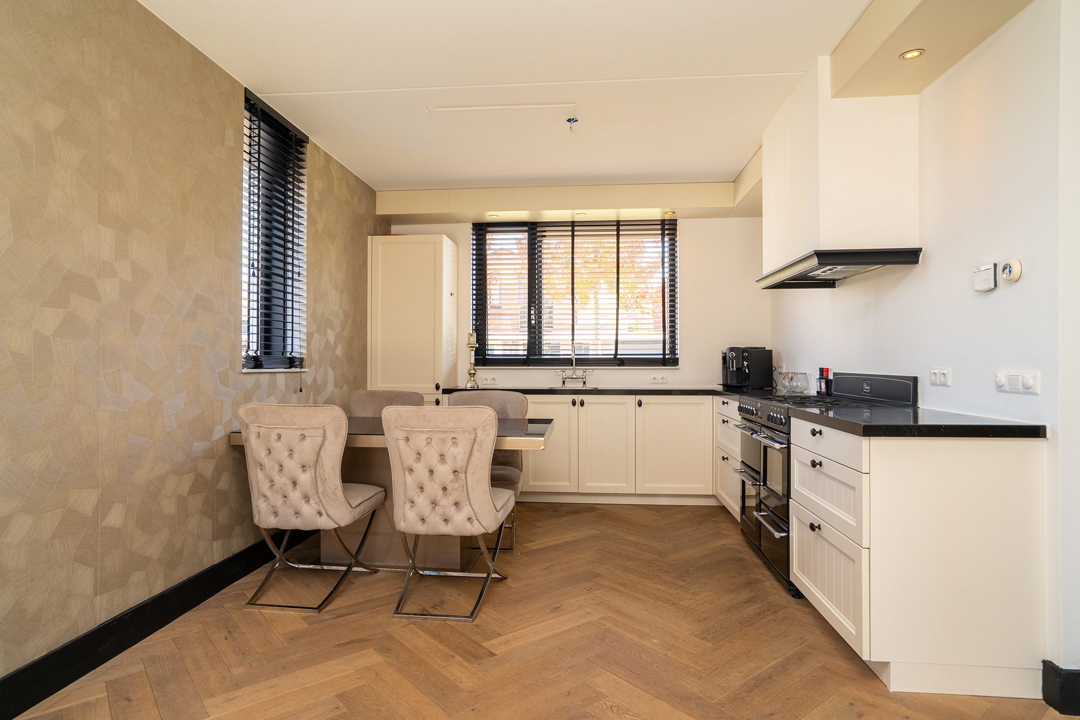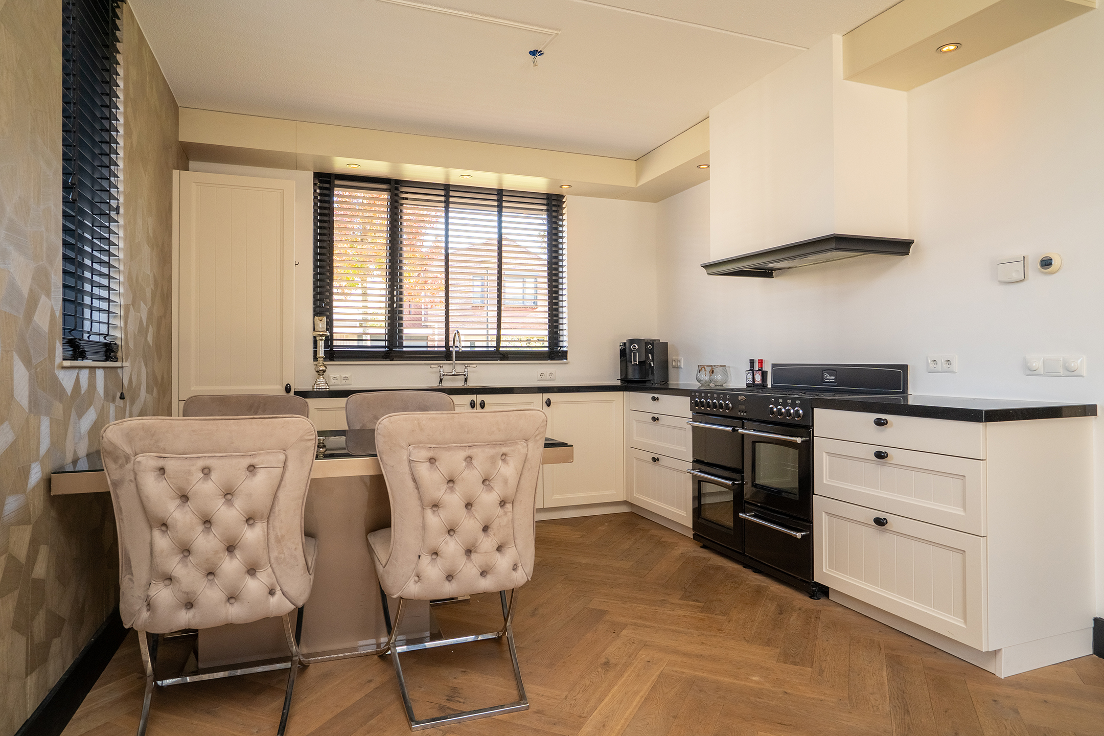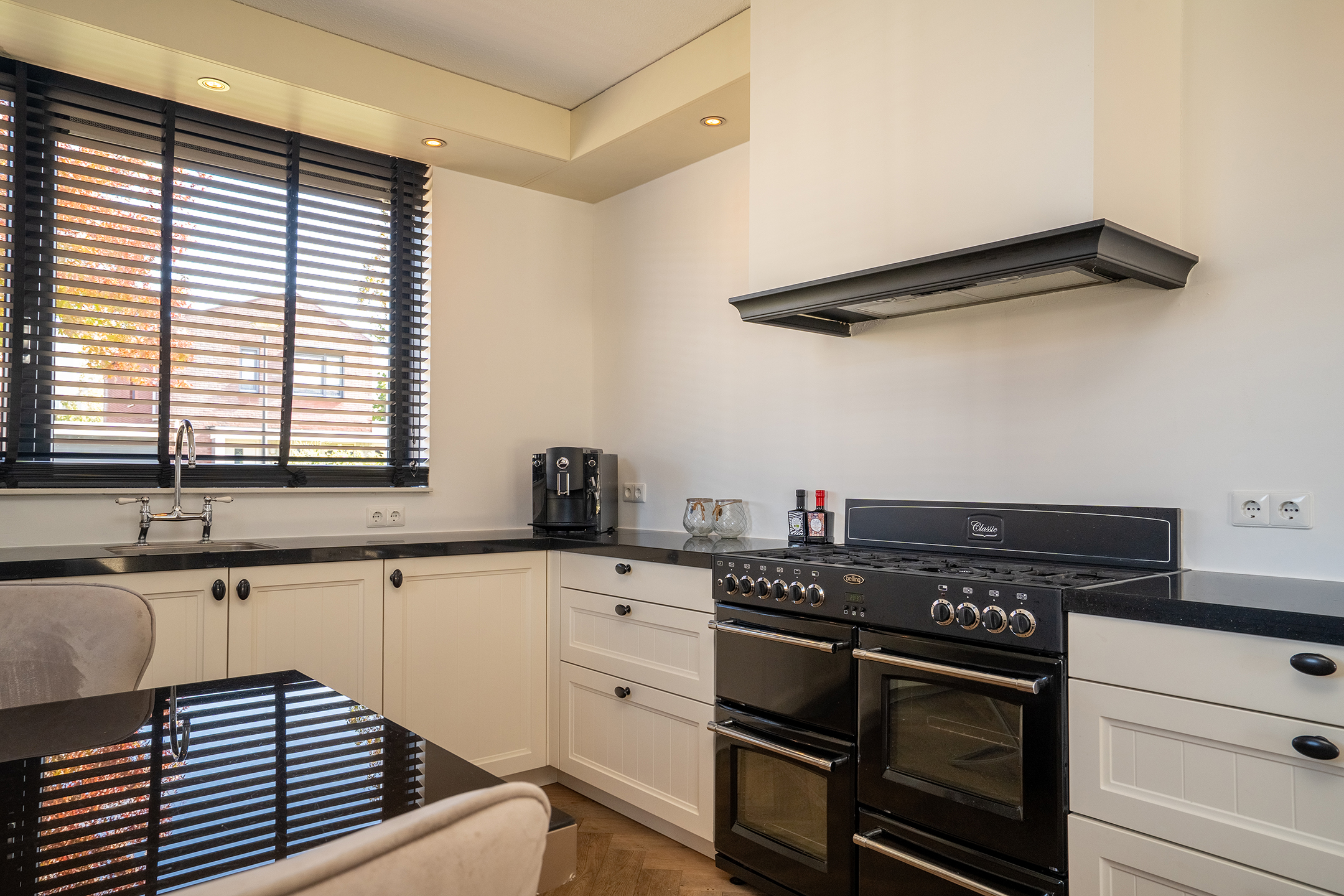 Aan de voorzijde van de woning bevindt zich de keuken. Deze is praktisch ingedeeld en uitgerust met diverse inbouwapparatuur, waaronder een breed gasfornuis met dubbele oven, afzuigkap, vaatwasser en koelkast.