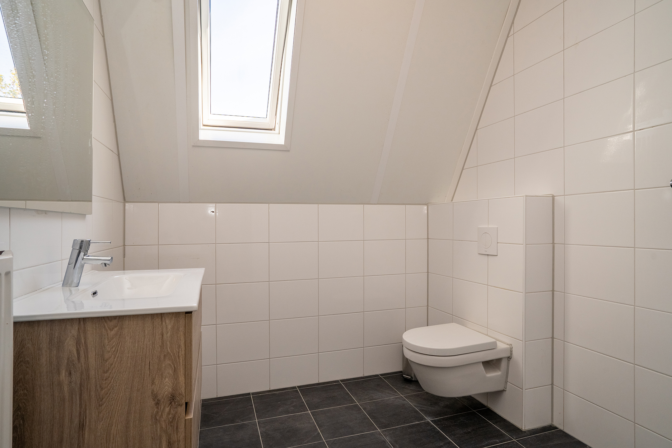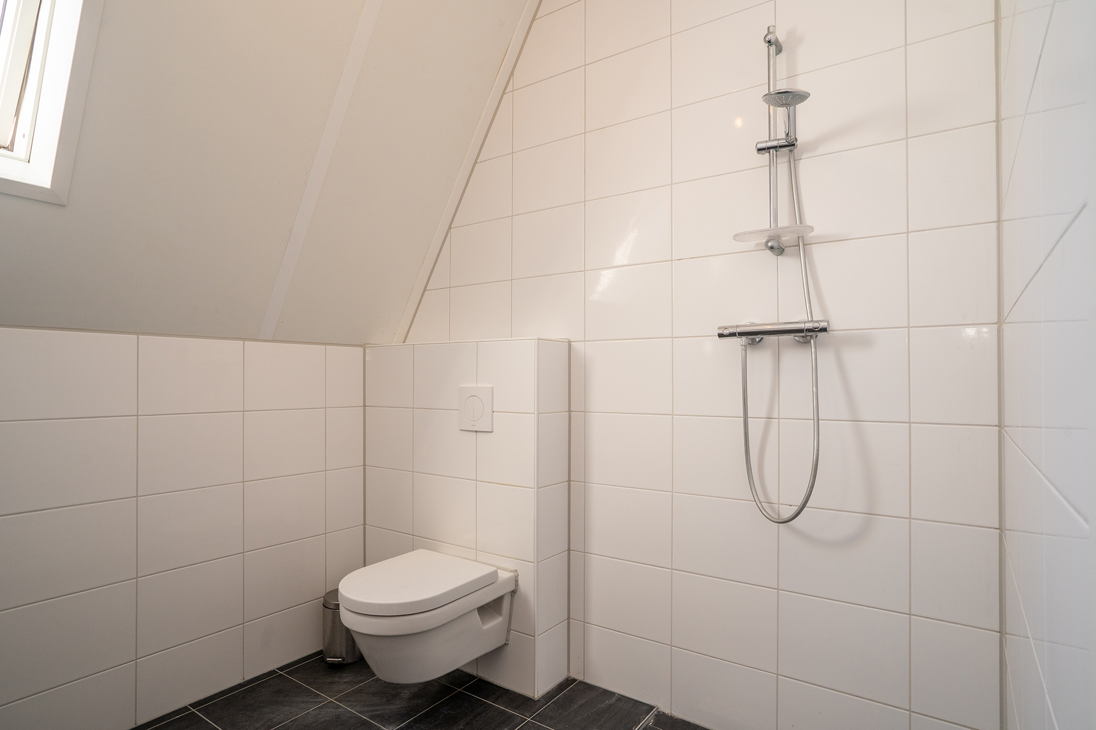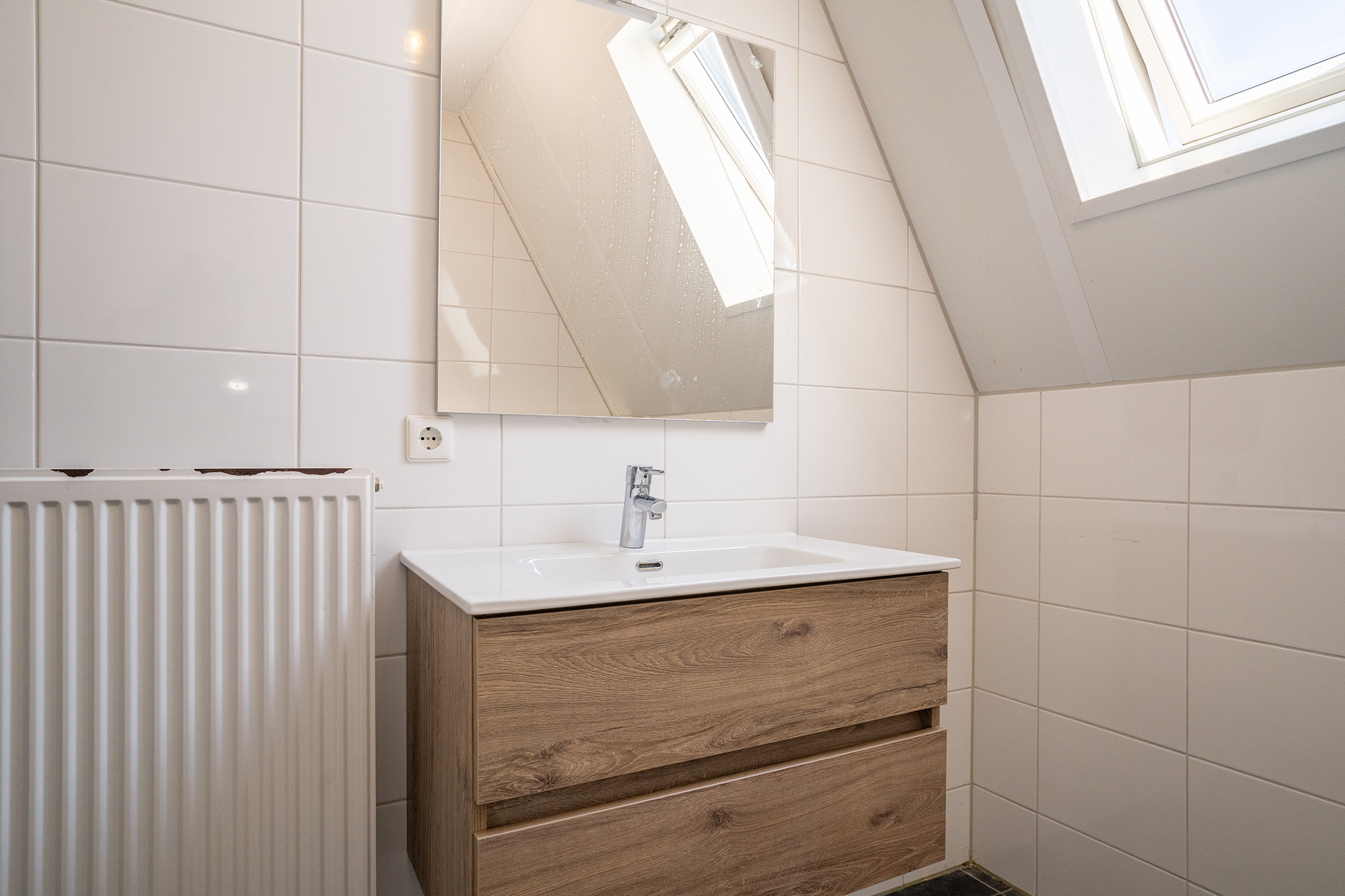 De geheel betegelde badkamer is praktisch ingedeeld en voorzien van een douche, een wastafelmeubel met opbergruimte, een spiegel en een toilet. Dankzij het raam bij de douche geniet de ruimte van fijn daglicht en natuurlijke ventilatie.